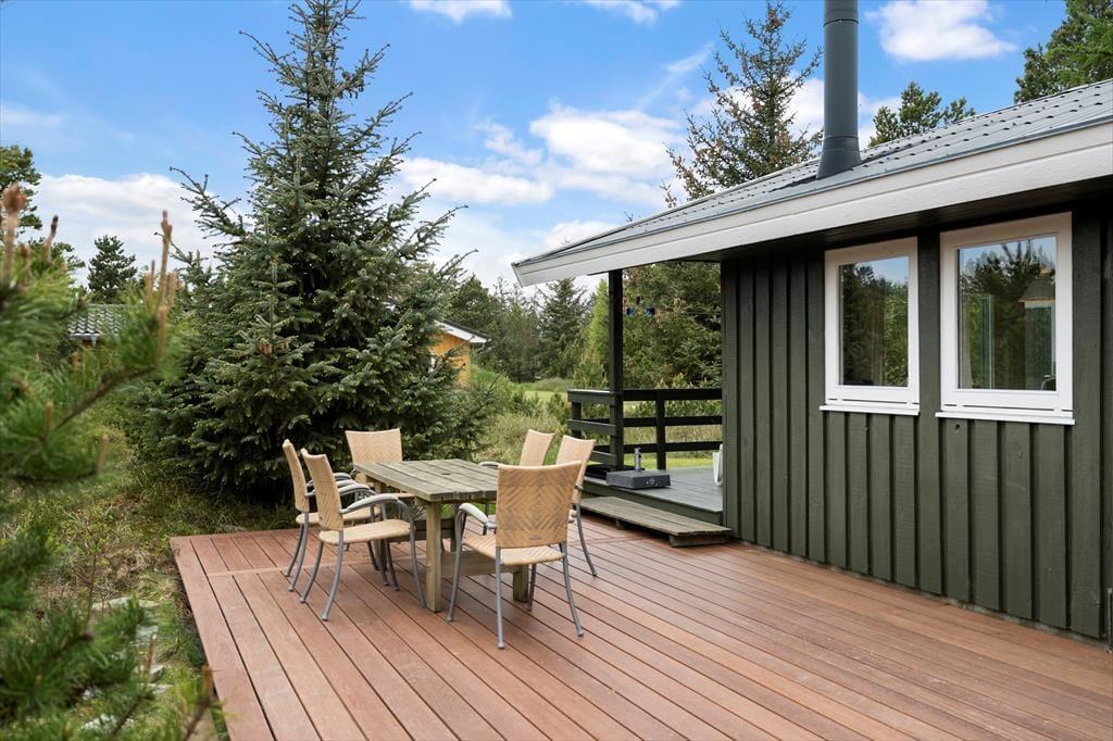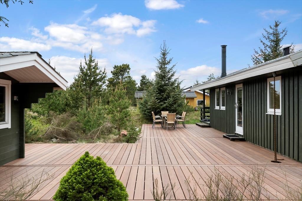Sommerhuset ligger på en grund med masser af natur; træer, buske, lyng og marehalm i en skøn og charmerende blanding. Fra stuen kan man åbne op til en delvist overdækket og afskærmet terrasse, mens der også mellem hovedhuset og annekset er et stort terrasseareal, hvor det er godt at slikke sol og lave lækre grillmåltider.