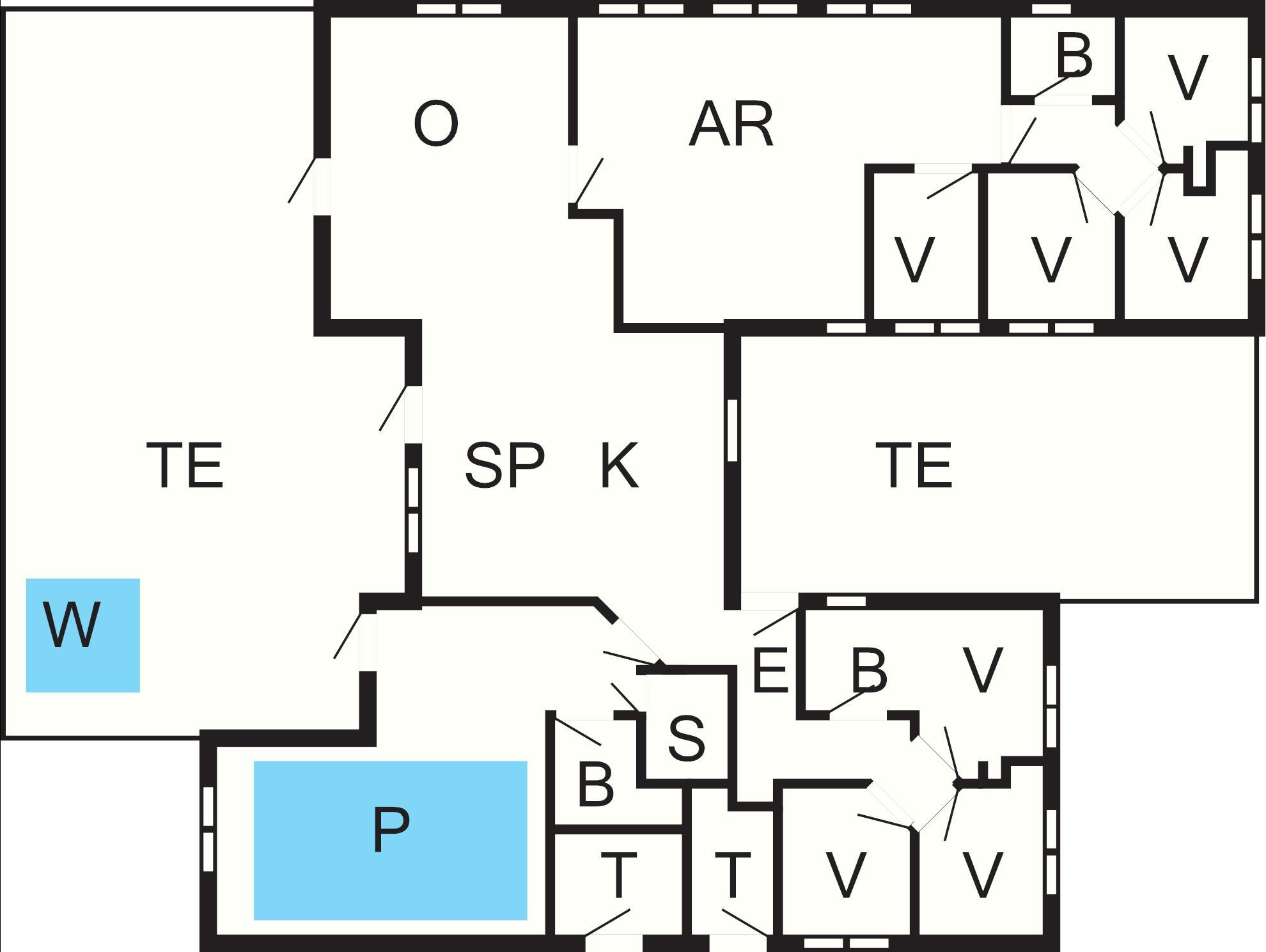 7 Soveværelser: (1DS)+(1DS)+(2S)+(2S)+(2S)+(2S)+(2S), barneseng
