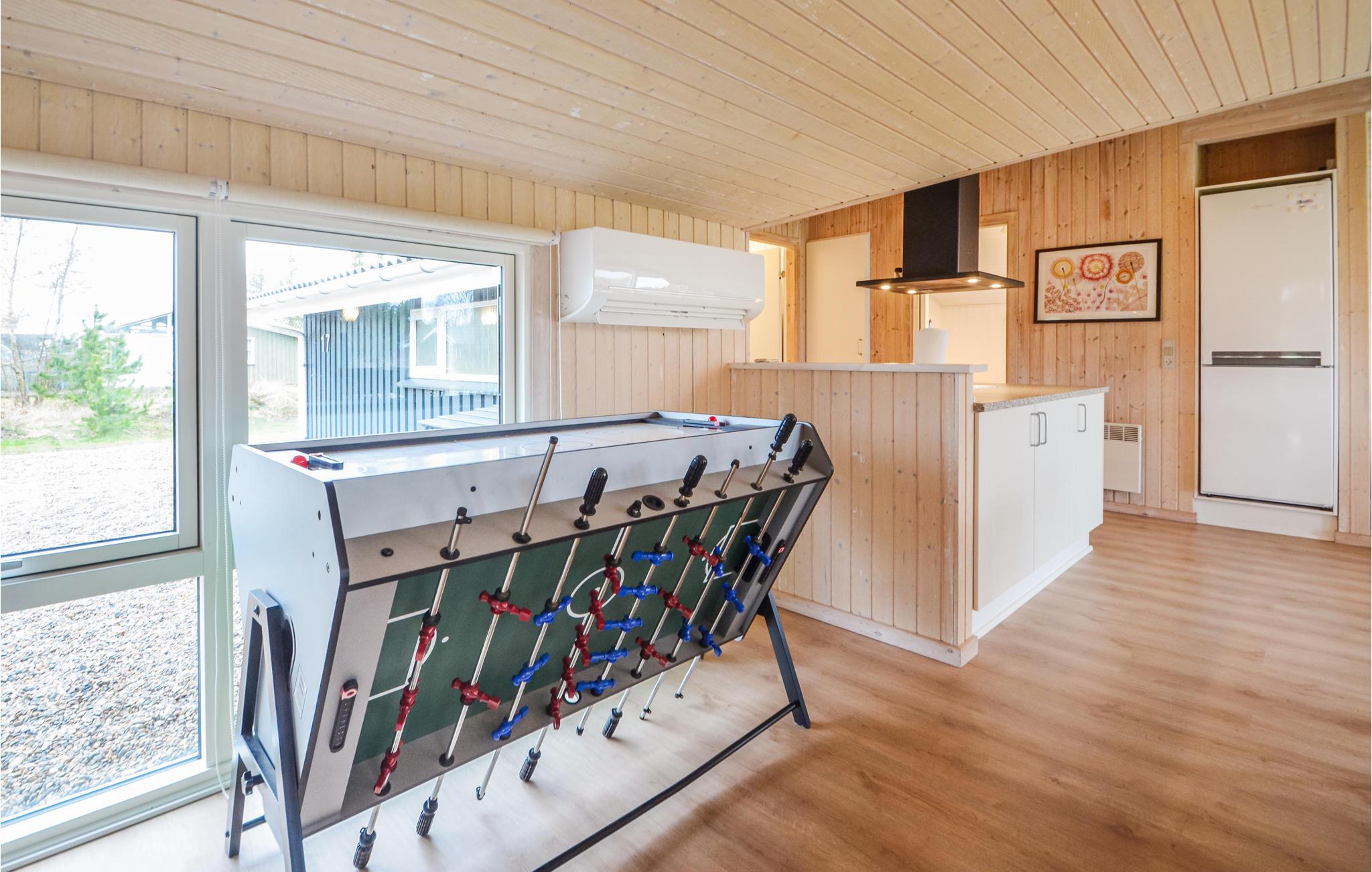 Her får I lyse rum med højt til loftet. Læn jer tilbage i den hyggelige opholdsstue, hvor der er sofa, komfortable lænestole og TV. Huset består desuden af 4 soveværelser og 2 badeværelser, hvoraf det ene har spabad, og en lys spisestue, der ligger i forlængelse af det åbne køkken. Herfra kan I nyde udsigten til den smukke naturgrund mens I laver mad. Underholdningen er i top, husest er nemlig udstyret med et tre-i-ét-spillebord og sauna. Udendørs finder I fodboldmål, gynge og sandkasse, så her kommer I bestemt ikke til at kede jer.
