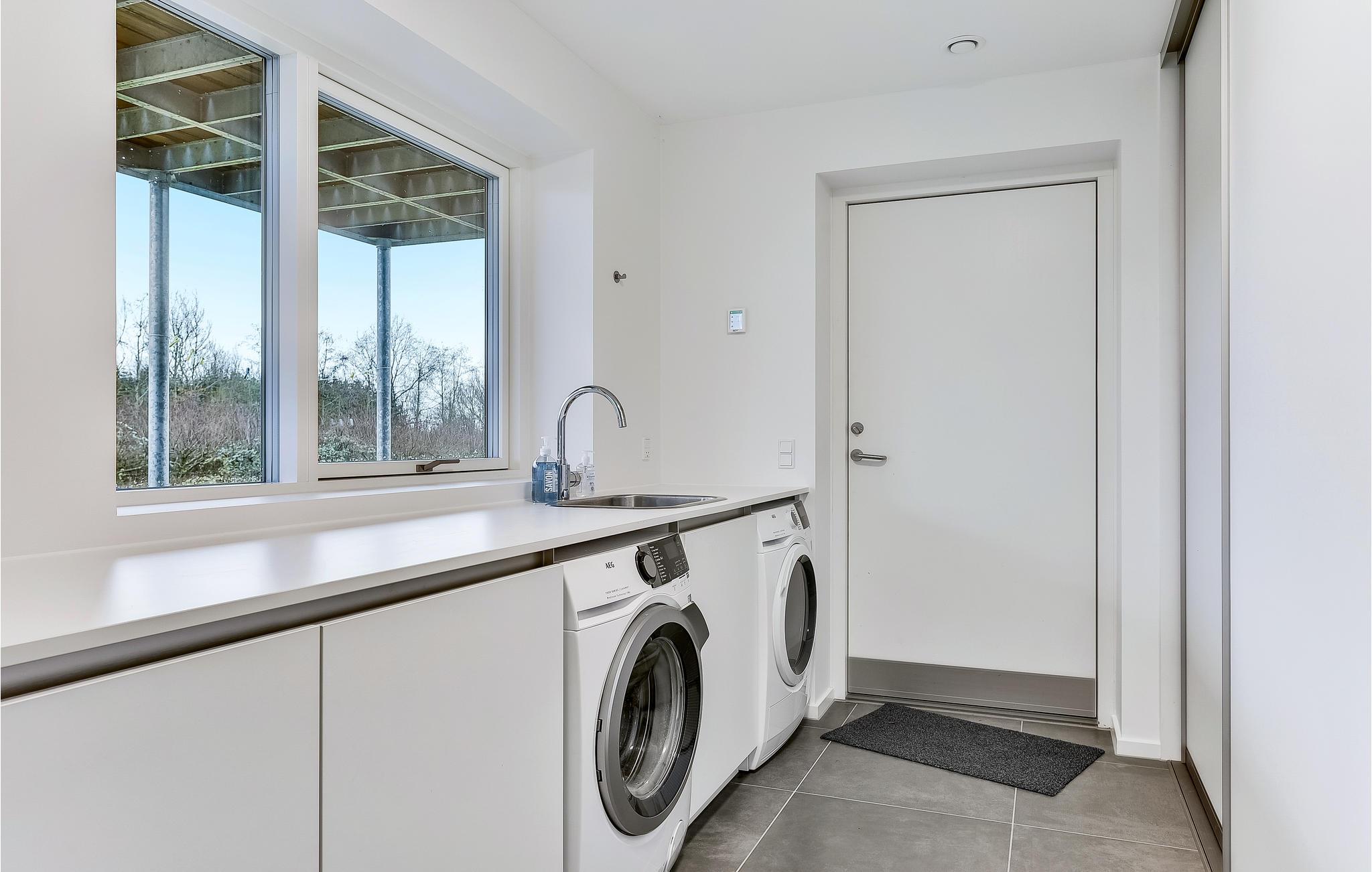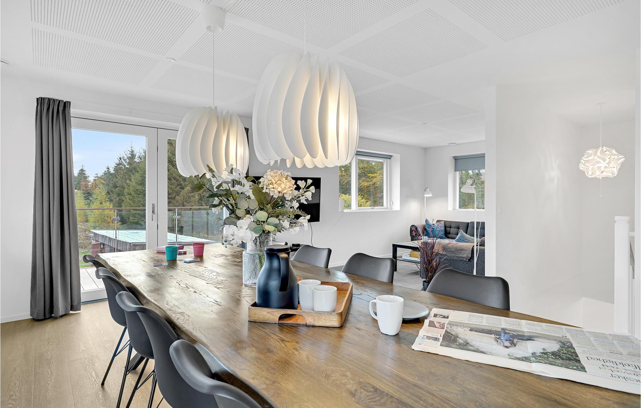 Dette utroligt rummelige feriehus har to etager og har med sine 4 soveværelser og 2 badeværelser plads til op til 8 personer. På øverste etage finder I en stor åben stue med spisestue, køkken og sofagruppe. Her er der adgang til en altan, hvor I kan nyde udsigten over vandet og de grønne omkringliggende landskab, mens I slapper af i solen. I stueetagen finder I tre af soveværelserne, samt udgang til terrassen. Her kan I gøre brug af grillen eller båldstedet og tilbringe hyggelige aftener i det fri. Hop i vildmarksbadet og lad roen sænke sig, mens I slapper af.