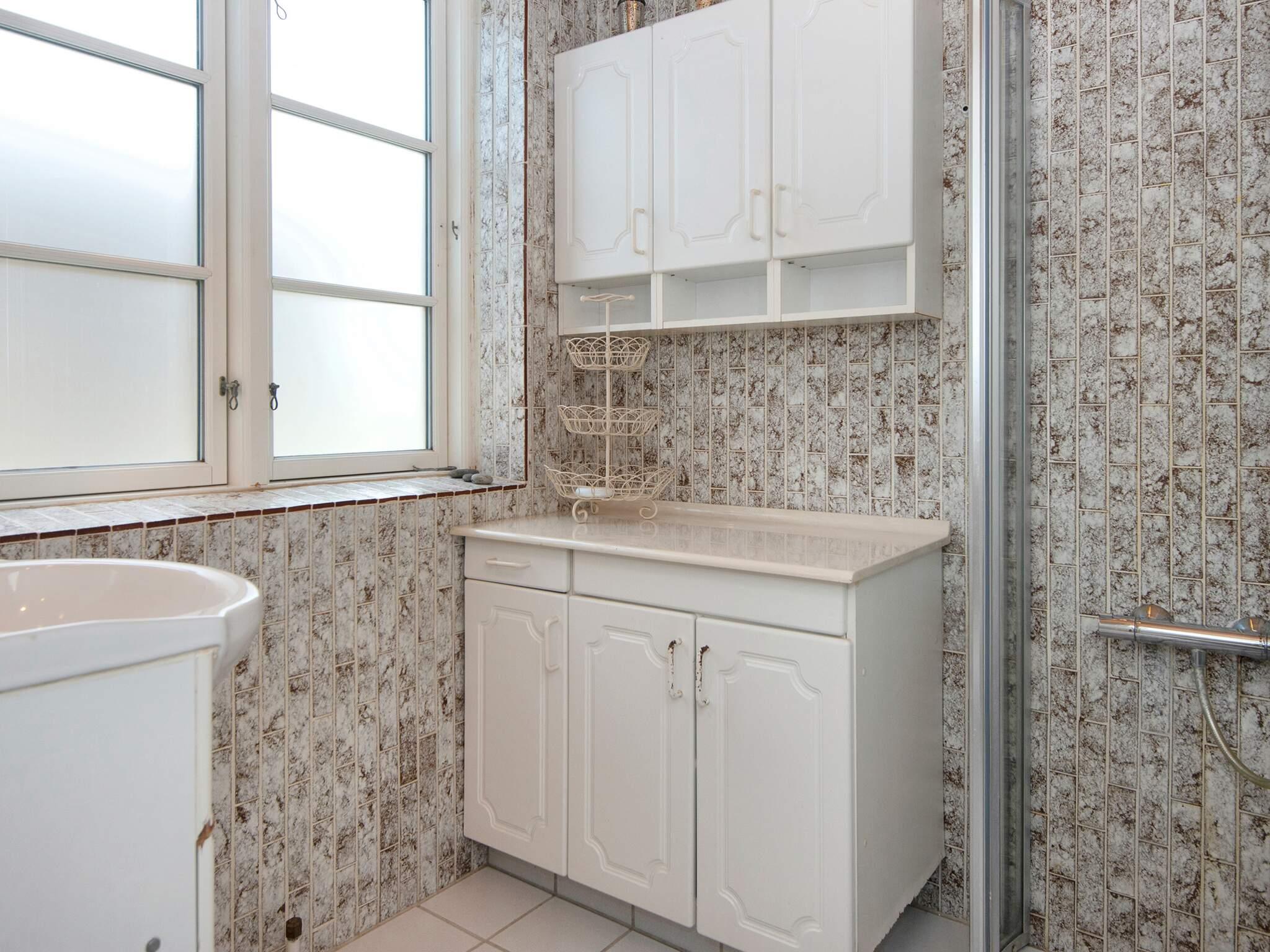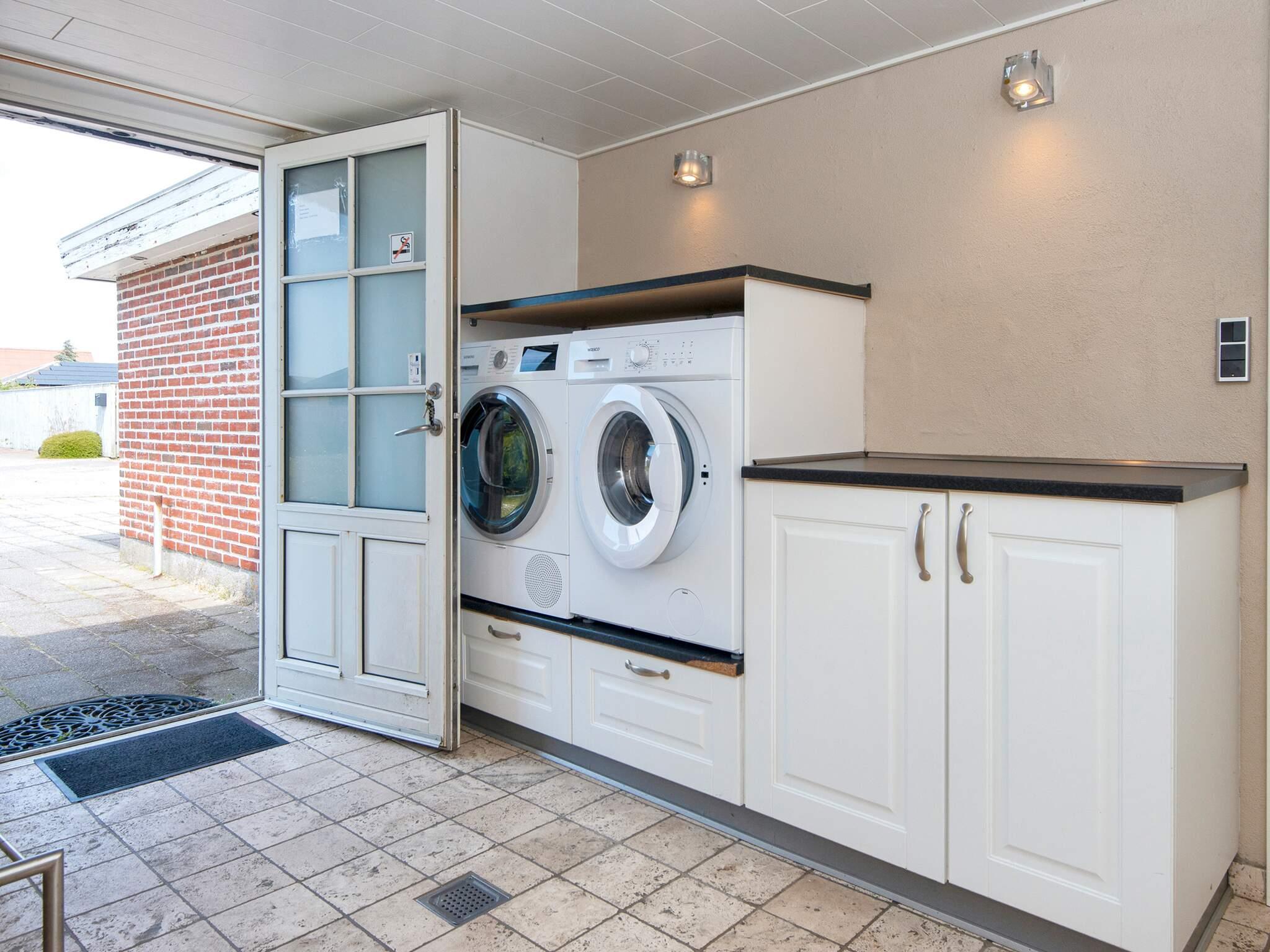 Badeværelse med badekar, bruser og toilet. Bryggers med vaskemaskine og tørretumbler. Der er også en høj stol og en weekendseng i huset.
