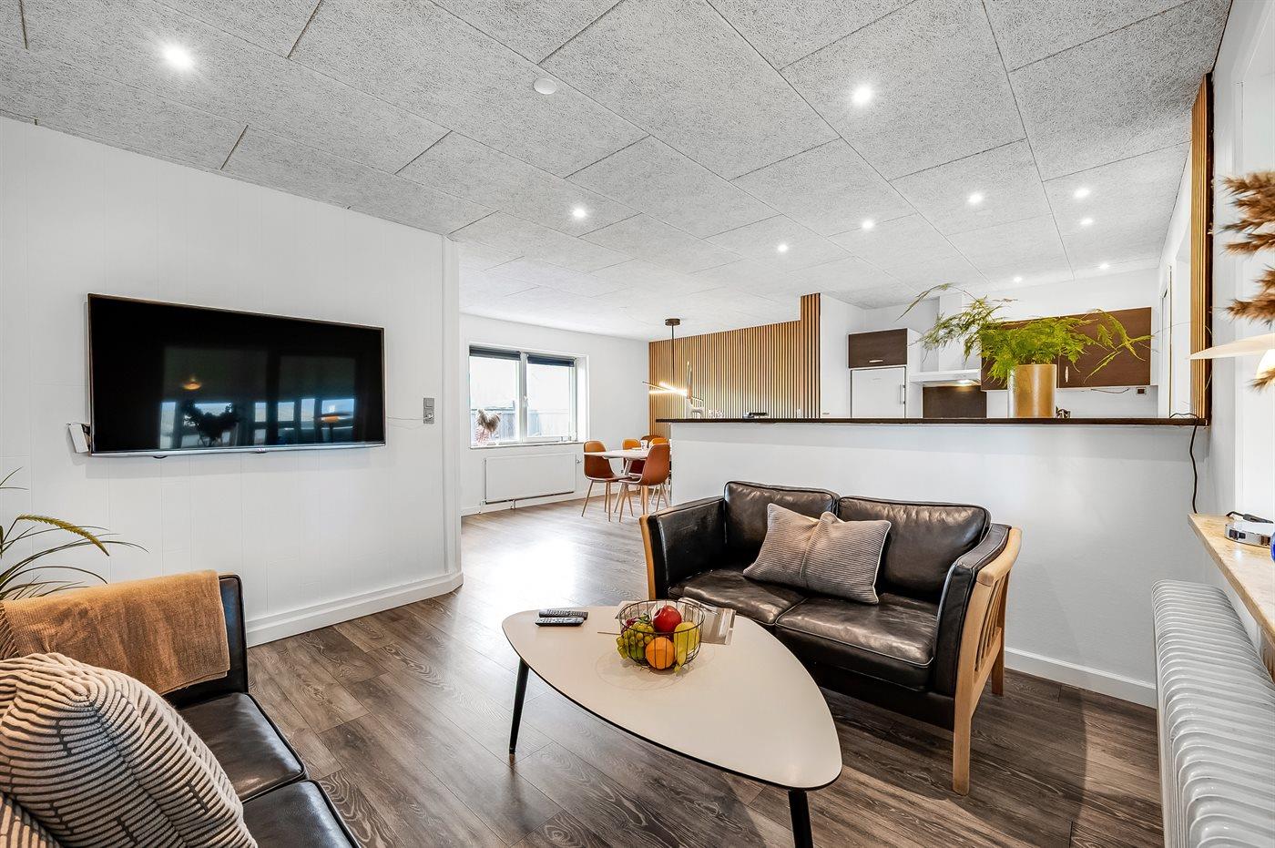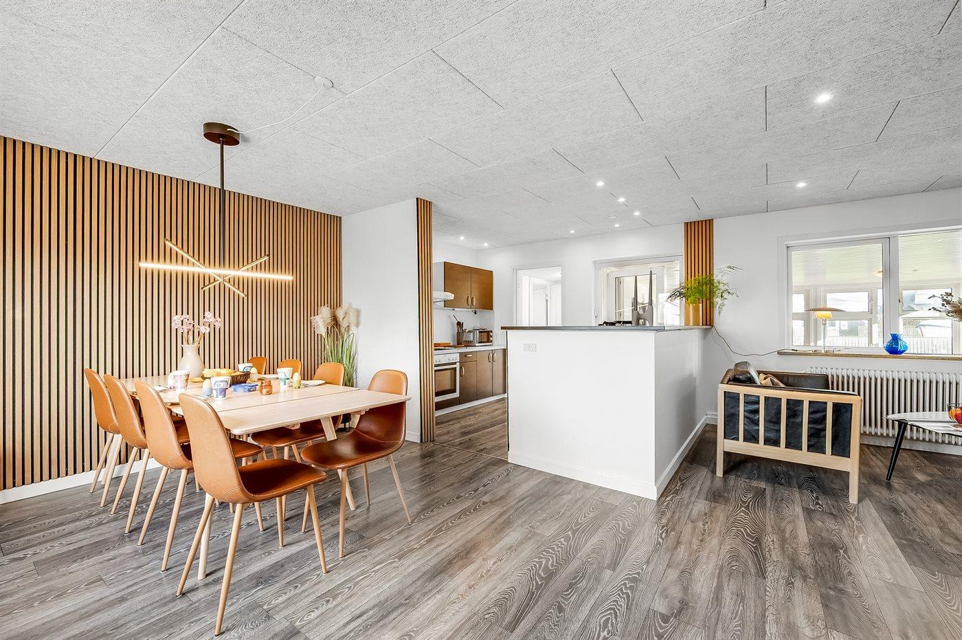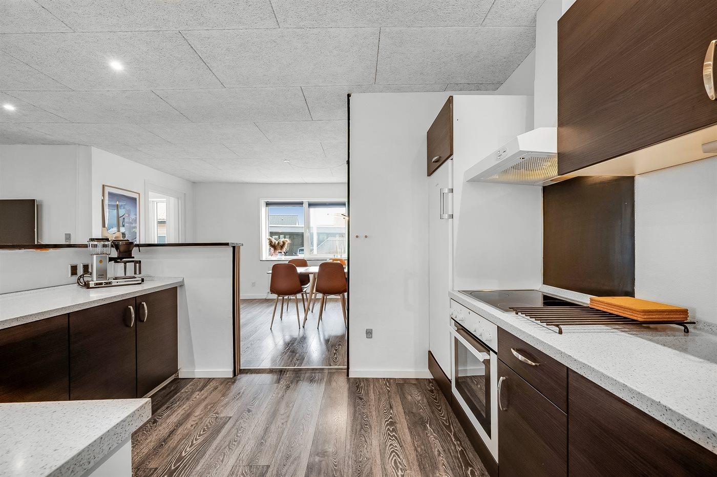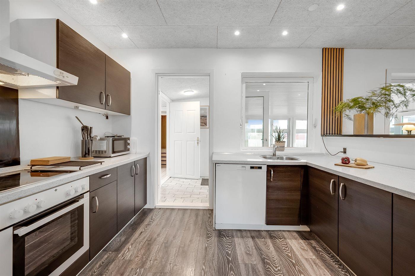Køkkenet er udstyret med 1 køleskab. Der er 4 keramiske kogeplader, varmluftovn, mikrobølgeovn samt opvaskemaskine.