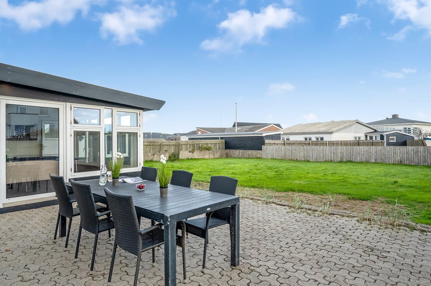 Ferieboligen er beliggende på en 546 m² stor havegrund. Grunden er indhegnet. Der er 300 m til havet. Nærmeste forretning er beliggende i en afstand af 1500 m. Til ferieboligen hører åbent terrasseareal. Ligeledes er der adgang til udestue. Der er redskabsrum. Der ligger en legeplads i en afstand af 1500 m. Bålsted. Parkering ved ferieboligen.