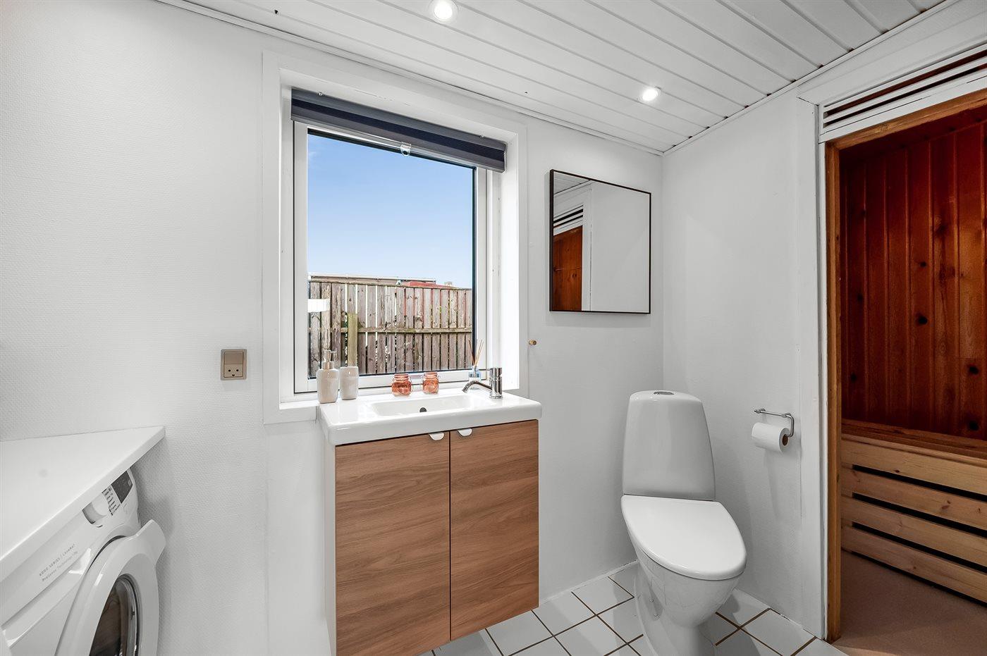 Der er 2 badeværelser med bruseniche og 2 toiletter. Der er gulvvarme på 2 badeværelser. I saunaen er der mulighed for afslapning.