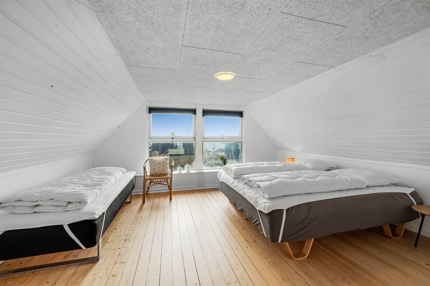 Der er i alt 4 soveværelser. Sovepladserne fordeler sig på: 6 sovepladser i dobbeltsenge. 2 sovepladser i enkeltsenge. 4 sovepladser i sovesofa (enkelt). 2 sovepladser på madrasser. 2 af disse sovepladser befinder sig på husets hems, og 2 sovepladser findes i stuen. Derudover er der 2 stk. barnesenge.