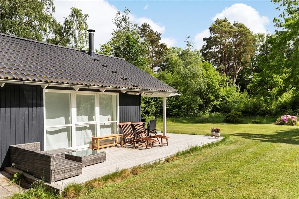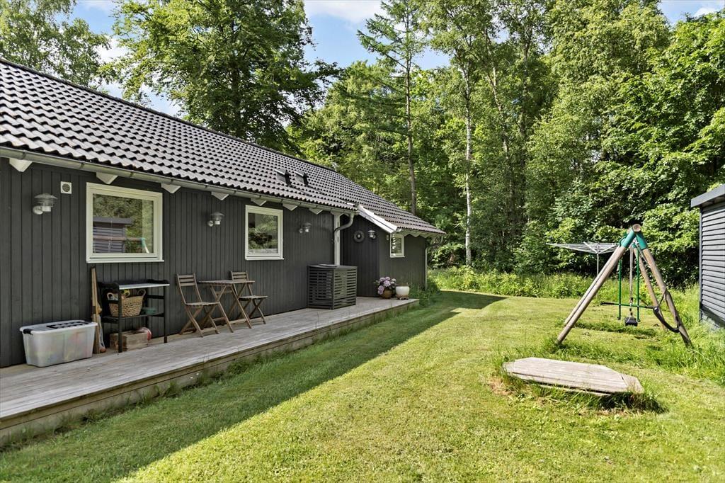 Huset ligger for enden af en lukket vej på en stor, naturskøn grund omgivet af skovplanter og træer, hvilket skaber en privat og fredelig oase. Fra stuen kan du træde direkte ud på den imponerende 75 m² store træterrasse, hvor du kan nyde solen eller finde skygge under den overdækkede del. Terrassen er udstyret med spisebord, stole, gasgrill samt et afslappende loungeområde med liggestole, sofa og parasoller. Med flere terrassevarmere kan du forlænge de hyggelige aftener under åben himmel.