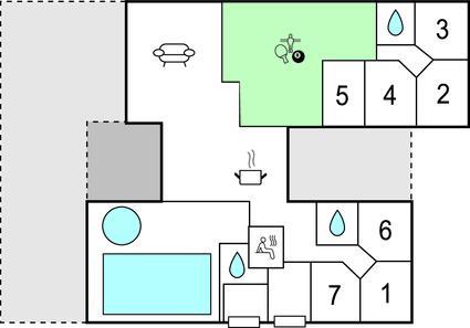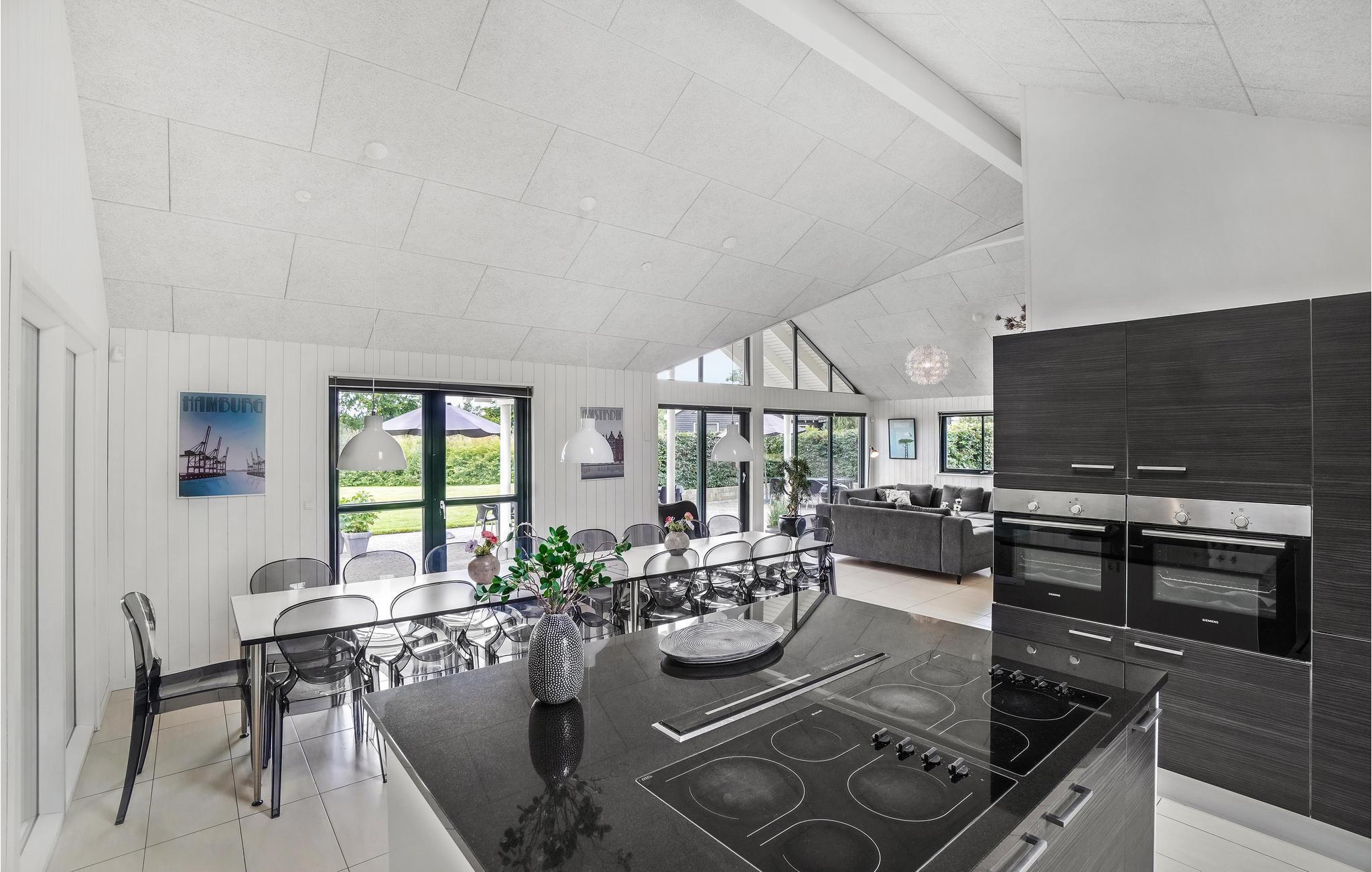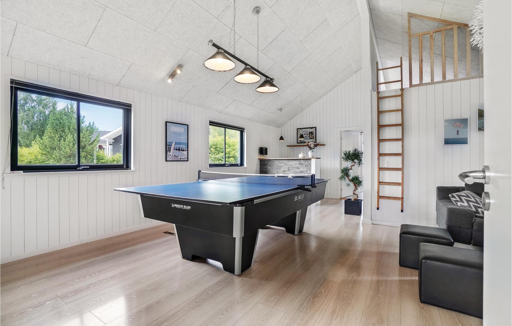 Husets omdrejningspunkt, køkkenalrummet, er i åben forbindelse med stuen, som er hyggeligt indrettet med brændeovn og smagfulde møbler. Der er adgang til den dejlige solrige terrasse via de to terrassedøre, så I let kan trække udenfor, når vejret indbyder til det. Køkkenet er selvfølgelig fuldt udstyret med alt, som I behøver på jeres ferie og har oven i købet dobbelt op på hårde hvidevarer, så det bliver en leg at brilliere med lækre retter til alle. Huset har desuden et spændende aktivitetsrum, hvor hele familien kan dyste i billard, bordtennis, bordfodbold, og dart. Her er også en bar med køleskab til kolde drinks, når tørsten skal slukkes. Skulle spillelysten ikke være styret endnu, kan I også udfordre hinanden på husets Playstation 4 (husk at medbringe egne spil).