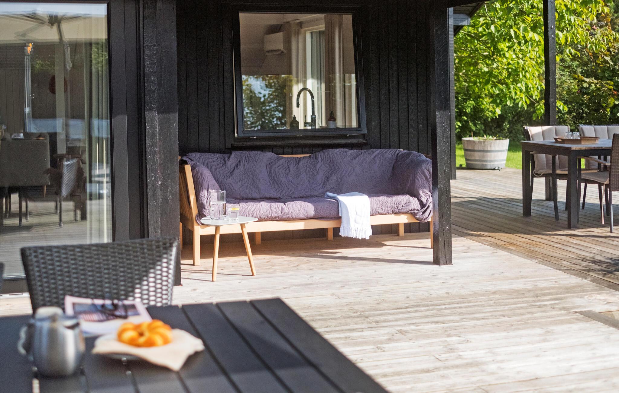 De to huse er forbundet via terrassen. Her kan I nyde de lange sommeraftener med lækre grillretter, mens børnene tumler på græsplænen.
