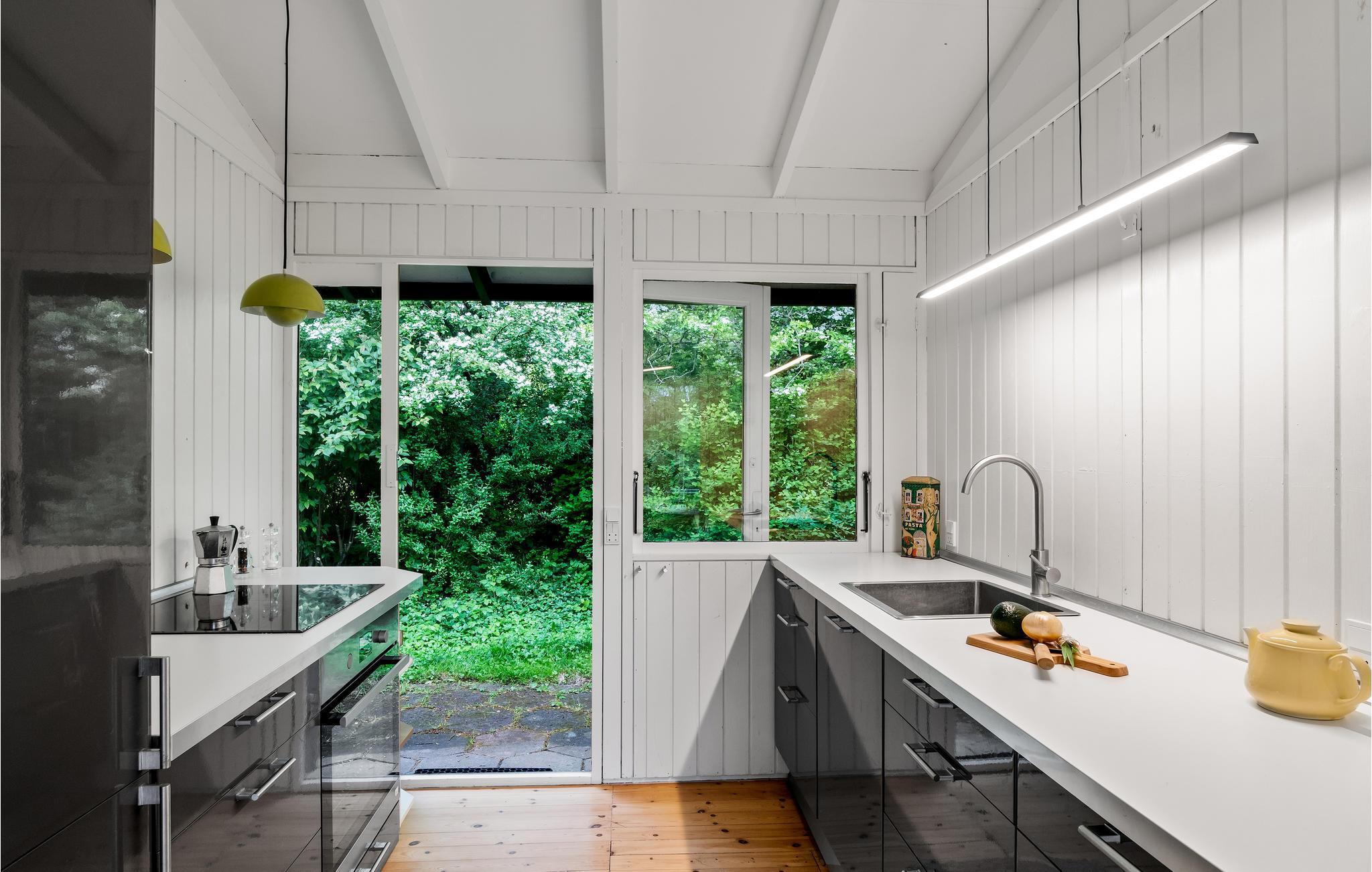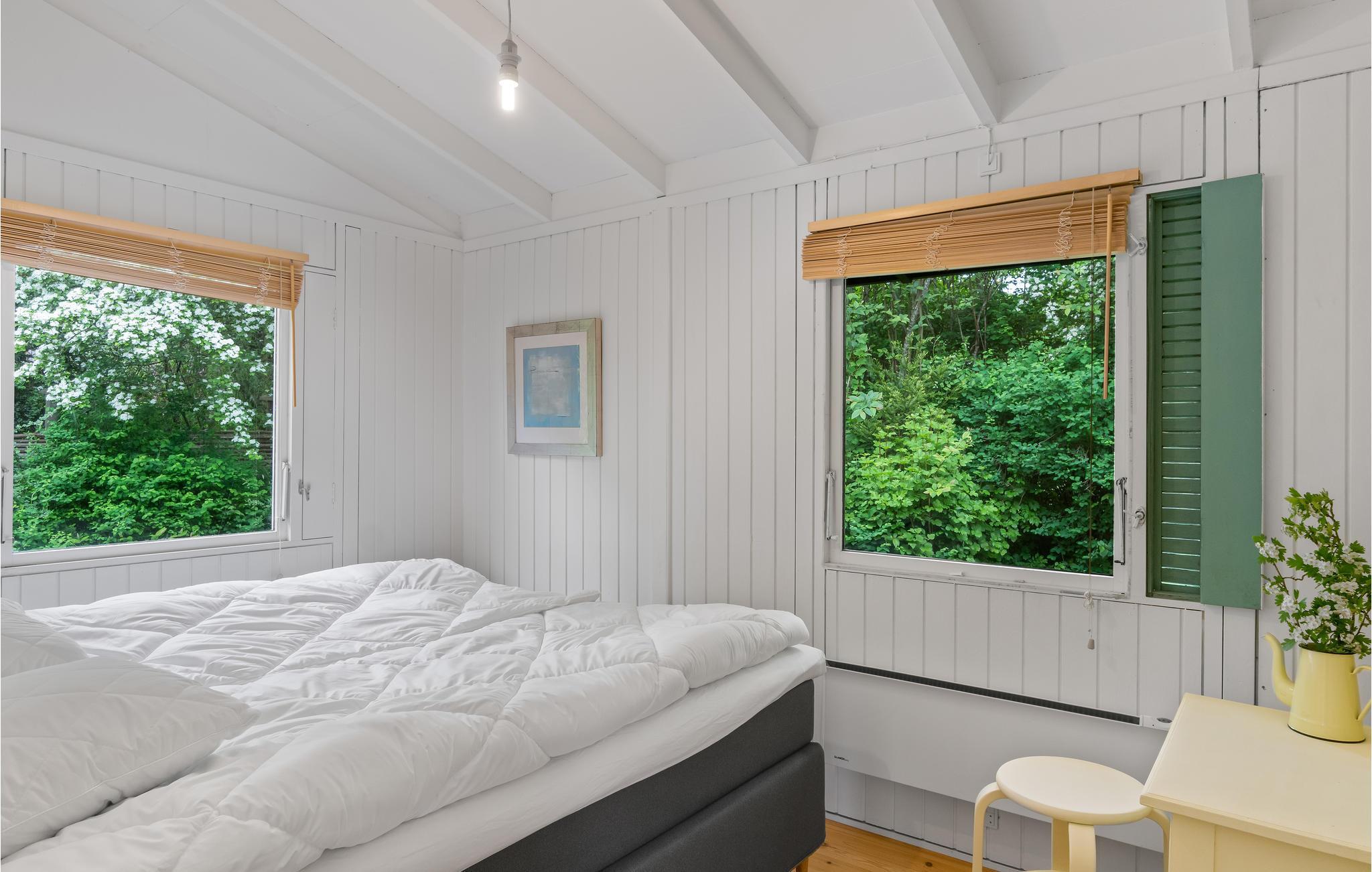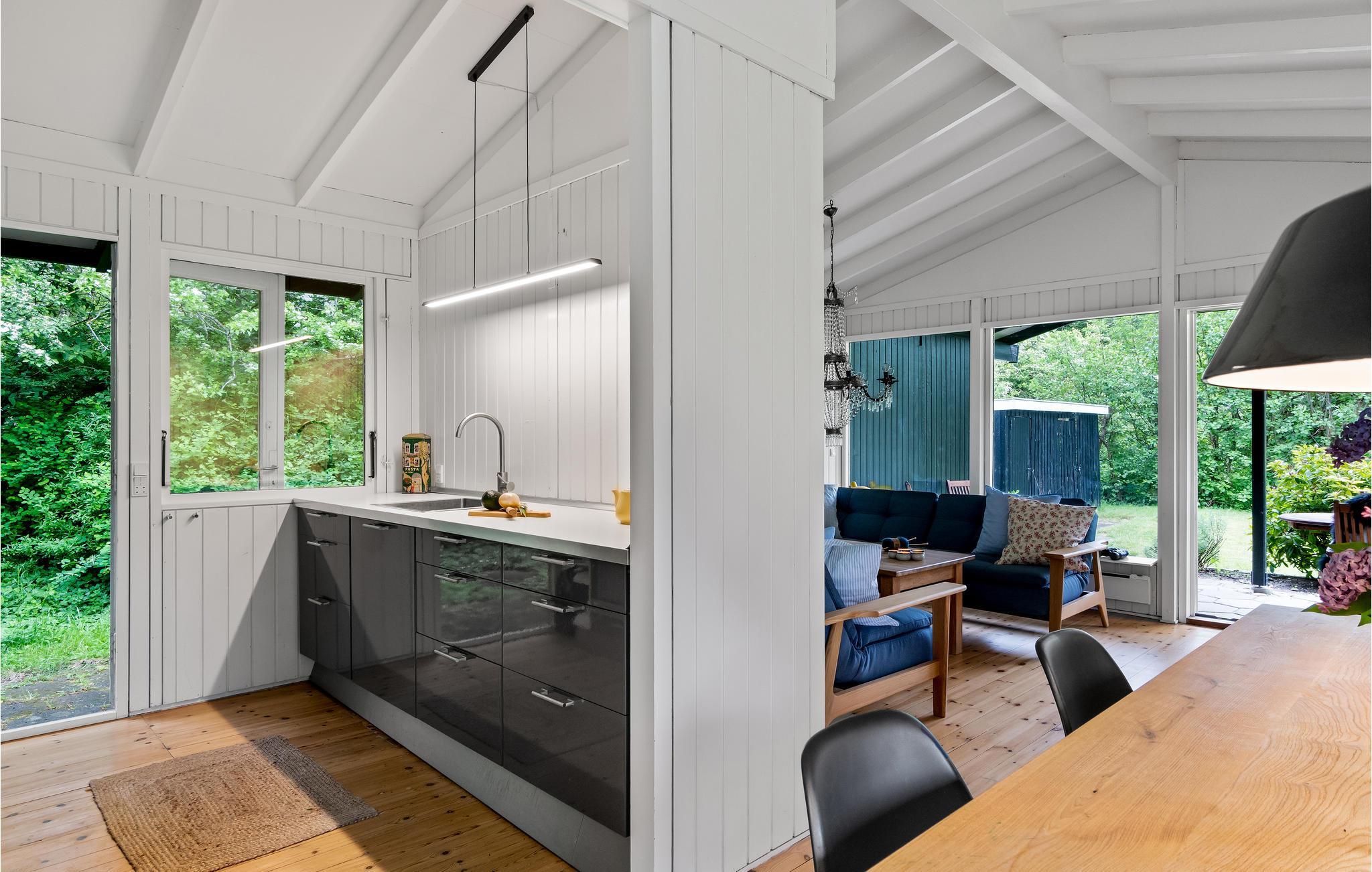Glæd jer til en afslappende familieferie i dette indbydende sommerhus. Her kan I se frem til nogle fredfyldte dage i de skønneste rammer. Den lyse stue bliver omdrejningspunktet for jeres samvær. Her kan I nyde de fine indretningsdetaljer, som kombinerer moderne træk i form af møblerne og de lyse vægge sammen med husets fine trægulv og den integrerede pejs.