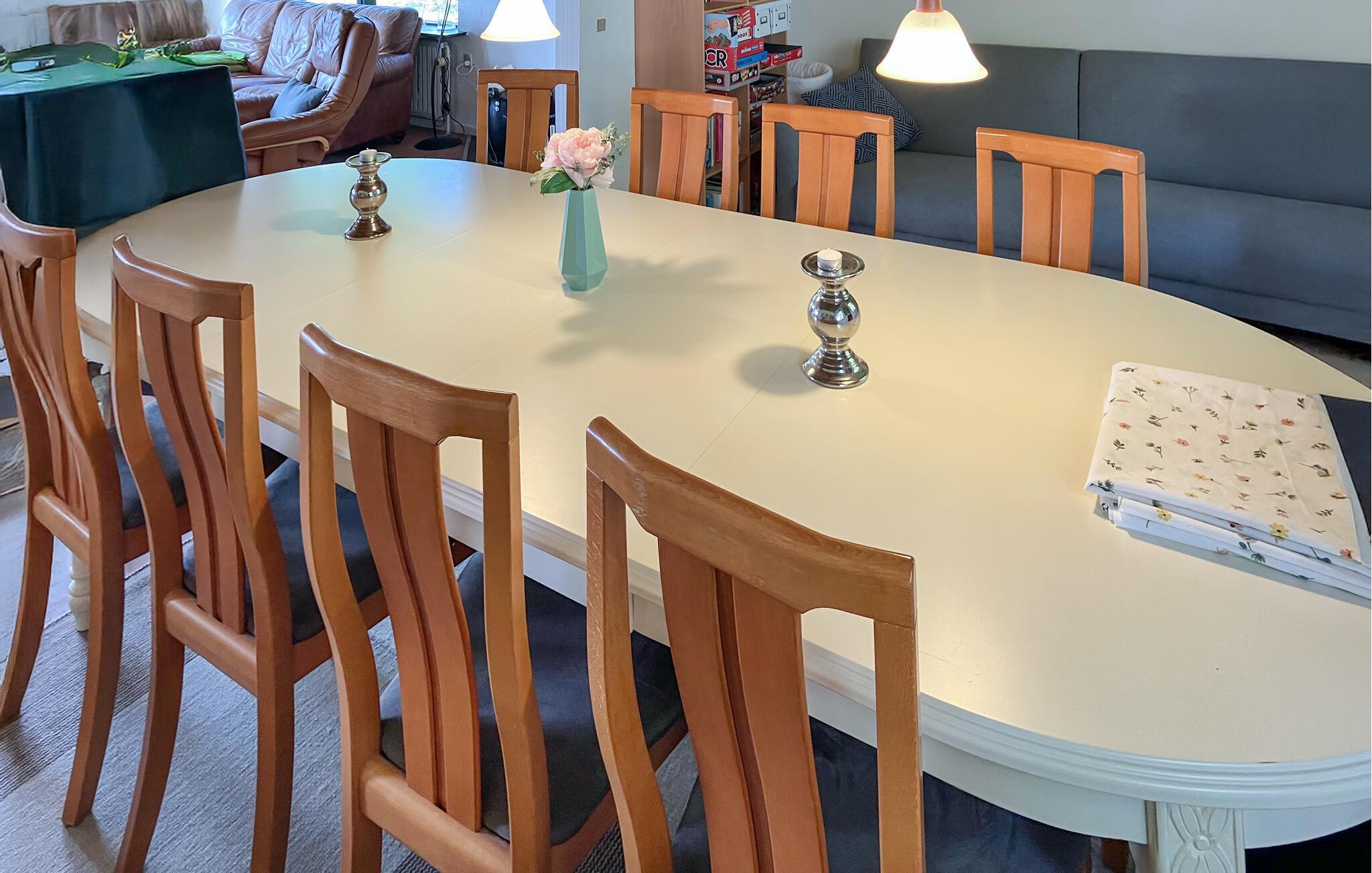 Dette feriehus ligger i rolige omgivelser og giver jer de perfekte betingelser for nogle afslappende dage med familien eller jeres gode venner. Træd ind i den lyse opholdsstue og sæt jer godt til rette i sofaerne. Slap af foran brændeovnen eller udnyt det åbne rum, der harmonisk kombinerer opholdsstue, spisestue og madlavning. Slå jer ned ved det store spisebord og nyd måltiderne sammen med udsigt til den grønne have.