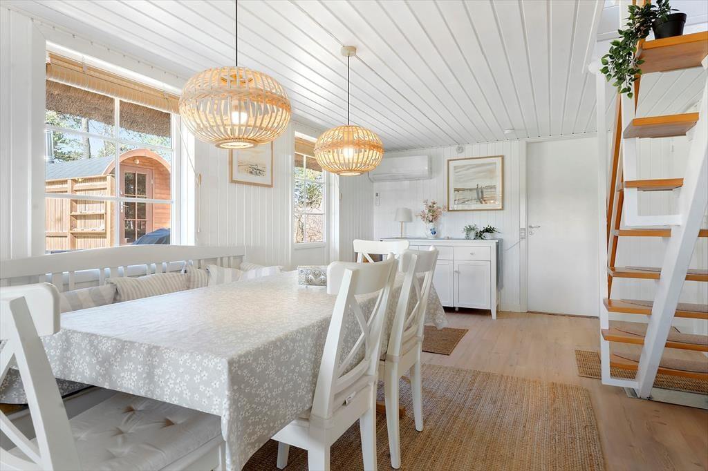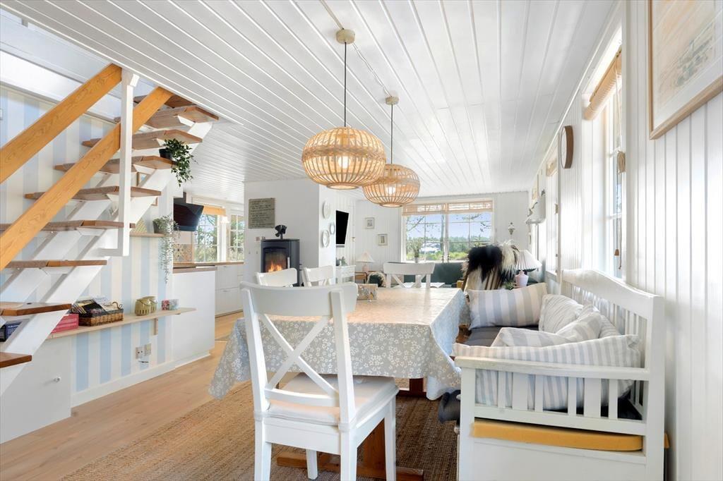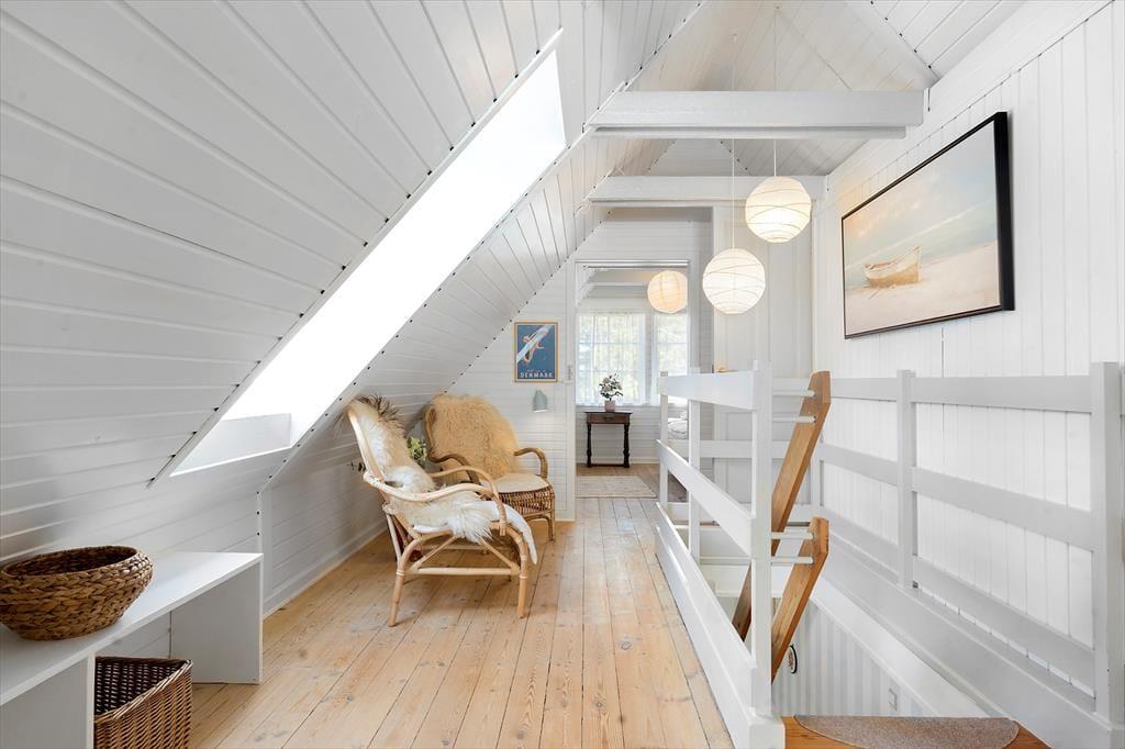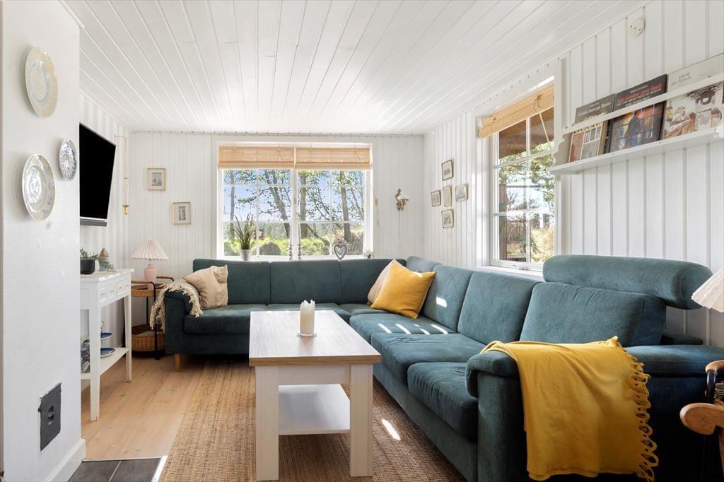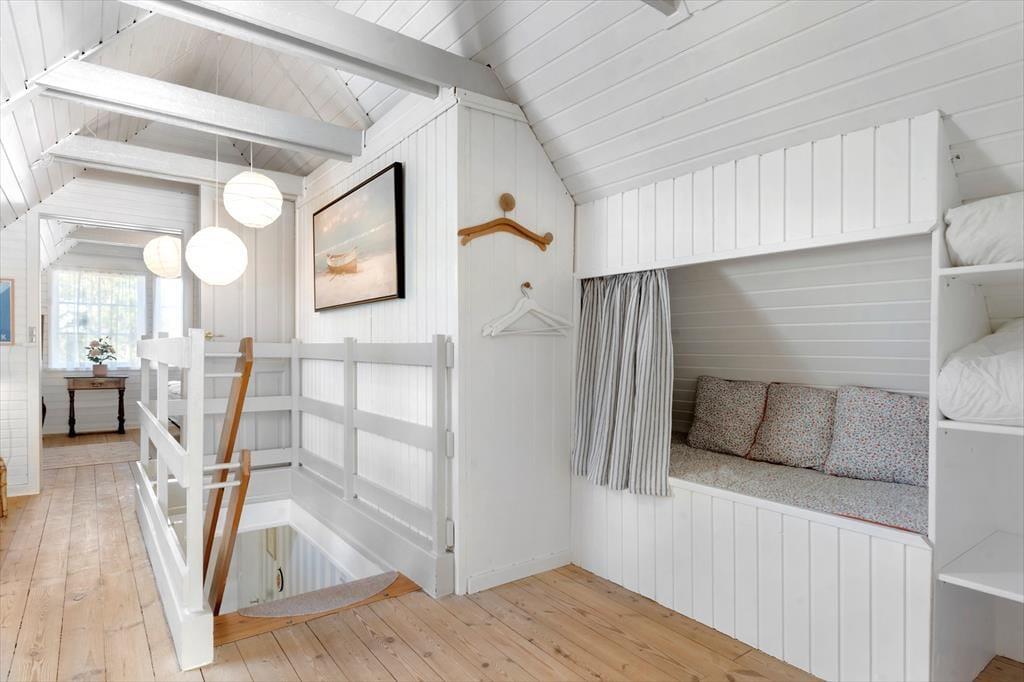 Det er ikke kun ude i det fri, at der er wellnessfaciliteteter, for sommerhusets store badeværelse er udstyret med et dejligt spabad. Trænger du til at slappe af, føles det også velgørende bare at tage den med ro i den velindrettede stue – for eksempel når der er tændt op i brændeovnen, og det dufter af nybagte boller fra det åbne køkken. Alle rum fremstår lyse og indbydende, så også nattesøvnen kommer til at foregå i rare omgivelser. Et af soveværelserne ligger i stueplan, mens to er placeret på førstesalen, og heroppe finder du også et gæstetoilet og et gennemgangsrum med en ekstra seng.