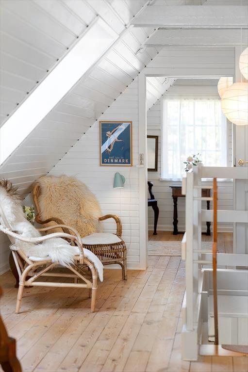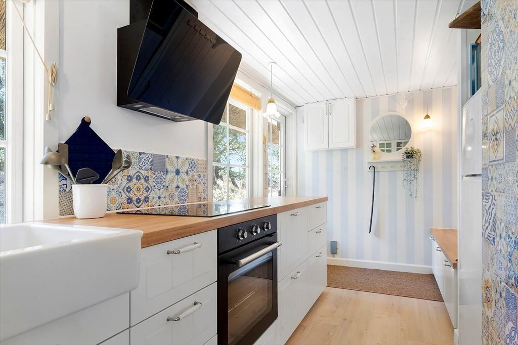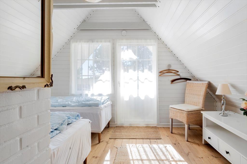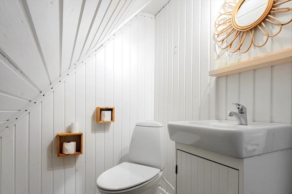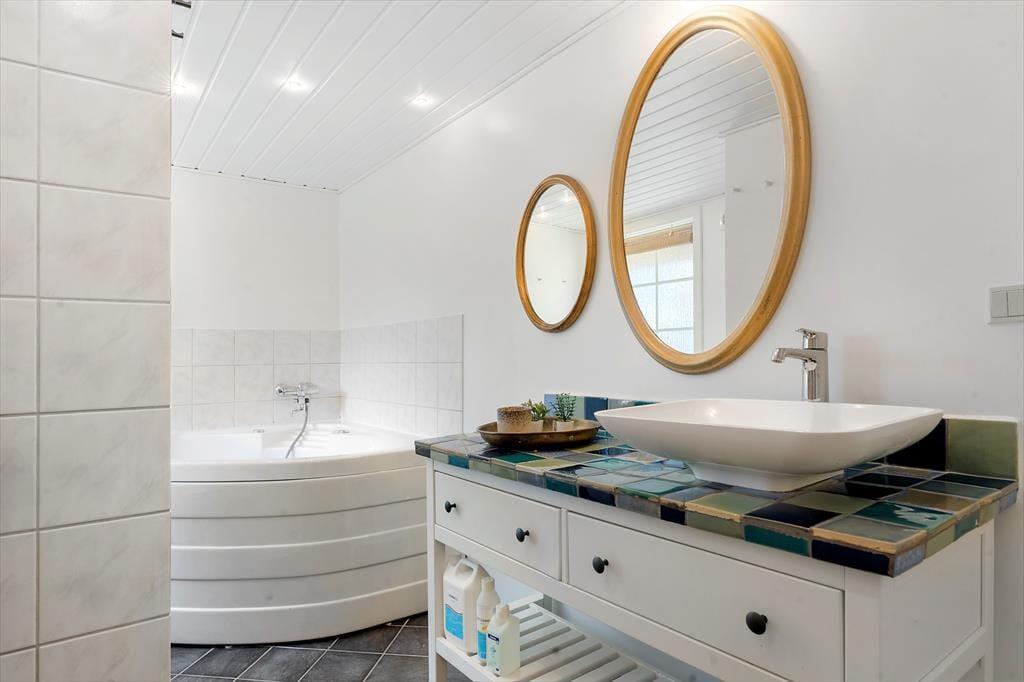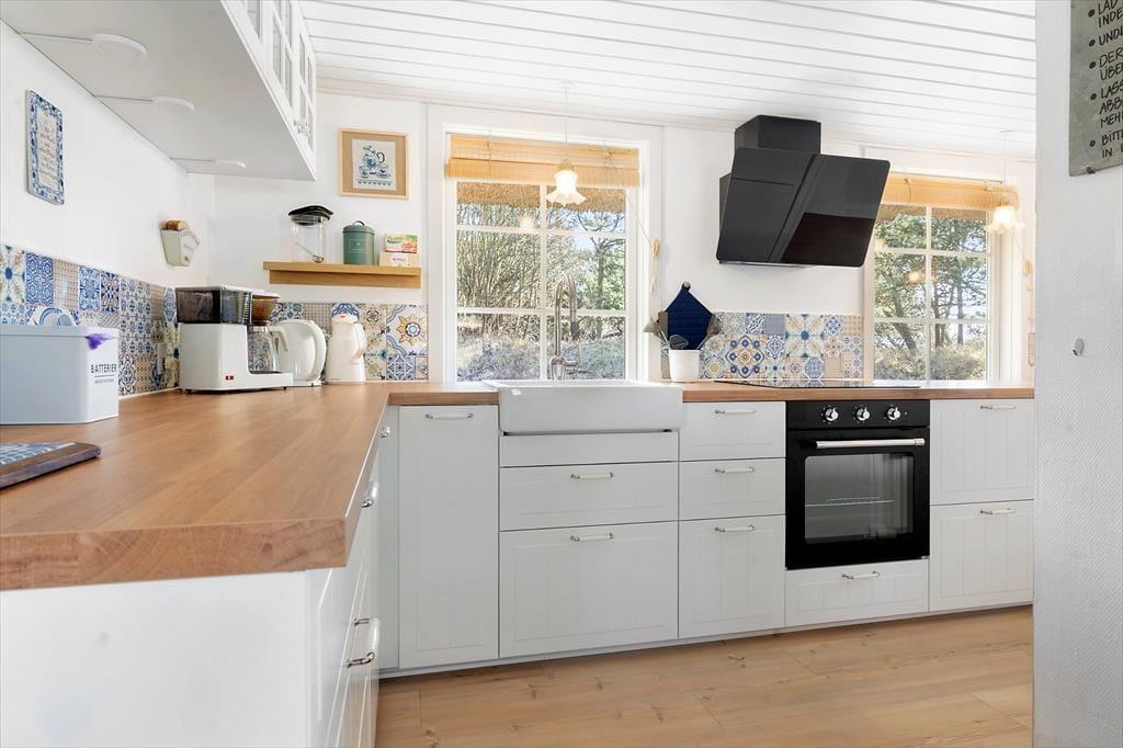 Det er ikke kun ude i det fri, at der er wellnessfaciliteteter, for sommerhusets store badeværelse er udstyret med et dejligt spabad. Trænger du til at slappe af, føles det også velgørende bare at tage den med ro i den velindrettede stue – for eksempel når der er tændt op i brændeovnen, og det dufter af nybagte boller fra det åbne køkken. Alle rum fremstår lyse og indbydende, så også nattesøvnen kommer til at foregå i rare omgivelser. Et af soveværelserne ligger i stueplan, mens to er placeret på førstesalen, og heroppe finder du også et gæstetoilet og et gennemgangsrum med en ekstra seng.