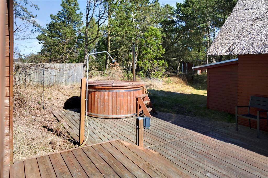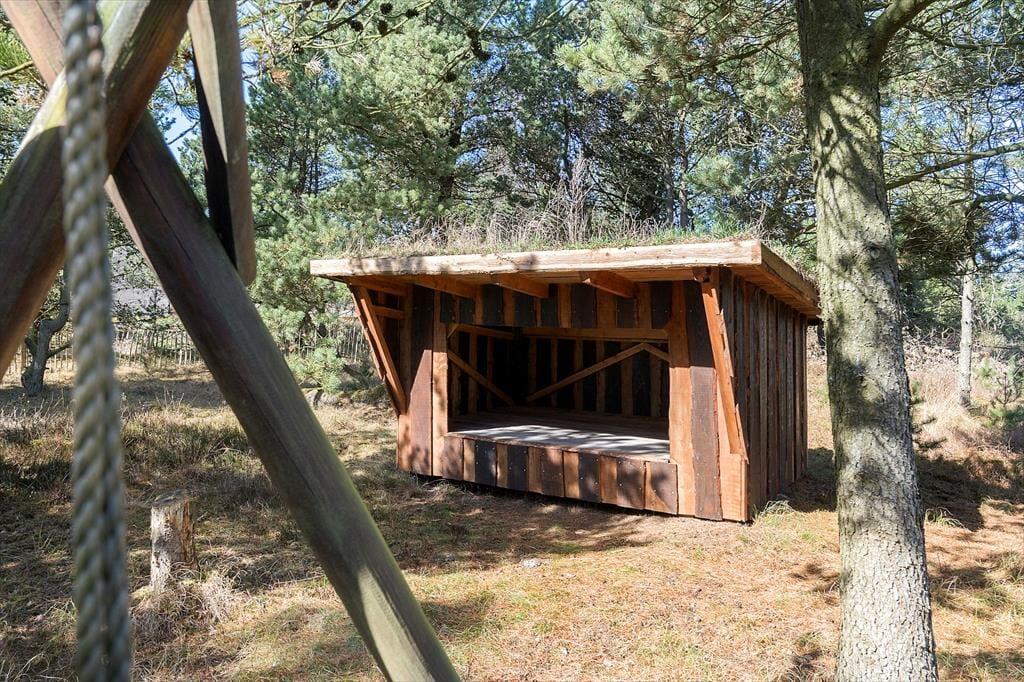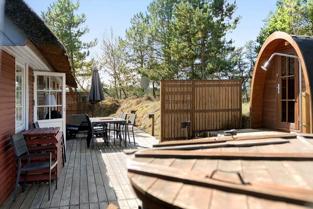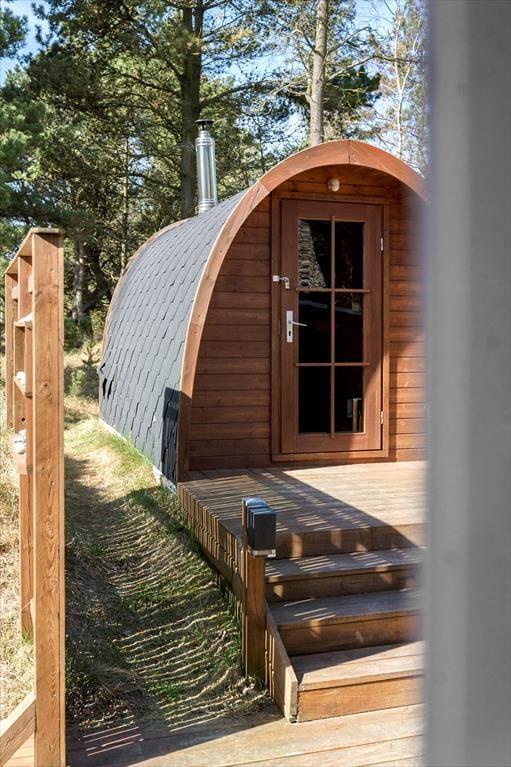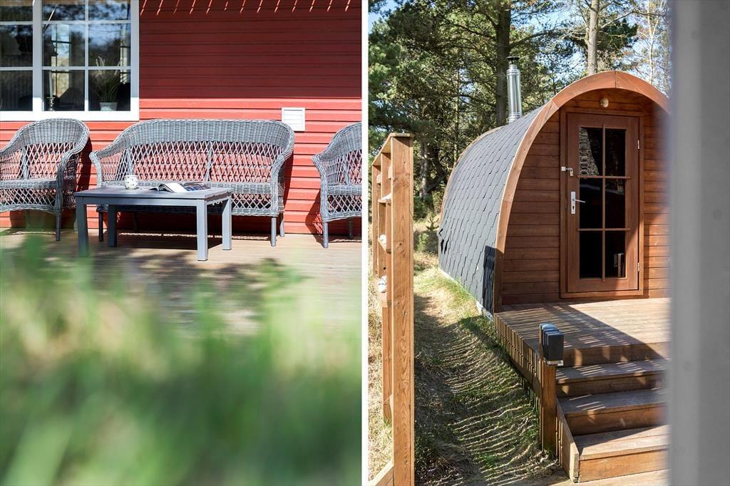 Når vejret indbyder til udendørs driverliv, kan du bruge hele dagen i det fri. Morgenbadet kan du tage under udebruseren, og bagefter kan du sætte dig for at drikke kaffe på træterrassen. Hvis vejret slår om, og du får brug for ekstra varme, er det fantastisk at have fri adgang til både vildmarksbad og sauna på terrassens wellnessområde. Grunden er stor, og både børn og hunde kan trives her i de naturskønne og ugenerede omgivelser. Mellem træerne finder du et shelter, og det kan bruges til leg i løbet af dagen, men også overnatning, hvis du drømmer om at vågne op til lyden af fuglesang og brisens susen i træerne.