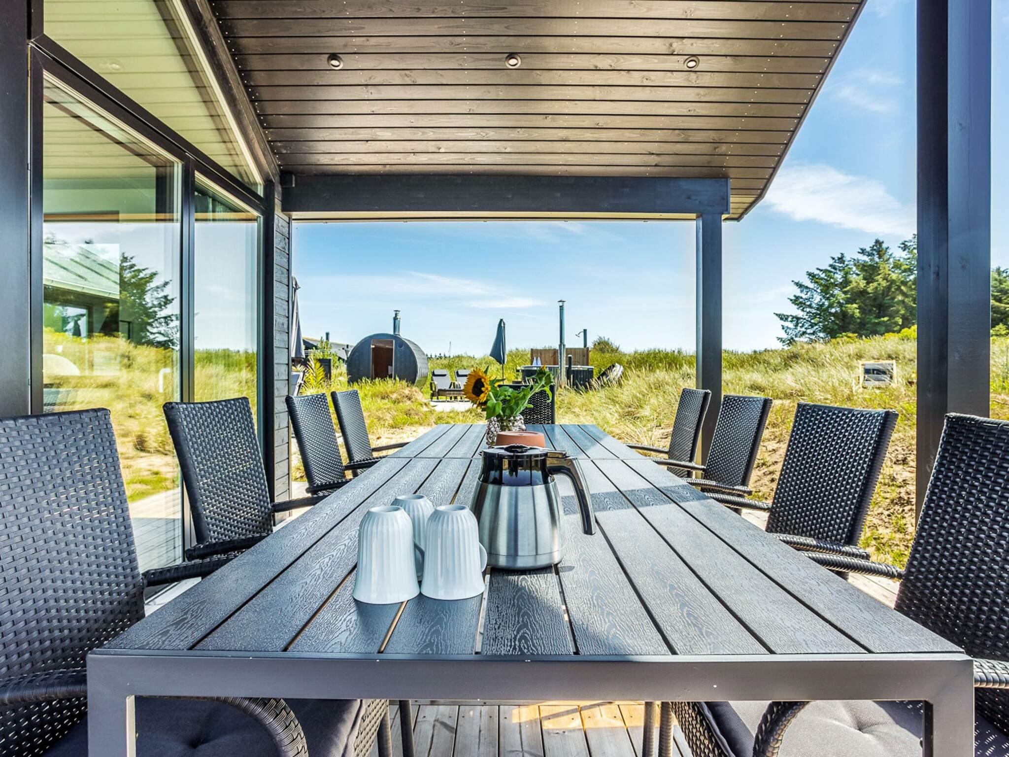 Ude på den store grund har I ligeledes masser af plads og fine forhold til livsnydertilværelsen. Som tillæg til saunaen er der både en udendørs bruser og et vildmarksbad på terrassen, så I kan se frem til en rigtig wellnessseance under åben himmel.” Udespabadet er lukket fra den 01. november til d. 31. marts. Ønsker I at benytte udespabadet i vinterhalvåret, så kan det arrangeres mod betaling DKK 500,00. Dog skal benyttelse af udespabadet i vinterperioden bestilles forud for ankomsten.” Et kæmpestort terrassemiljø breder sig syd og vest. Terrassen byder på både afskærmede, overdækkede og helt åbne områder. Legetårn med klatrevæg, rutsjebane, sandkasse, trampolin (benyttes på eget ansvar/forsikring) og gynger, sørger for underholdning til børnene.
