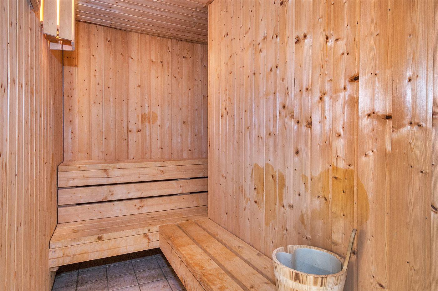 Der er 2 badeværelser med bruser og 3 toiletter, heraf 1 gæstetoilet. Der er gulvvarme på 2 badeværelser. I saunaen er der mulighed for afslapning.