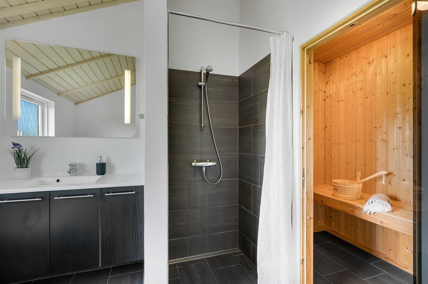 Der er 1 badeværelse med bruseniche og 1 toilet.. Der er gulvvarme på 1 badeværelse. I saunaen er der mulighed for afslapning.