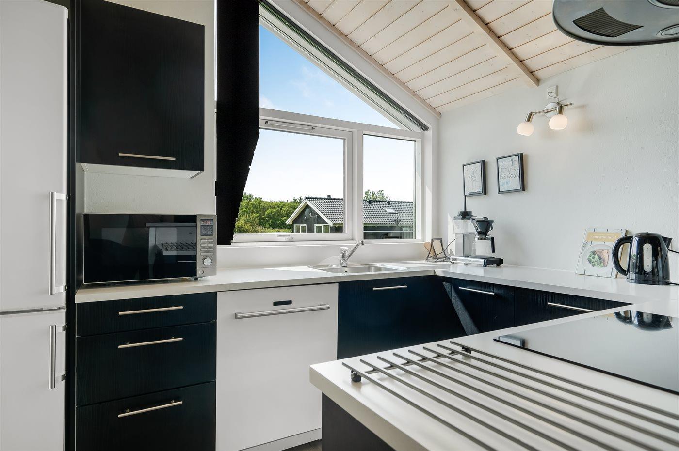 Køkkenet er udstyret med 1 køleskab. Der er 4 keramiske kogeplader, varmluftovn, mikrobølgeovn samt opvaskemaskine Der er gulvvarme i køkkenet.