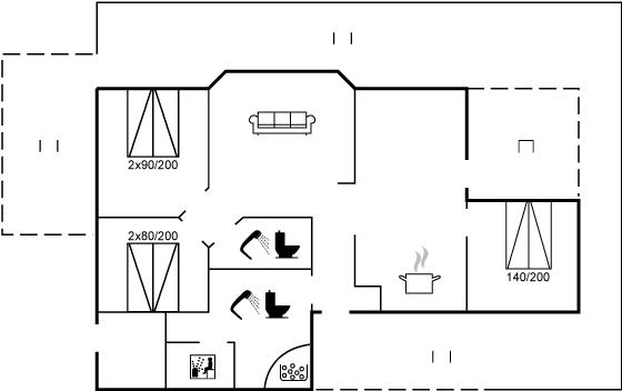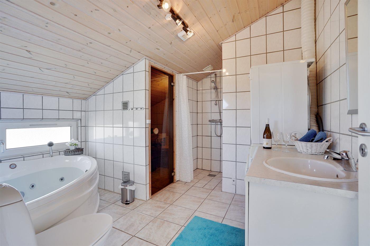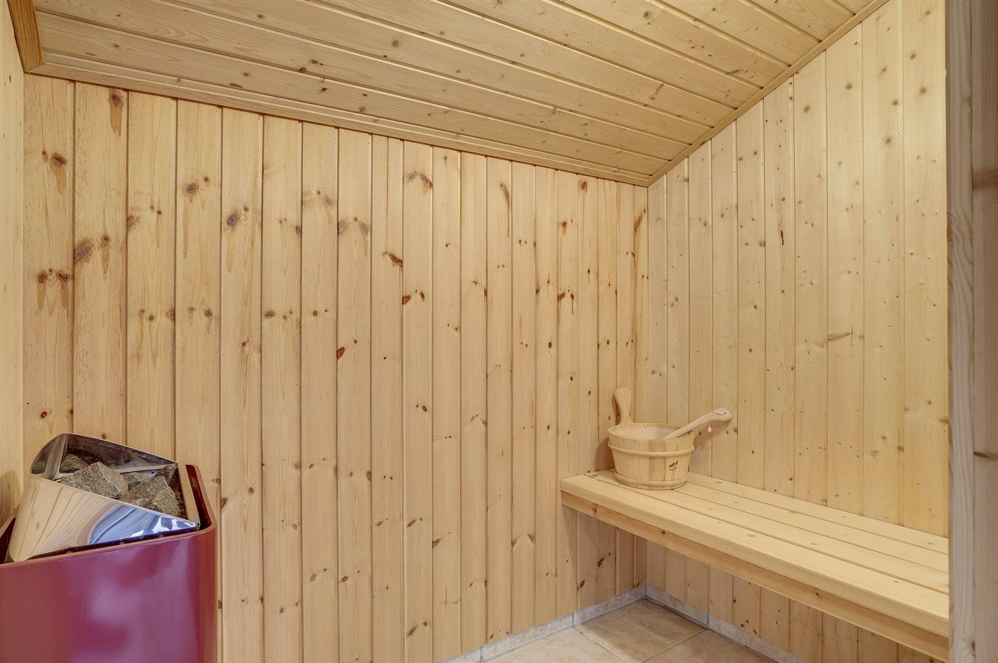Der er 2 badeværelser med bruseniche og 2 toiletter. Der er gulvvarme på 1 badeværelse. I saunaen er der mulighed for afslapning.