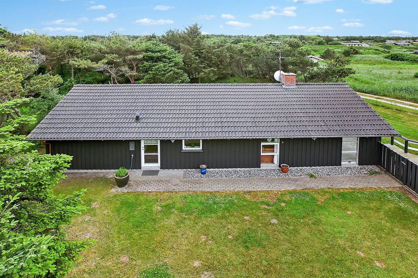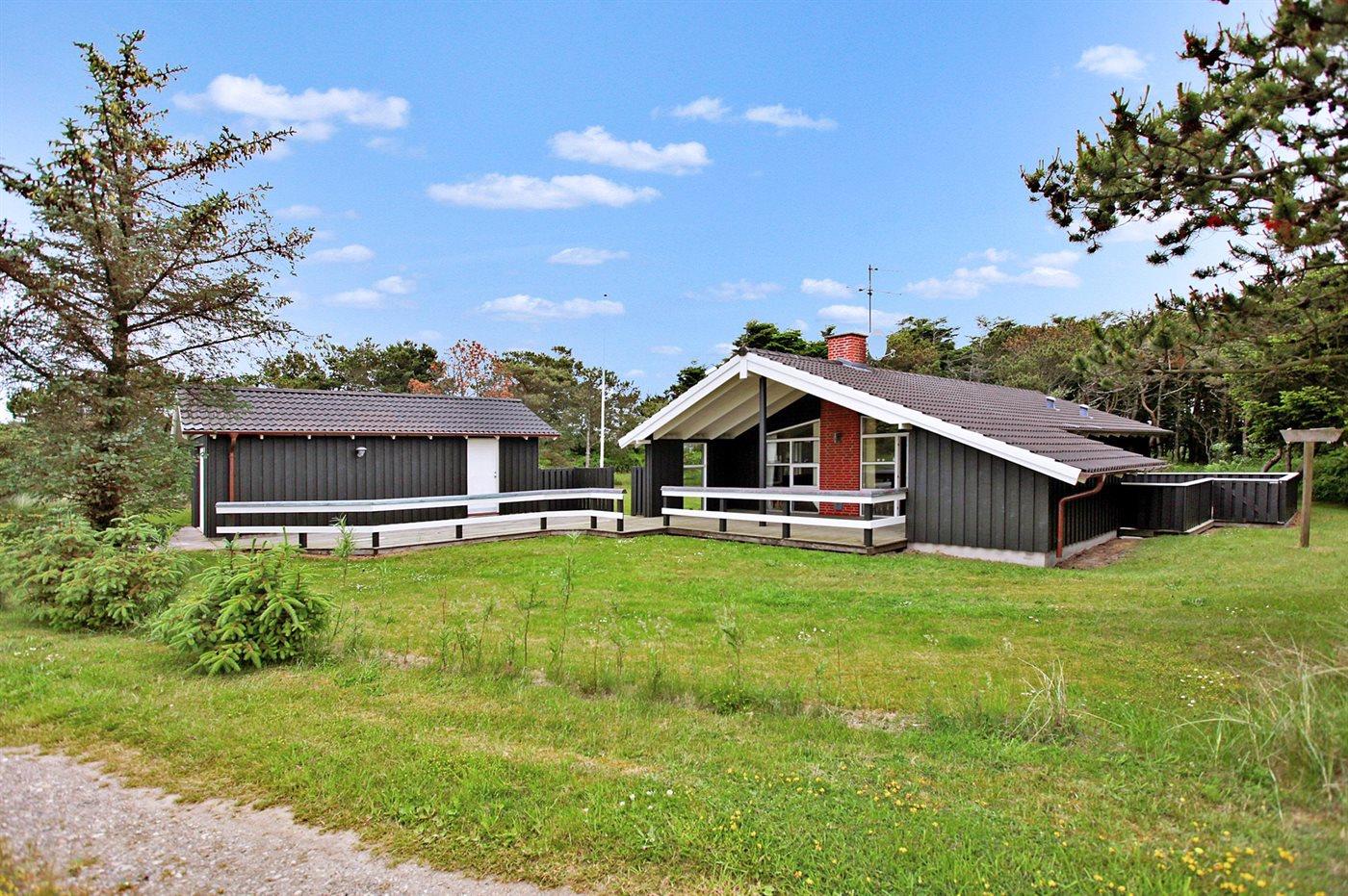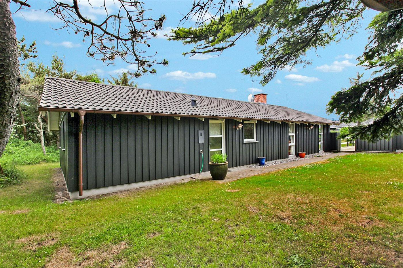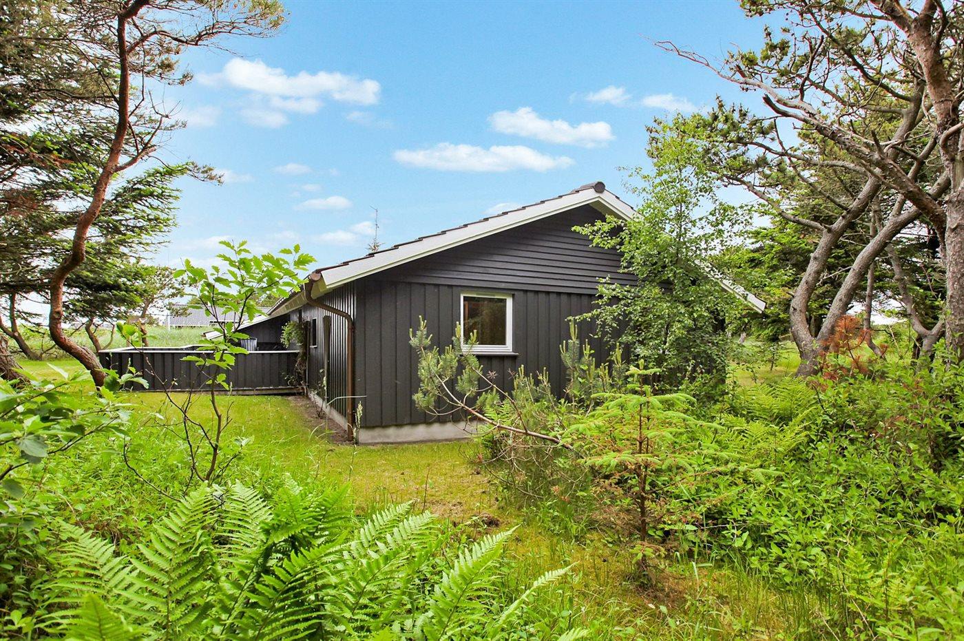 Dejligt og lyst indrettet sommerhus med god plads beliggende på en meget stor og delvis lukket grund med mange træer på halvdelen af grunden. Huset ligger desuden i et roligt og naturskønt område nær Vesterhavet og skøn badestrand samt skovarealer med flere gode vandrestier.