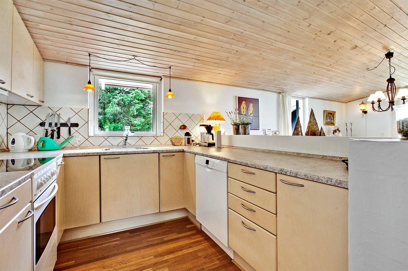 Køkkenet er udstyret med 1 køleskab. Der er 4 keramiske kogeplader, varmluftovn, mikrobølgeovn samt opvaskemaskine.