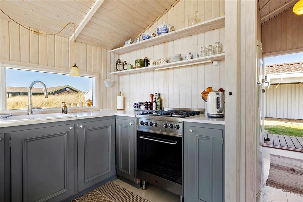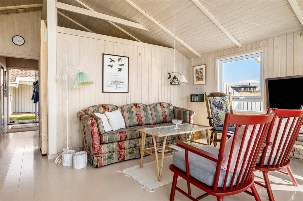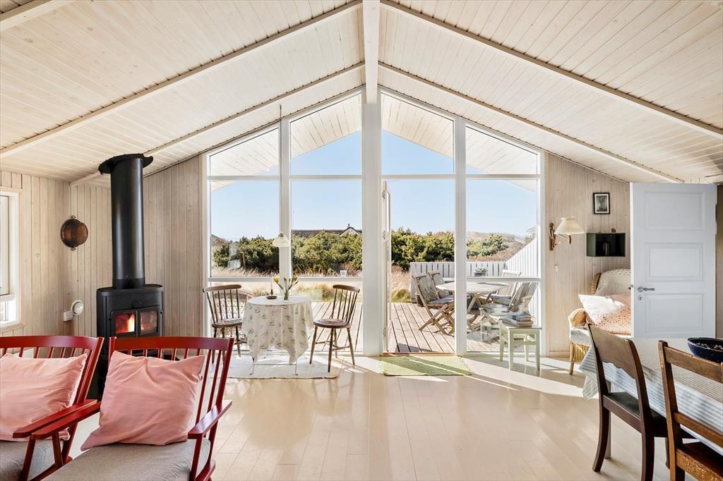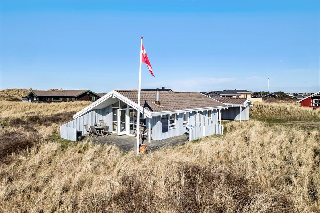 Dette sommerhus er opført i 1985 og er godt vedligeholdt gennem årene. Det har den helt rigtige sommerhusstemning med masser af lys fra de store vinduer, loft til kip, hvidmalede gulve i alle rum, en flot brændeovn, en charmerende indretning med loppefund, afdæmpede farver og varme tekstiler, og sidst men ikke mindst en smuk udsigt til klitlandskabet og Vesterhavet. Huset egner sig til 2-4 personer og består af tre soveværelser, et badeværelse med bruser og et stort, åbent køkken-alrum, hvor alle kan mødes til madlavning, spisning og hygge med spil, snak eller en god film. Af moderne faciliteter kan nævnes både vaskemaskine, tørretumbler, kabel-tv og trådløst Wi-Fi, så medbring gerne pc eller tablets, så det er nemt at søge på informationer om områdets mange attraktioner og muligheder.