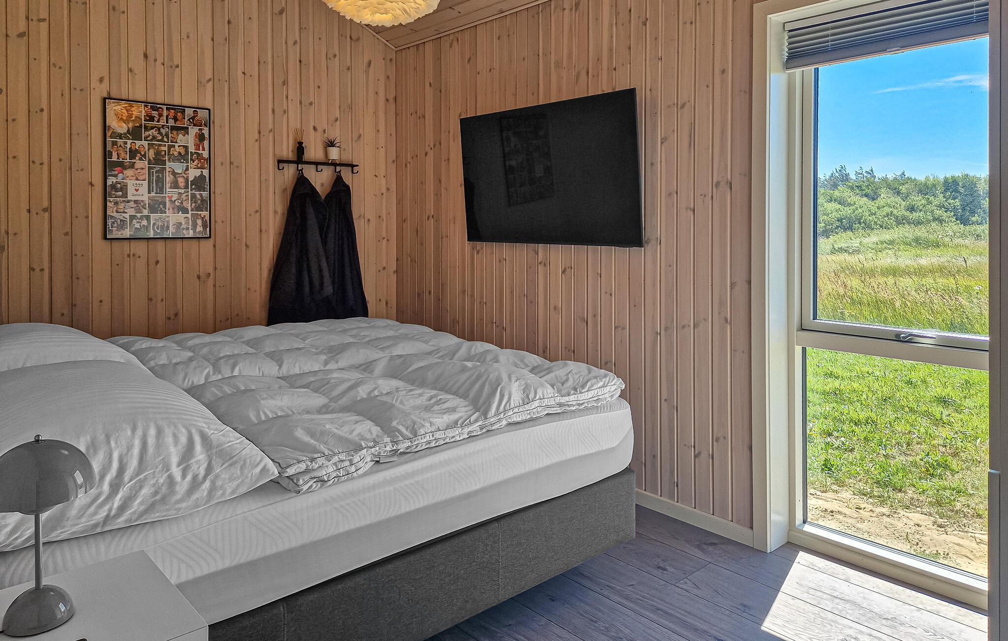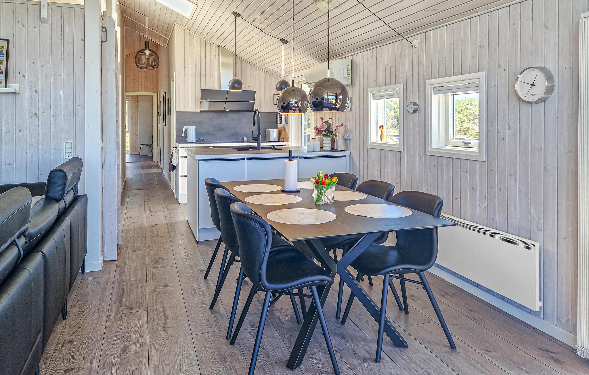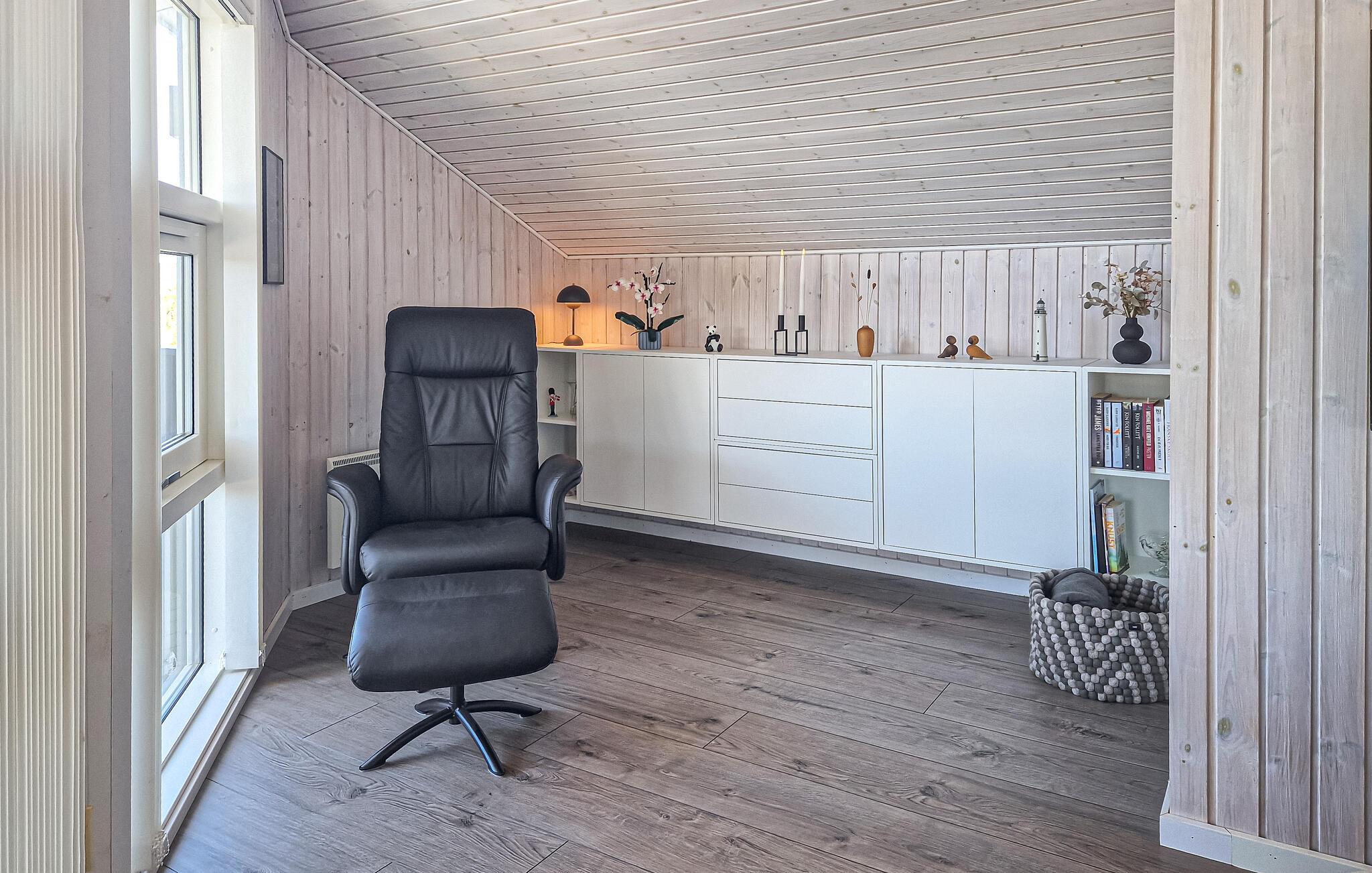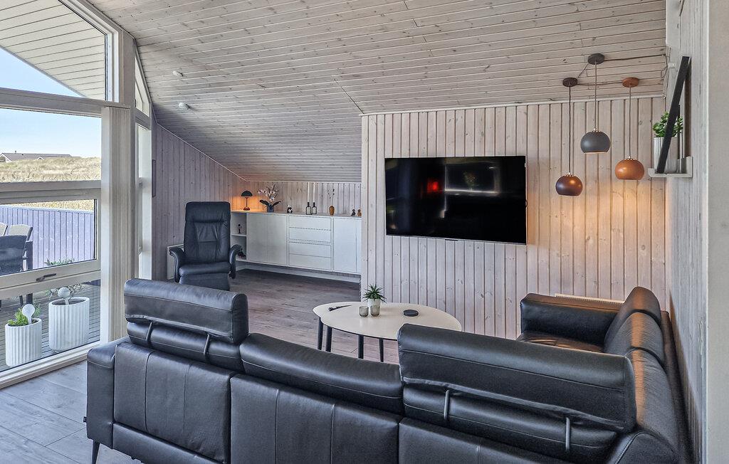 Bliv betaget af de lyse møbler og mange faciliteter i jeres feriehus. Træd ind i stuen med store vinduer og masser af naturligt lys. Gør det behageligt i sofaerne og Sæt jer til rette med en god film på det store tv. Brug spiseområdet med pejs til fælles måltider i stemningsfulde omgivelser. Lav mad i det moderne køkken, der er udstyret med rigelig bordplads og nyd det åbne design, der giver plads til hele familien.