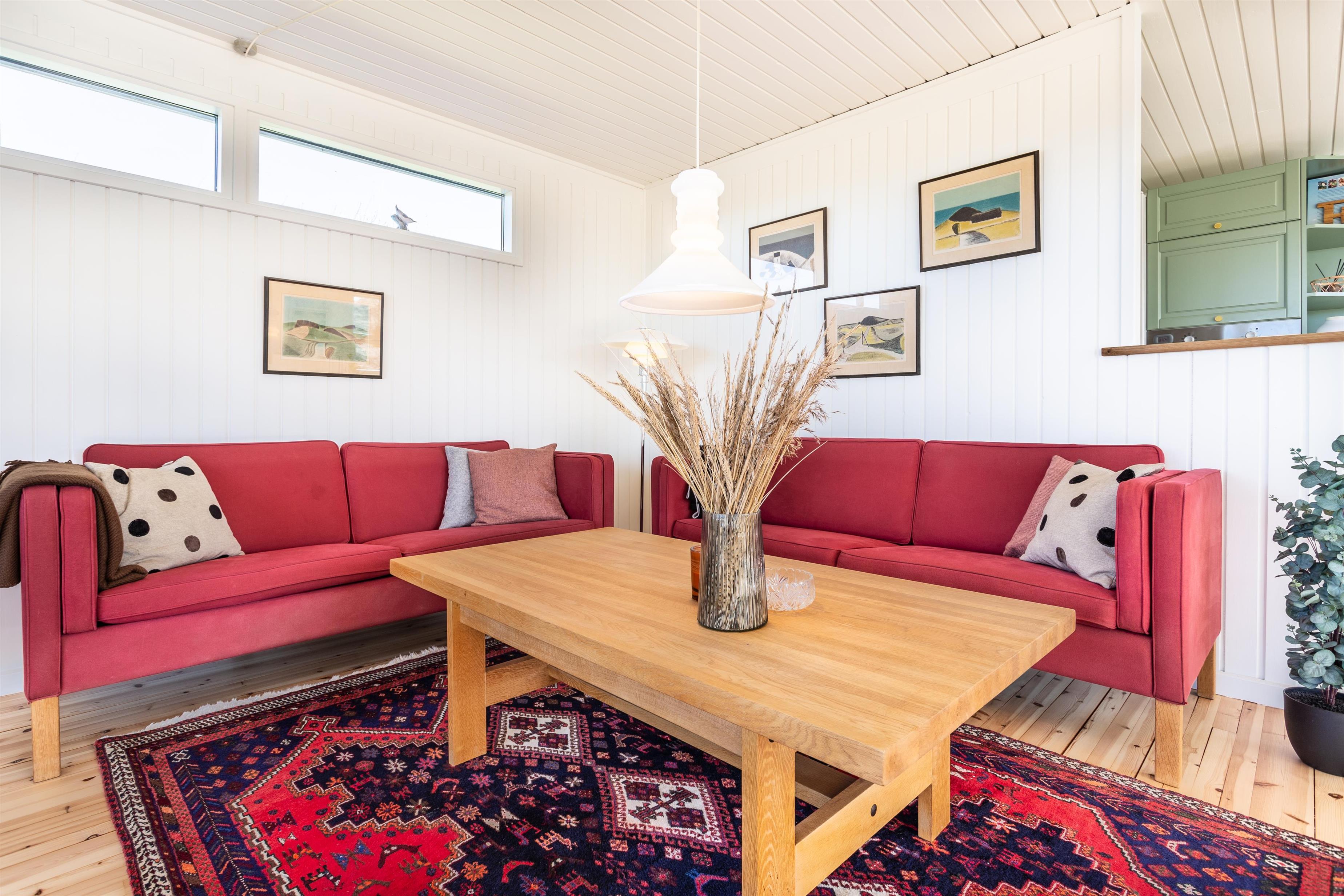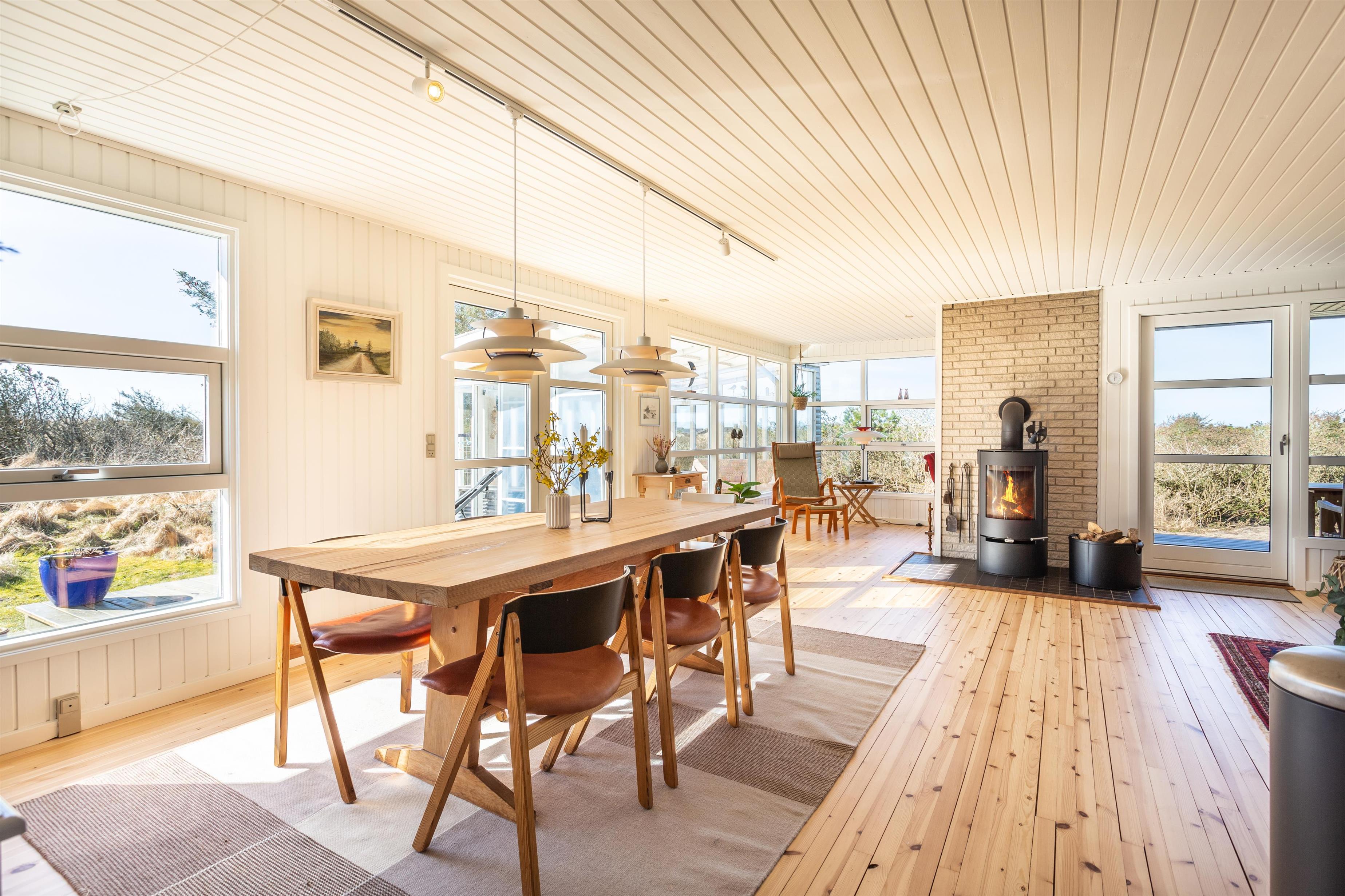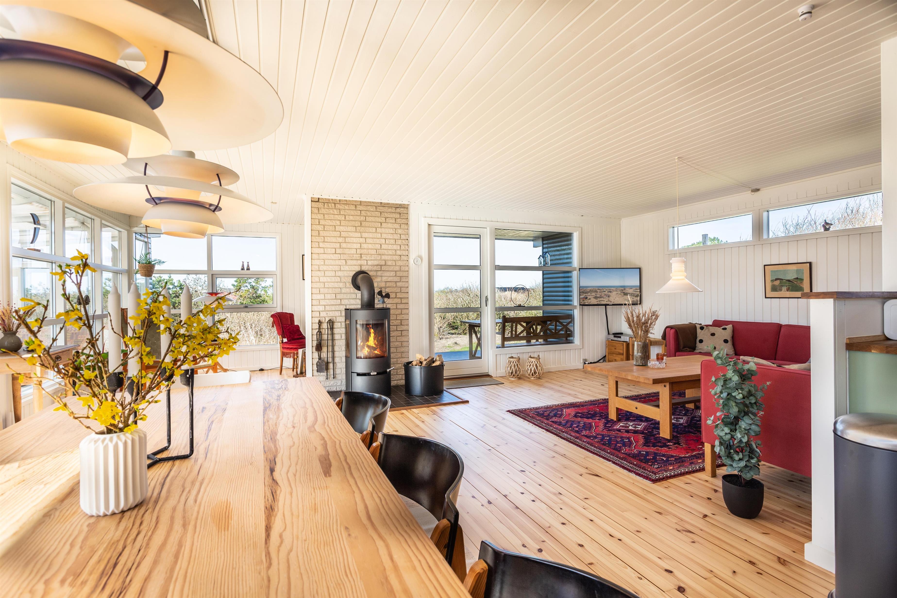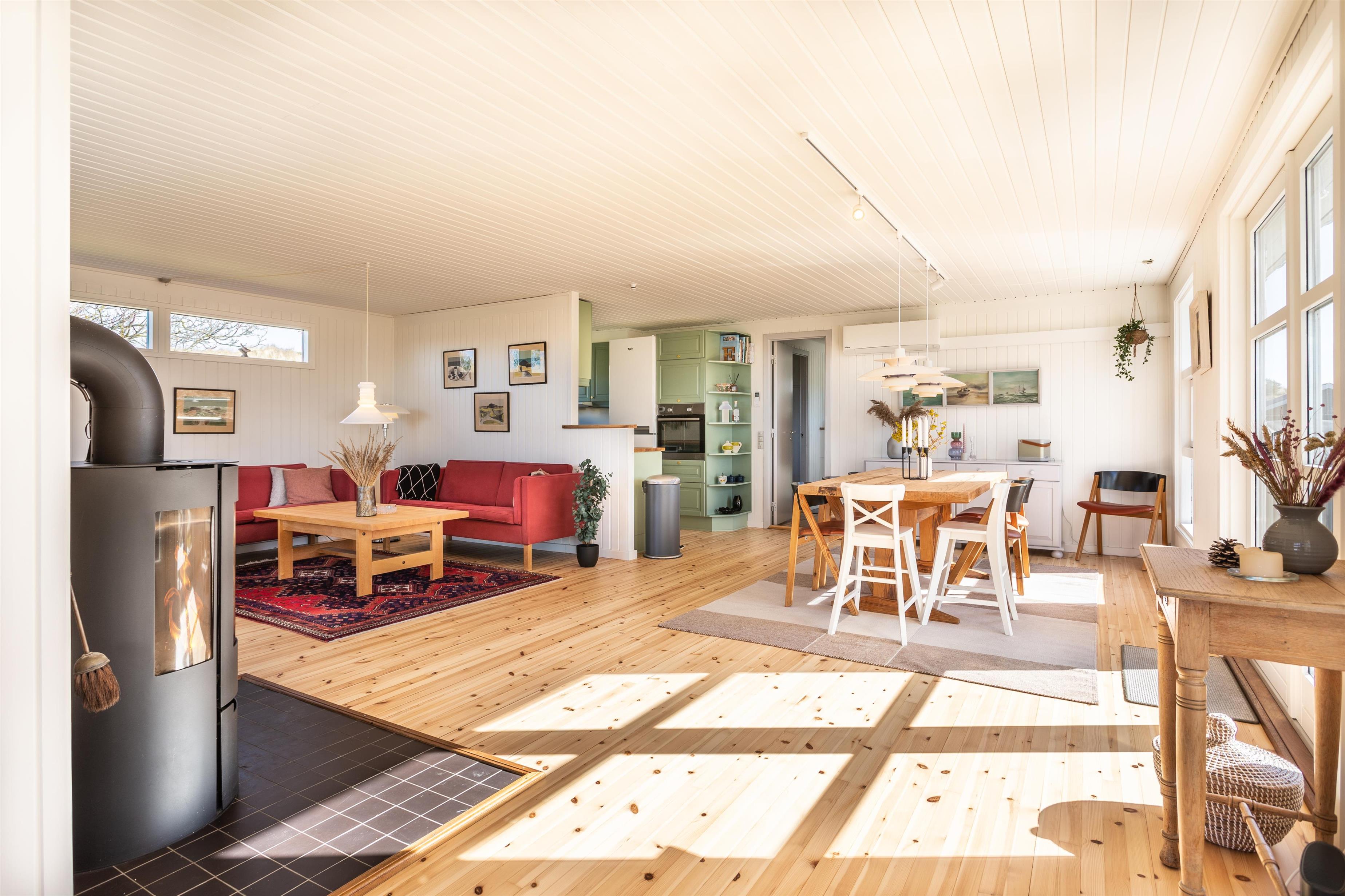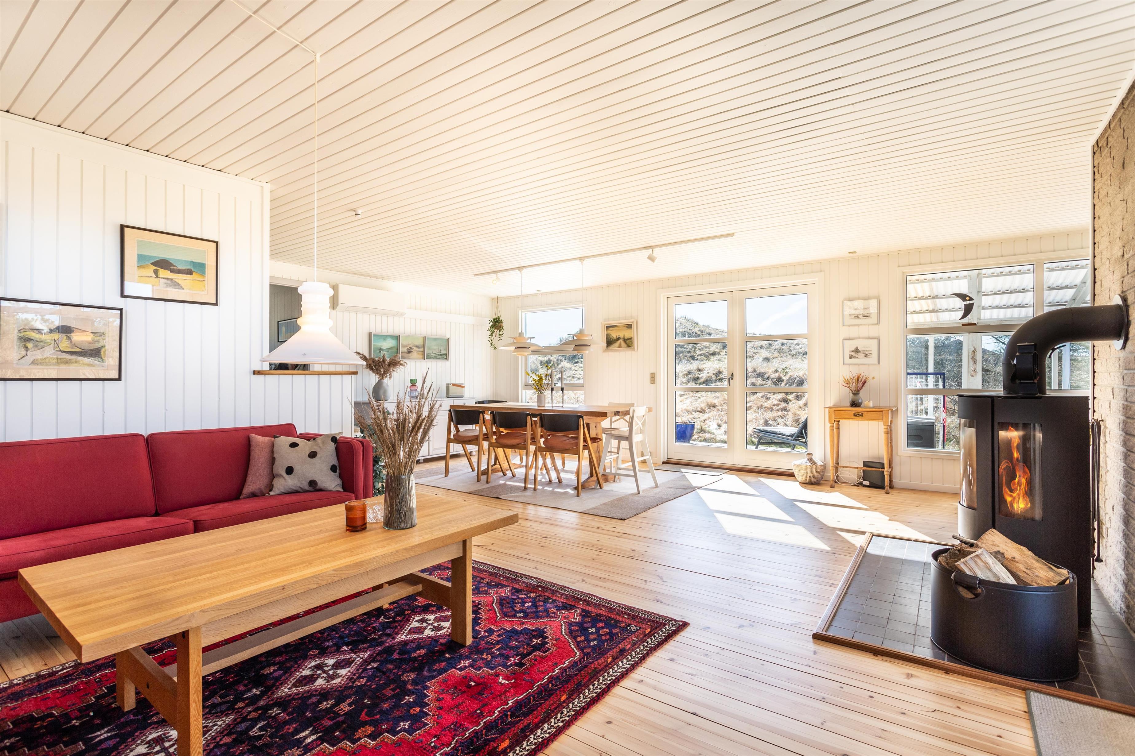 I feriehuset har I hele 82 velindrettede m2 at boltre jer på. Her bydes I indenfor i et dejlig stort og lyst opholdsrum, som ligger i åben forbindelse med husets køkken. Opholdsrummet har flere hyggelige kroge, hvortil man kan trække sig og for eksempel nyde en spændende bog. På de kølige aftener er brændeovnen med til at give ekstra lune og sommerhusstemning.