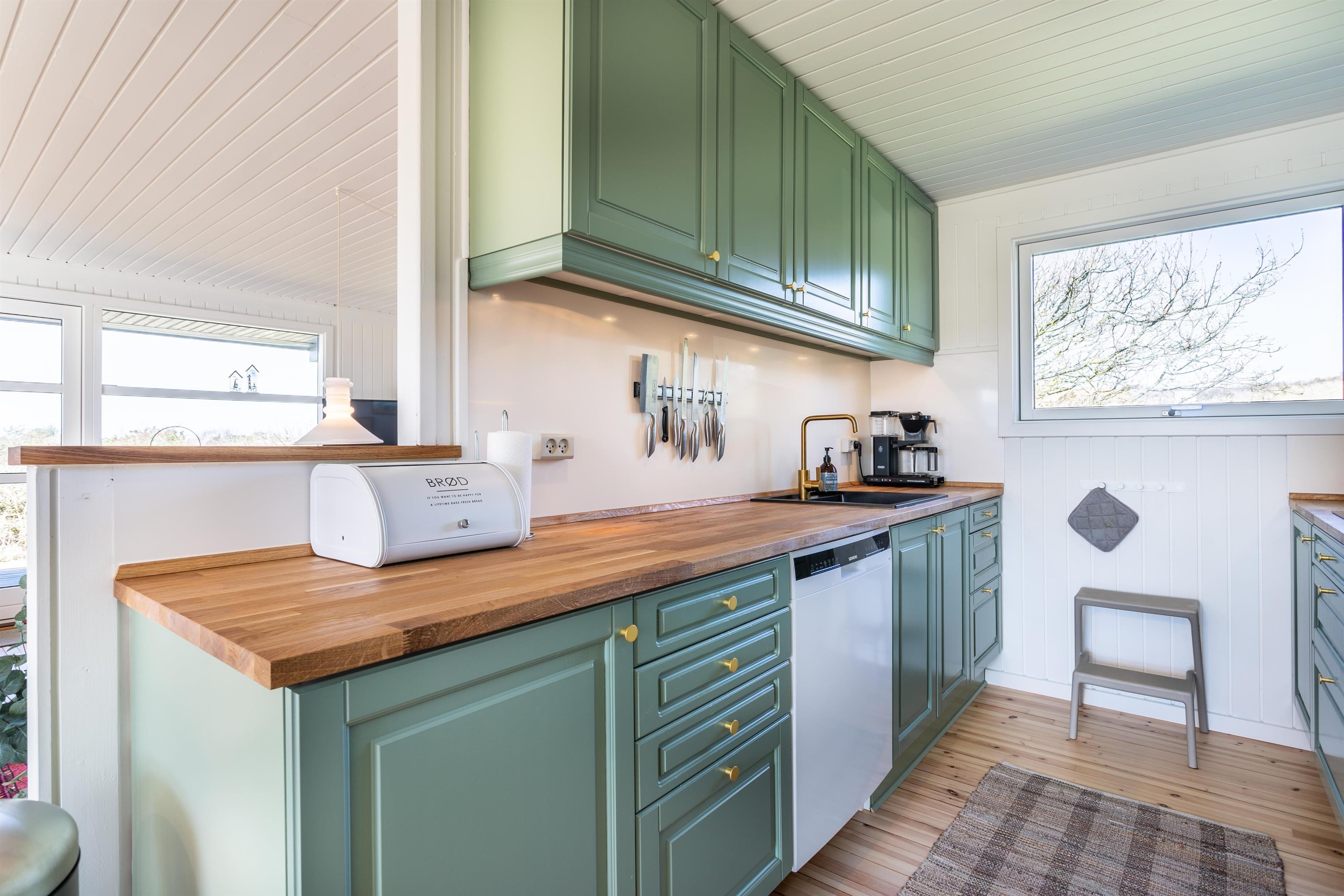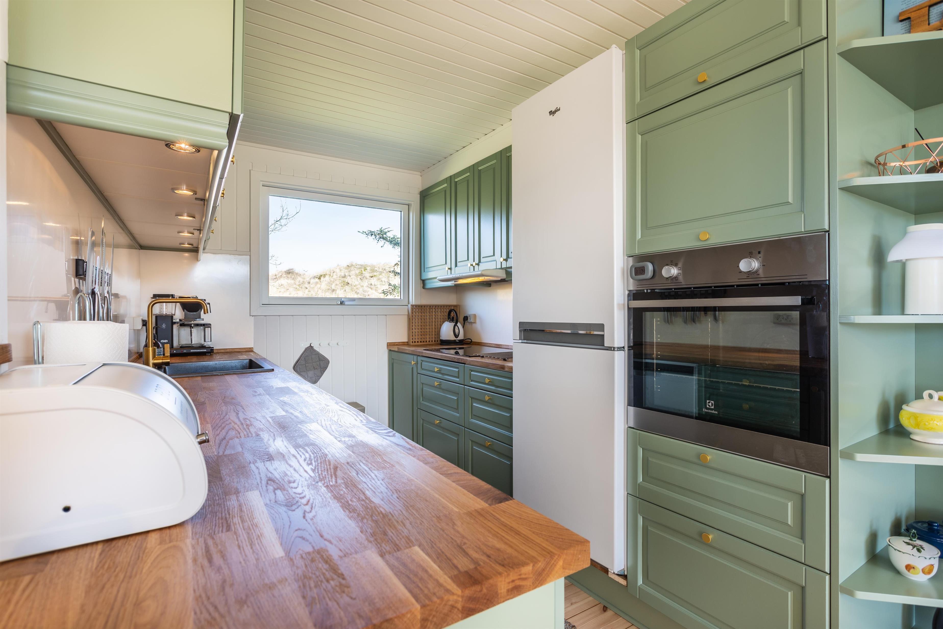 Det funktionelle køkken er med flotte elementer og har alle de faciliteter, der skal til for at gøre sommerhuslivet så behageligt som muligt. Om sommeren er det oplagt at slå dørene op til den lækre træterrasse og indtage middagen her.