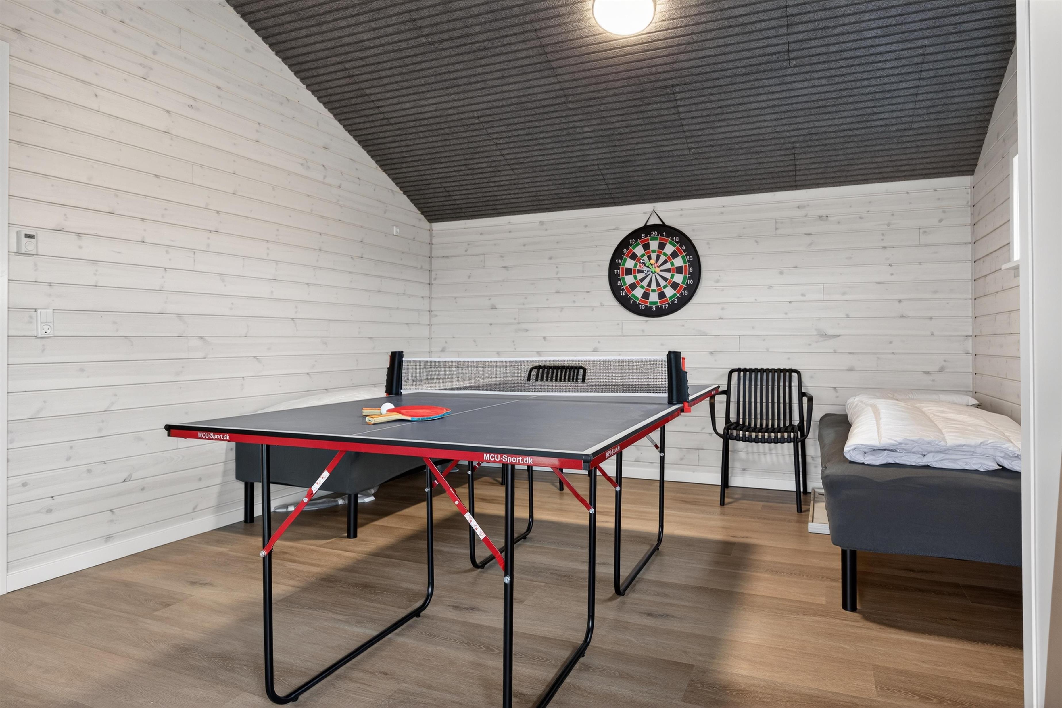 Som ekstra komfort byder feriehuset på to moderne badeværelser med bruseniche. Det ene har vaskemaskine, mens det andet har direkte adgang til den udendørs bruser – ideelt efter en dag ved stranden. Aktivitetsrummet indbyder til timevis af sjov med bordtennis, bob-spil, dart og brætspil.