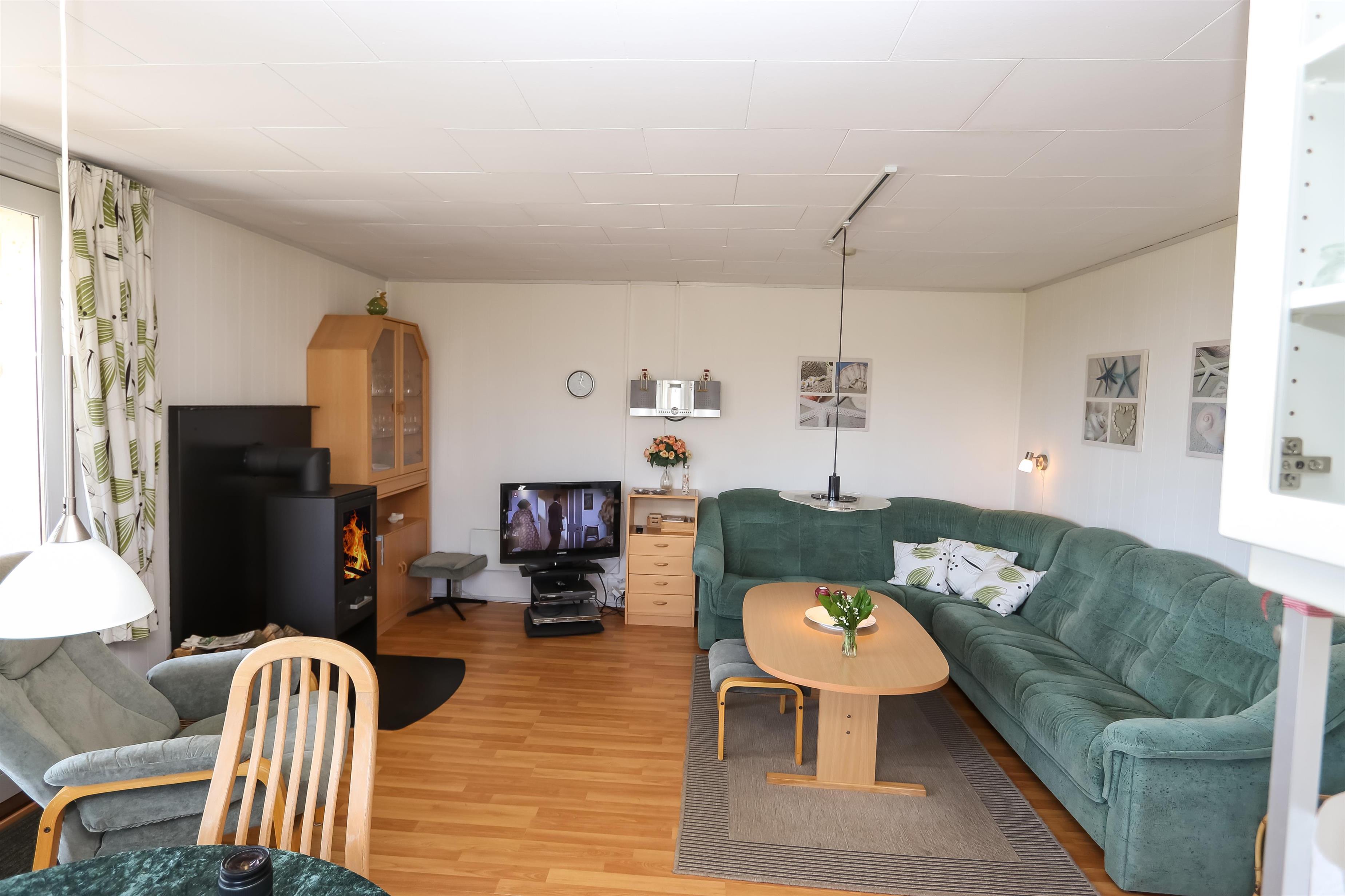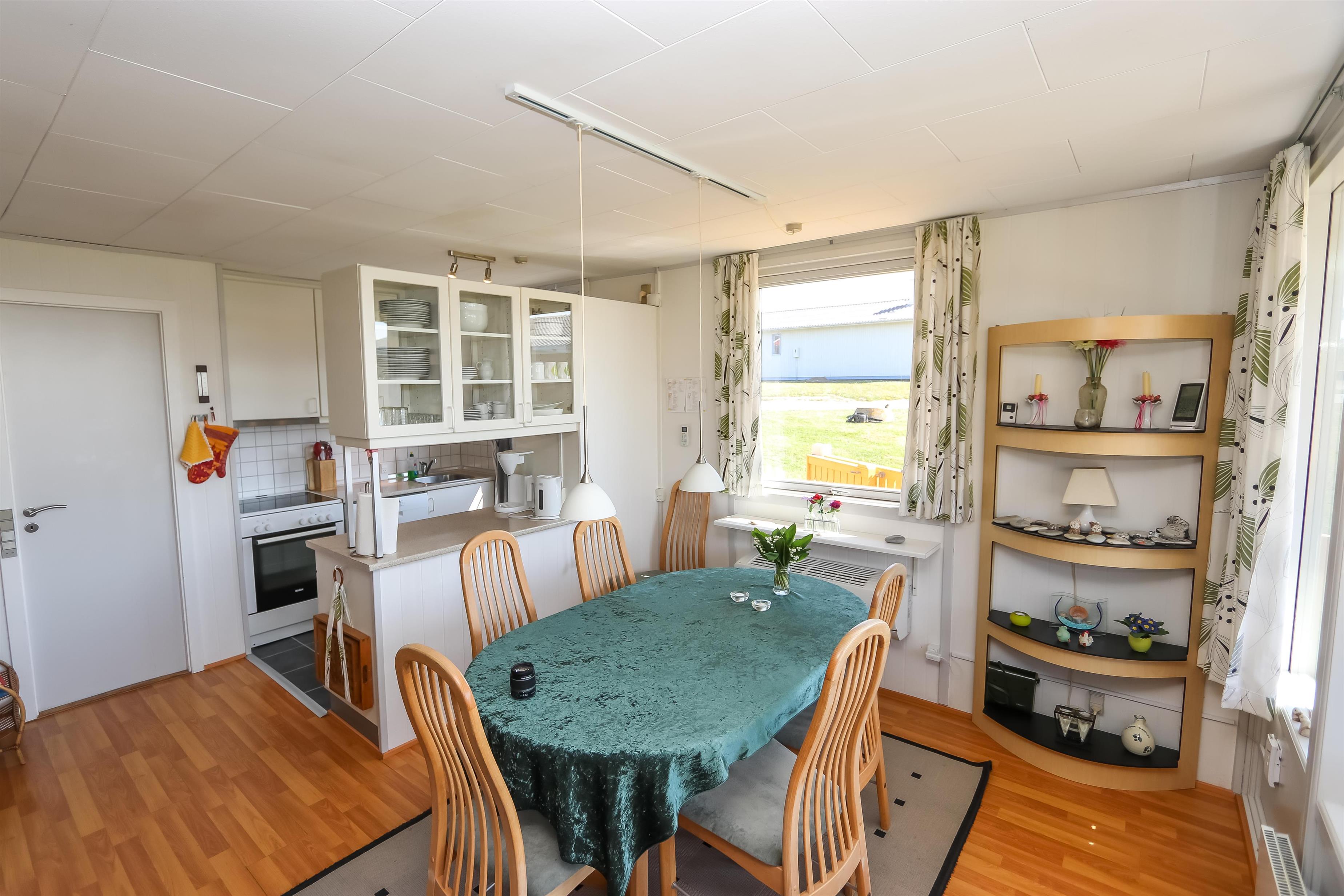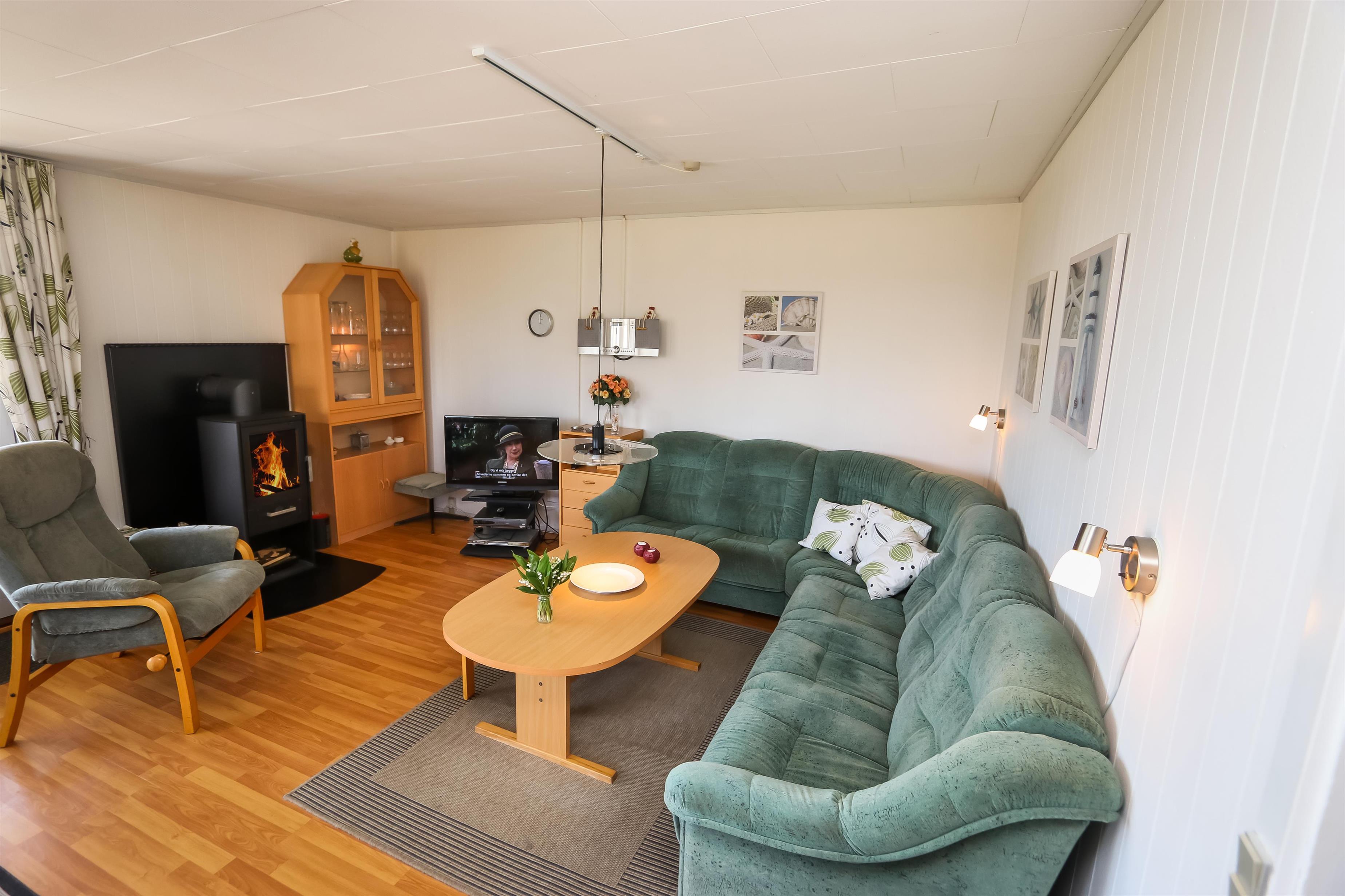 55 m2 træferiehus som er bygget i 1971 og delvis renoveret i 2015. 3 soveværelser (1DS, 1DS, 1KS). Kombineret opholdsstue og pænt, nyere køkkenhjørne. Lige på den anden side af køkkenhjørnet er spisebordet placeret. Herudover er der tv med danske og tyske kanaler, DVD/radio/CD. Varmepumpe og en dejlig brændeovn søger for en billig varmeregning og ekstra hygge. Pænt veludstyret køkkenhjørne med komfur med kogeplader og ovn, emhætte og køleskab med lille fryseboks. Flot badeværelse med toilet, bruser, håndvask, vaskemaskine og klinkegulv med gulvvarme. Fra stuen er er kig til Vesterhavet og klitterne. Der er trægulv i hele huset. Køle-/fryseskab i køjerummet. Ikke ryger hus. Max 1. husdyr tilladt.