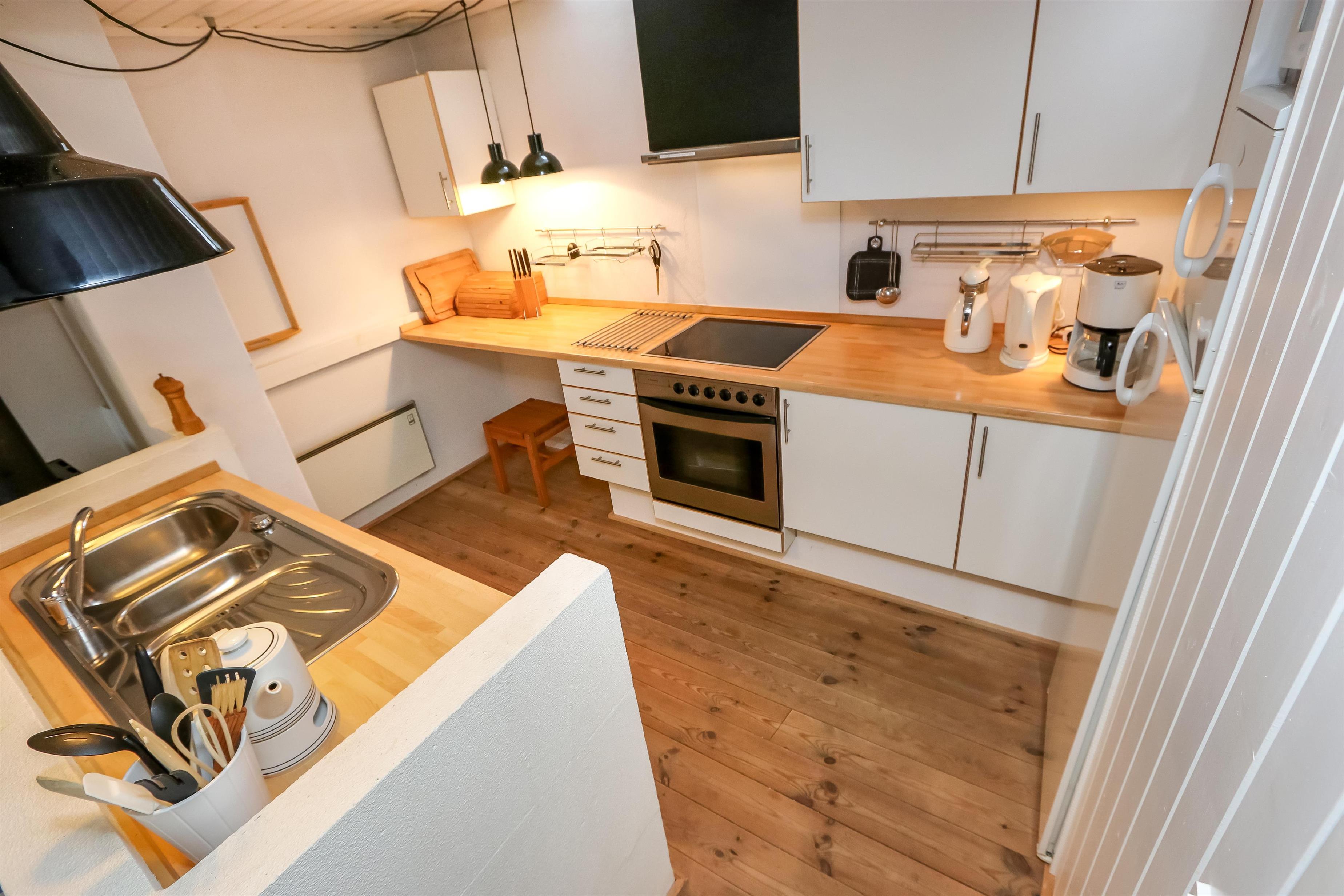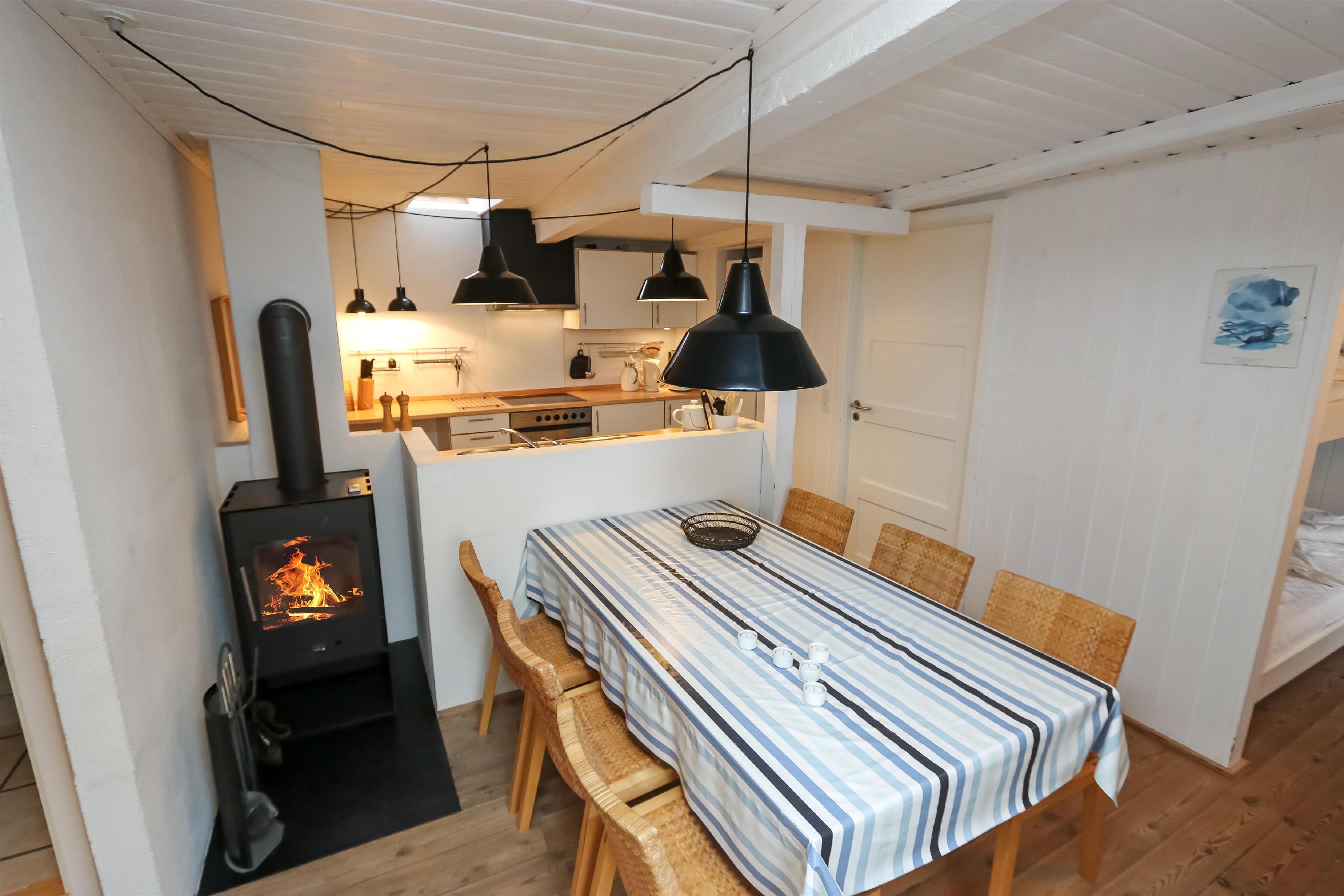 I stueetagen er der god plads til samvær. Her finder du entré, et lækkert badeværelse med gulvvarme, sauna og bruseniche – perfekt efter en lang gåtur langs stranden – samt et gæstetoilet med vaskemaskine og tørretumbler. Den hyggelige spisestue med brændeovn ligger i åben forbindelse med det veludstyrede køkken, hvor feriemåltiderne let kan tilberedes. Derudover er der soveværelse med dobbeltseng samt en praktisk indbygget etageseng. Overalt er der smukke træ- og klinkegulve, som understreger den varme atmosfære.
