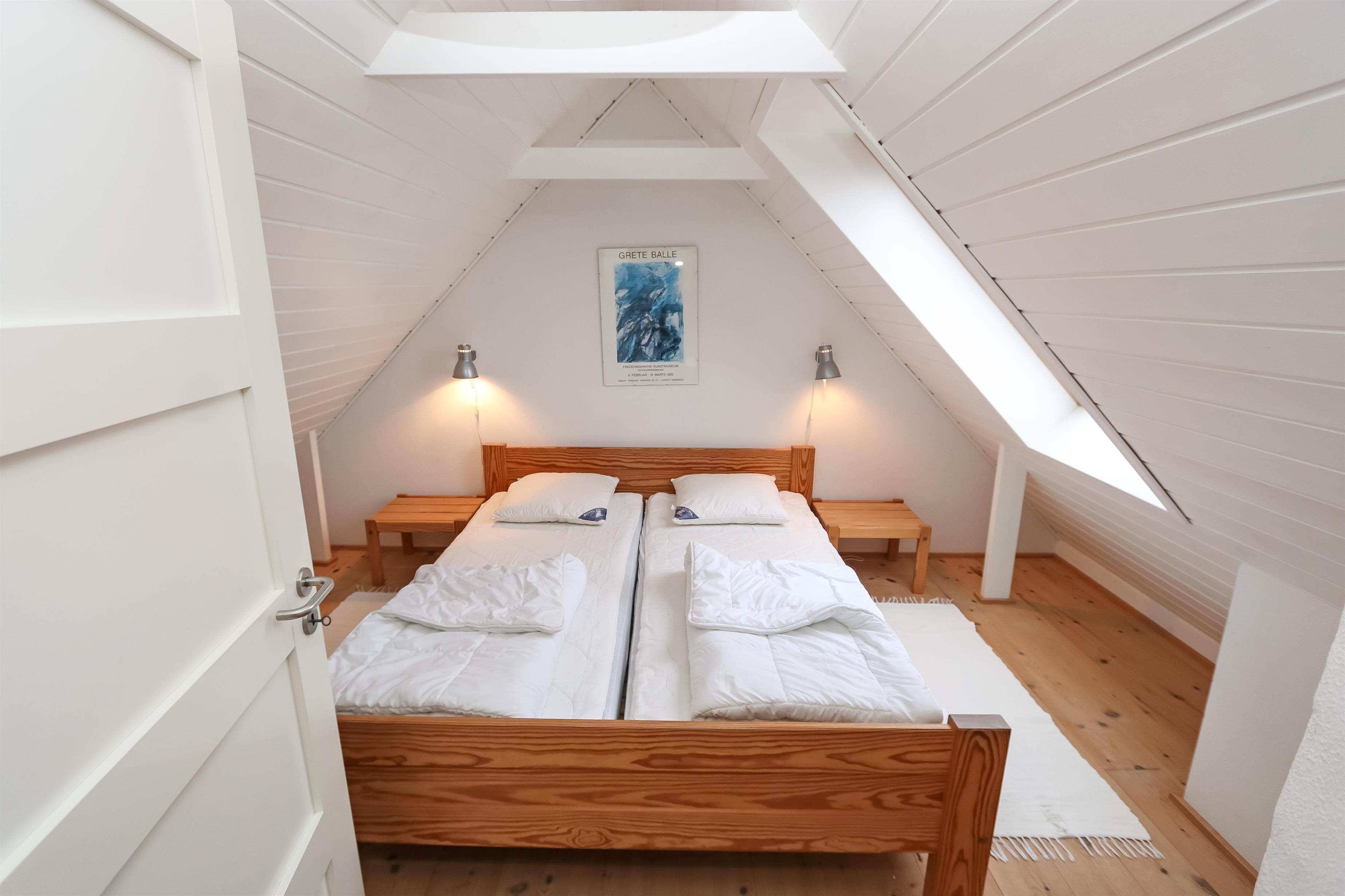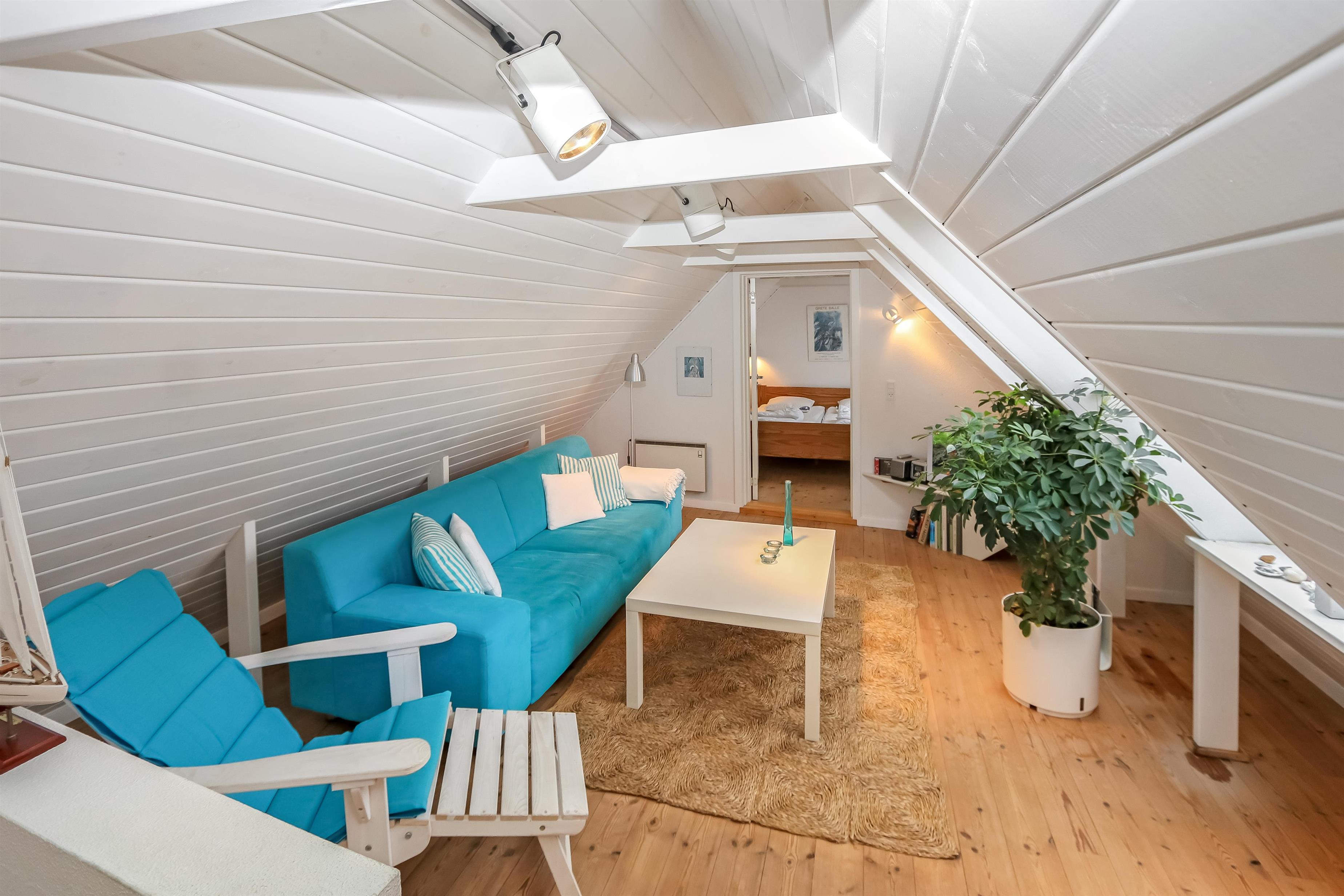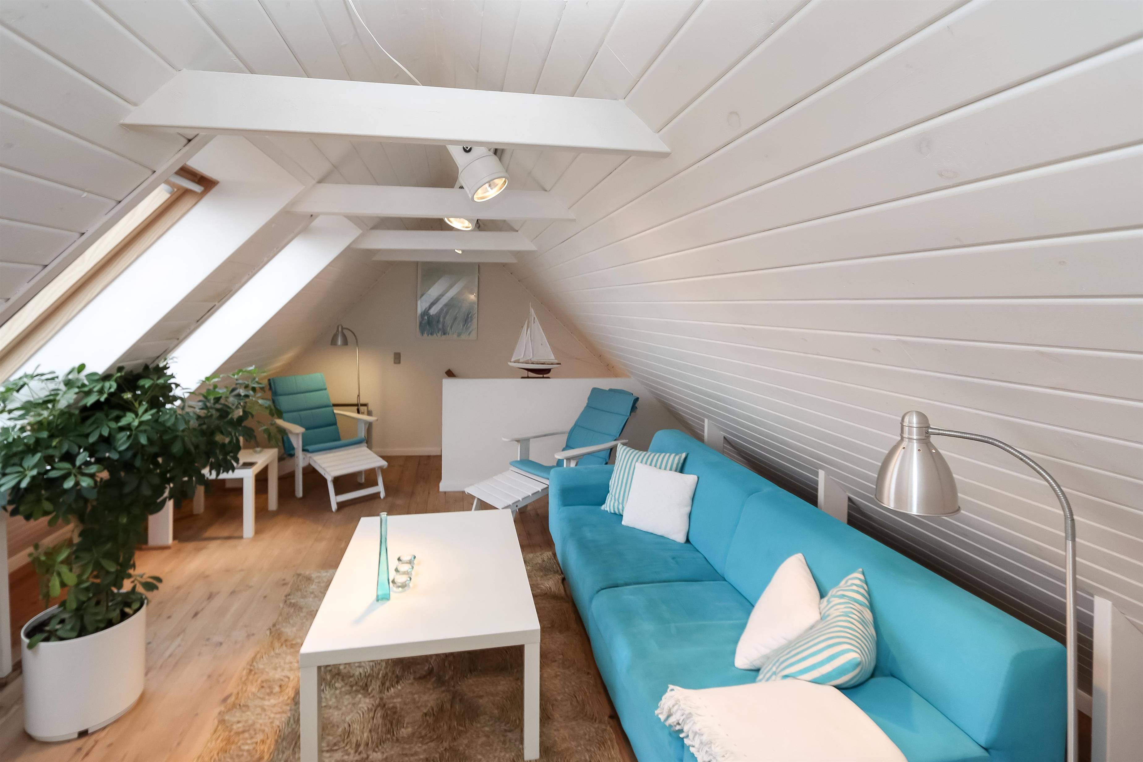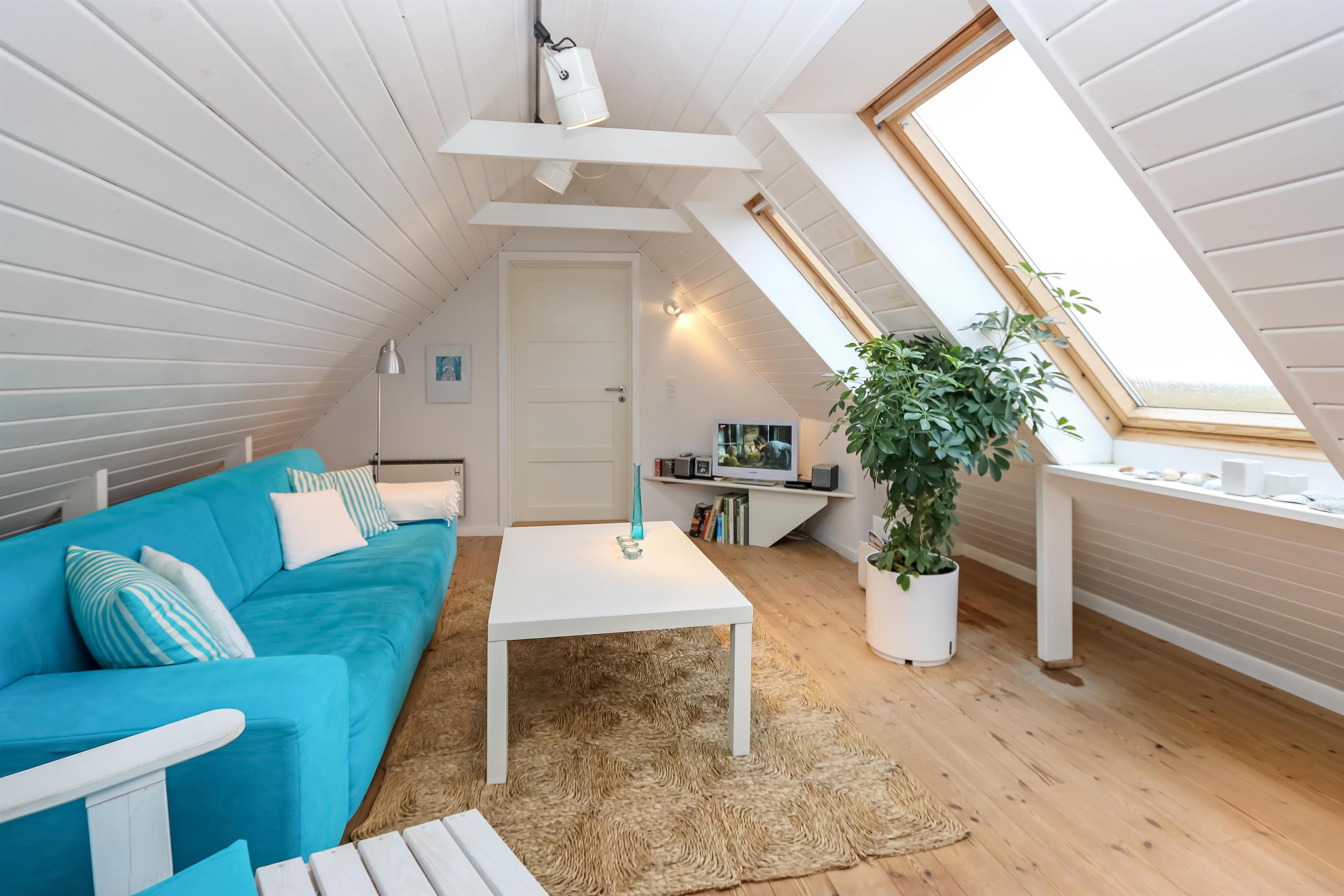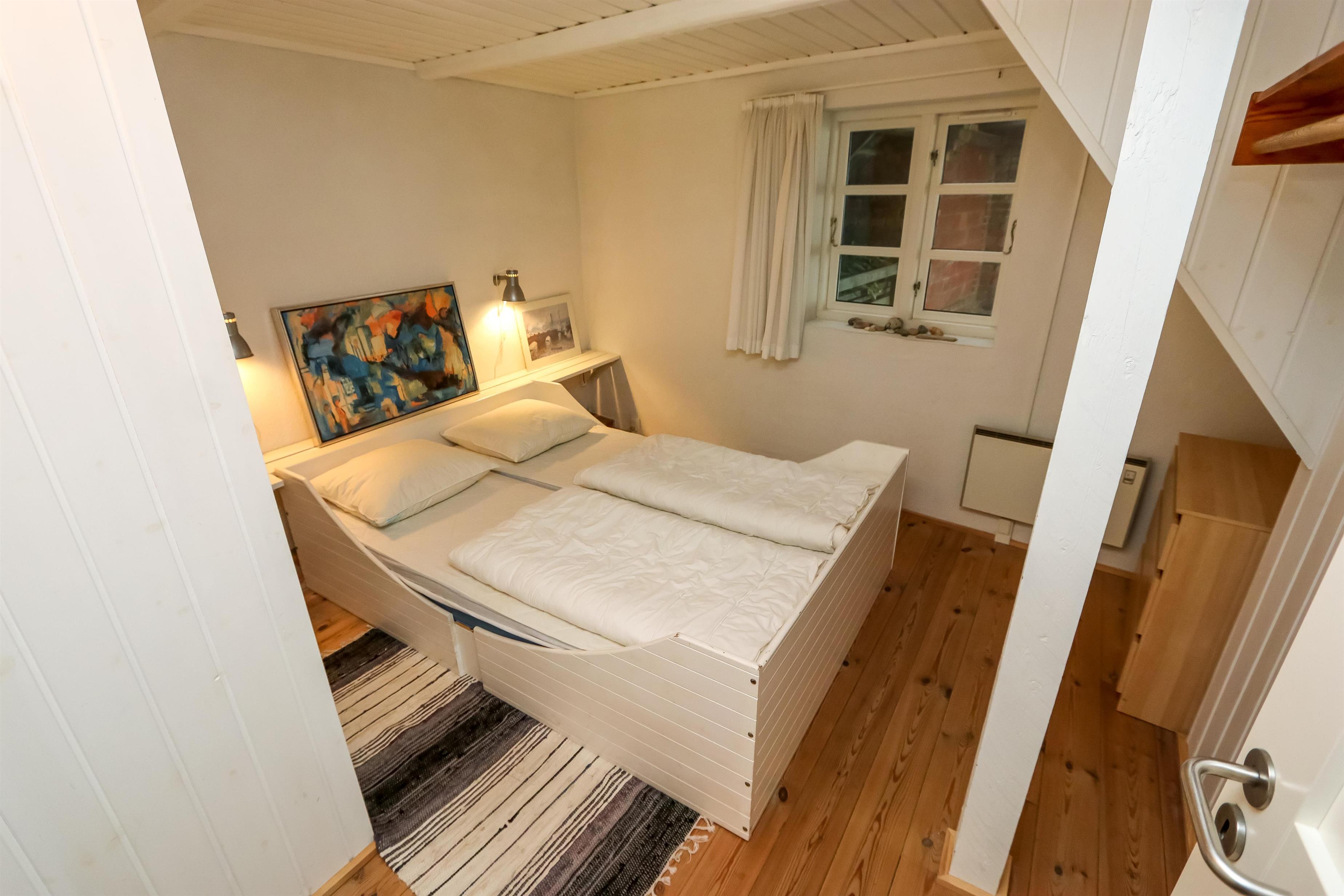 Indenfor mødes du af en lys og hyggelig indretning i moderne, nordisk stil. På 1. sal finder du både soveværelse med dobbeltseng og en dejlig opholdsstue – begge med skøn havudsigt, så du kan falde i søvn og vågne op til havets skiften. Stuen indbyder til afslapning med tv, DVD, parabol og stereoanlæg.