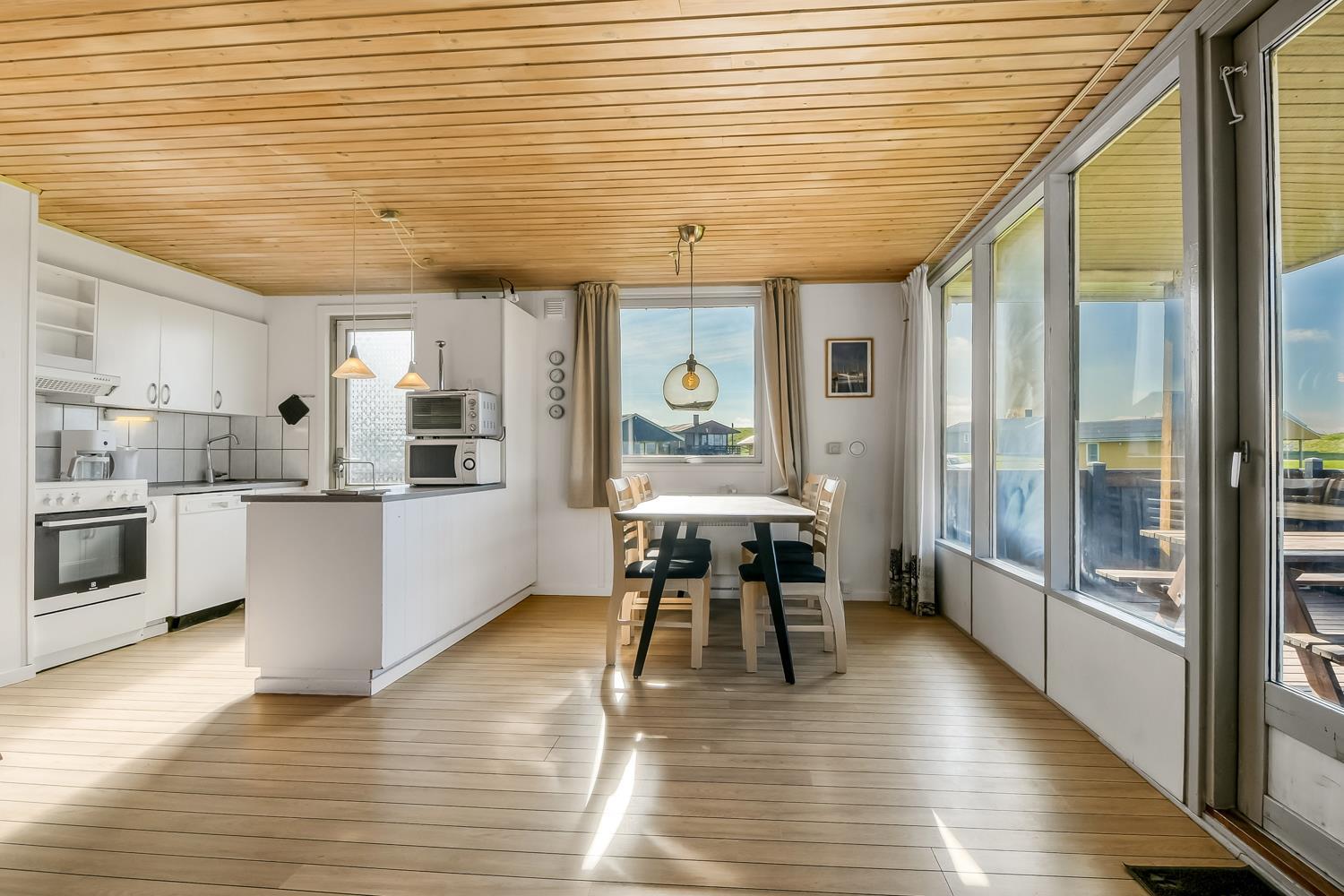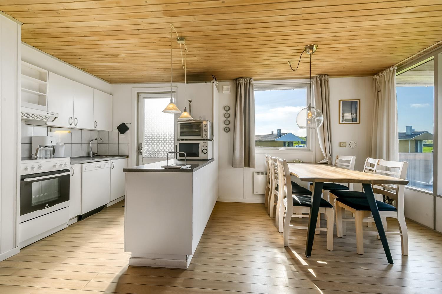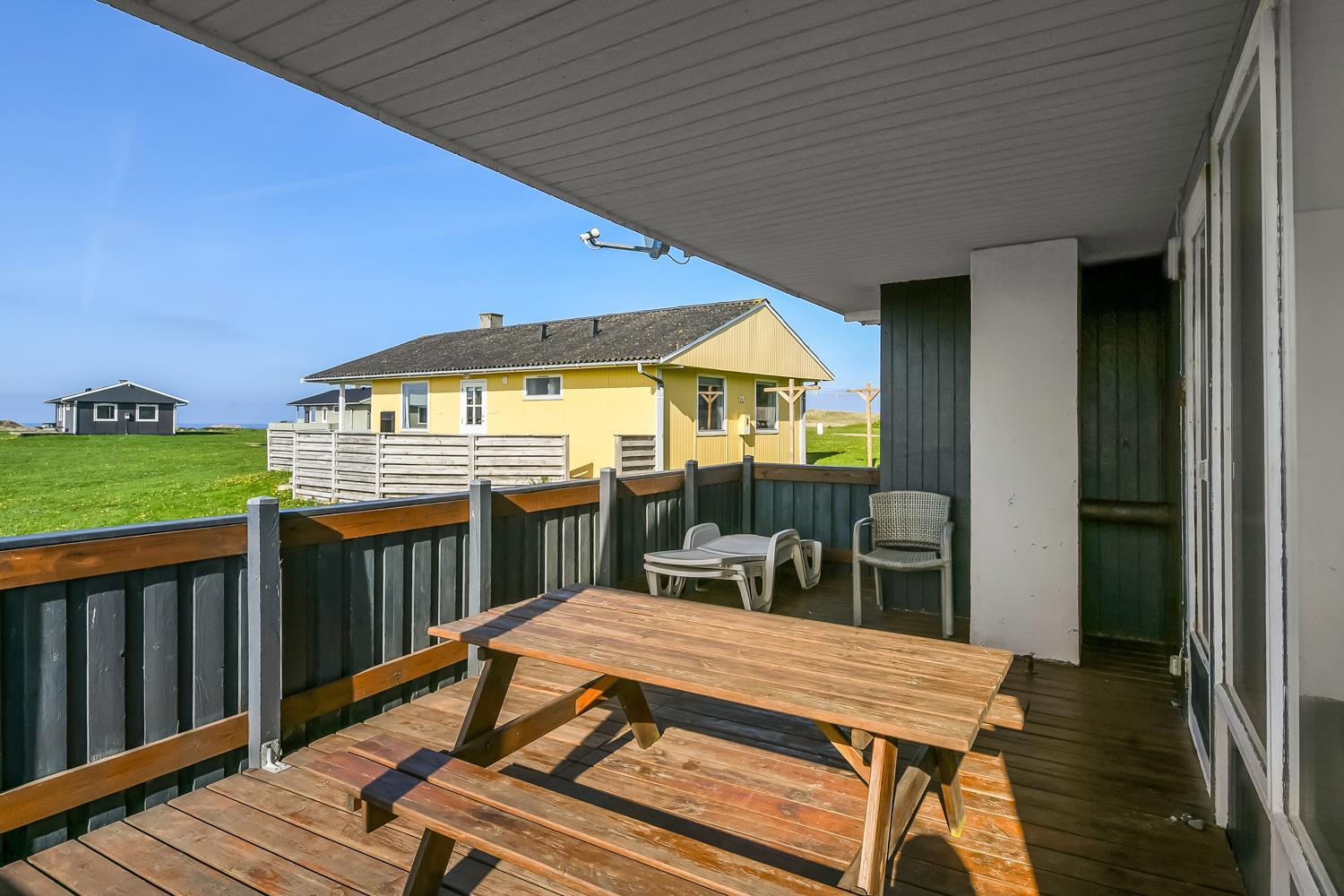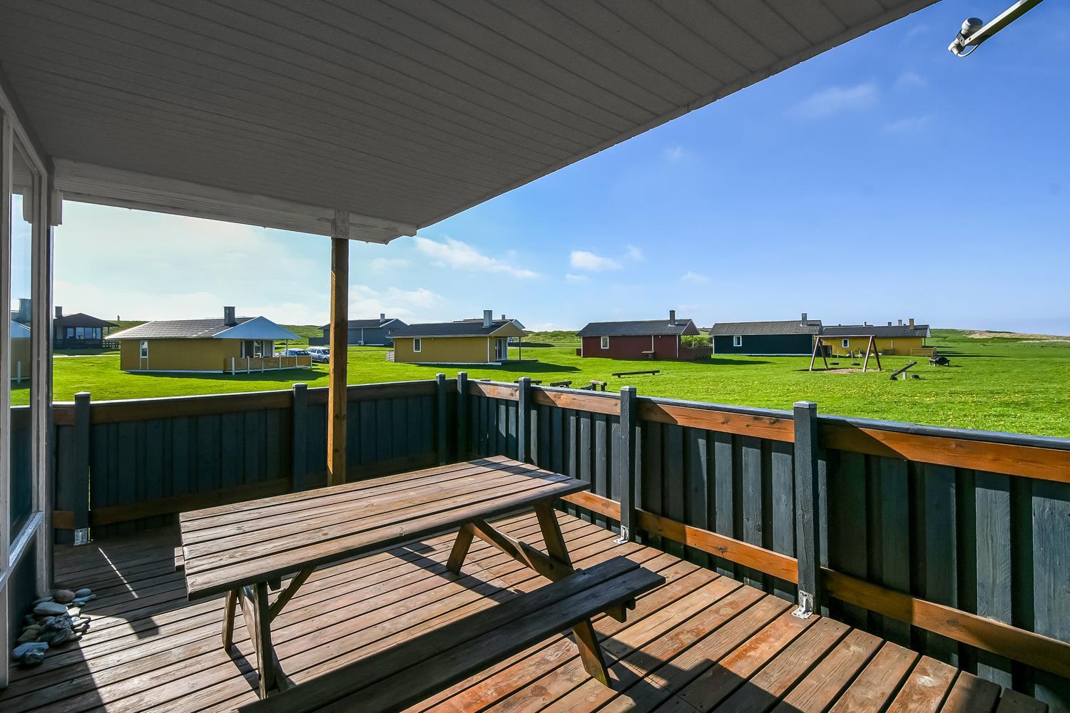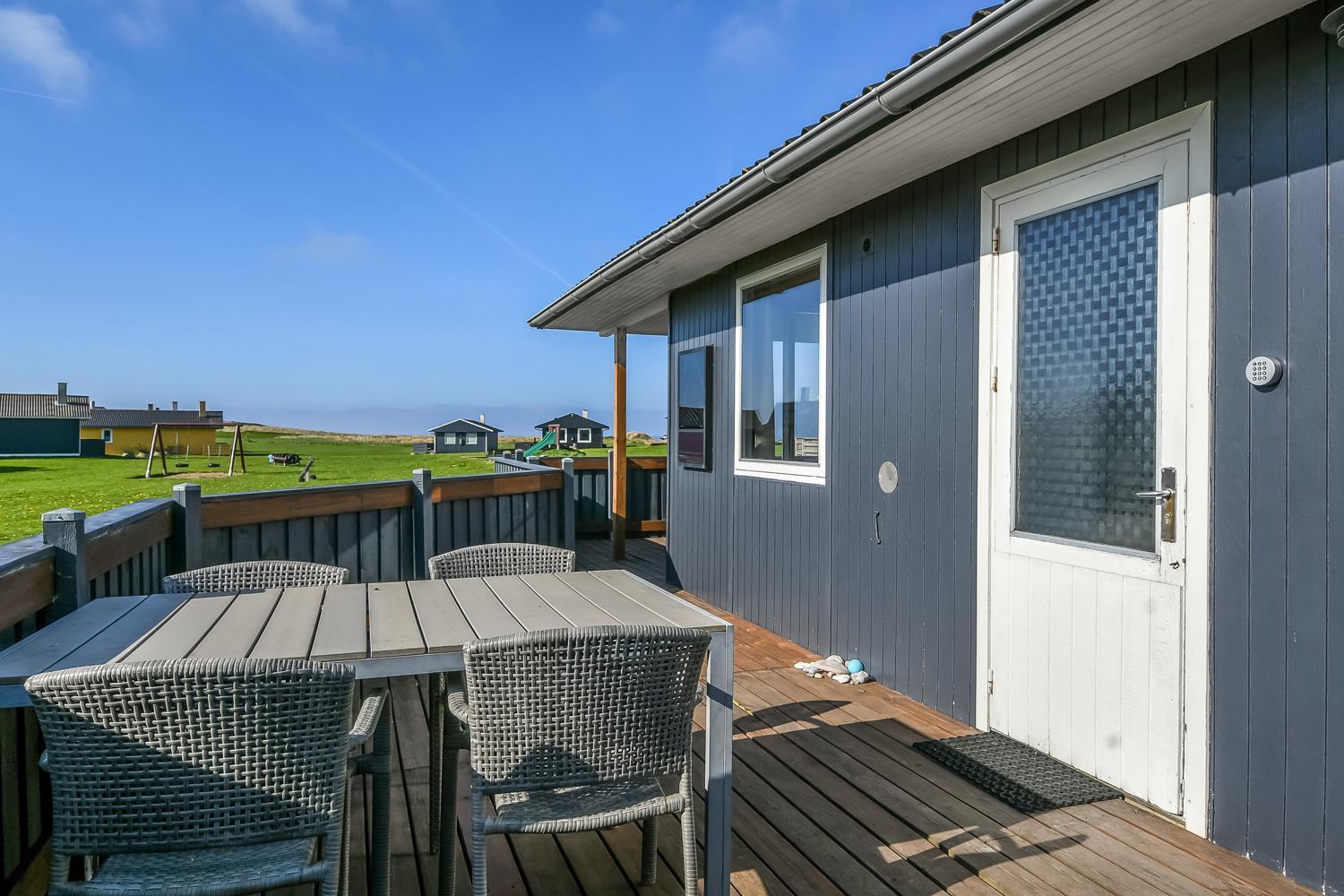 Udgang til delvis overdækket, indhegnet terrasse med massere af muligheder for at finde en plads i solen, da der er terrasser båd foran, bagved og langs medhuset som alle er forbundet og indhegnet. Udgang til terrasseanlægget såvel fra køkkenhjørnet som fra opholdsstuen. Nyd også at husets 700 m2 åbne naturgrund grund ligger lige op til dejligt fællesareal med legeplads med bla. ruchebane og vippe og en hyggelig bålplads. Huset ligger kun 100m fra Vesterhavet. Hold kondien ved lige med en gåtur i det bakkede landskab eller gå en tur ved Vesterhavet som hver dag byder på en ny oplevelse. Hyggeligt og særdeles velholdt feriehus som danner den perfekte ramme om ferien i et unikt og rolig feriehusområde