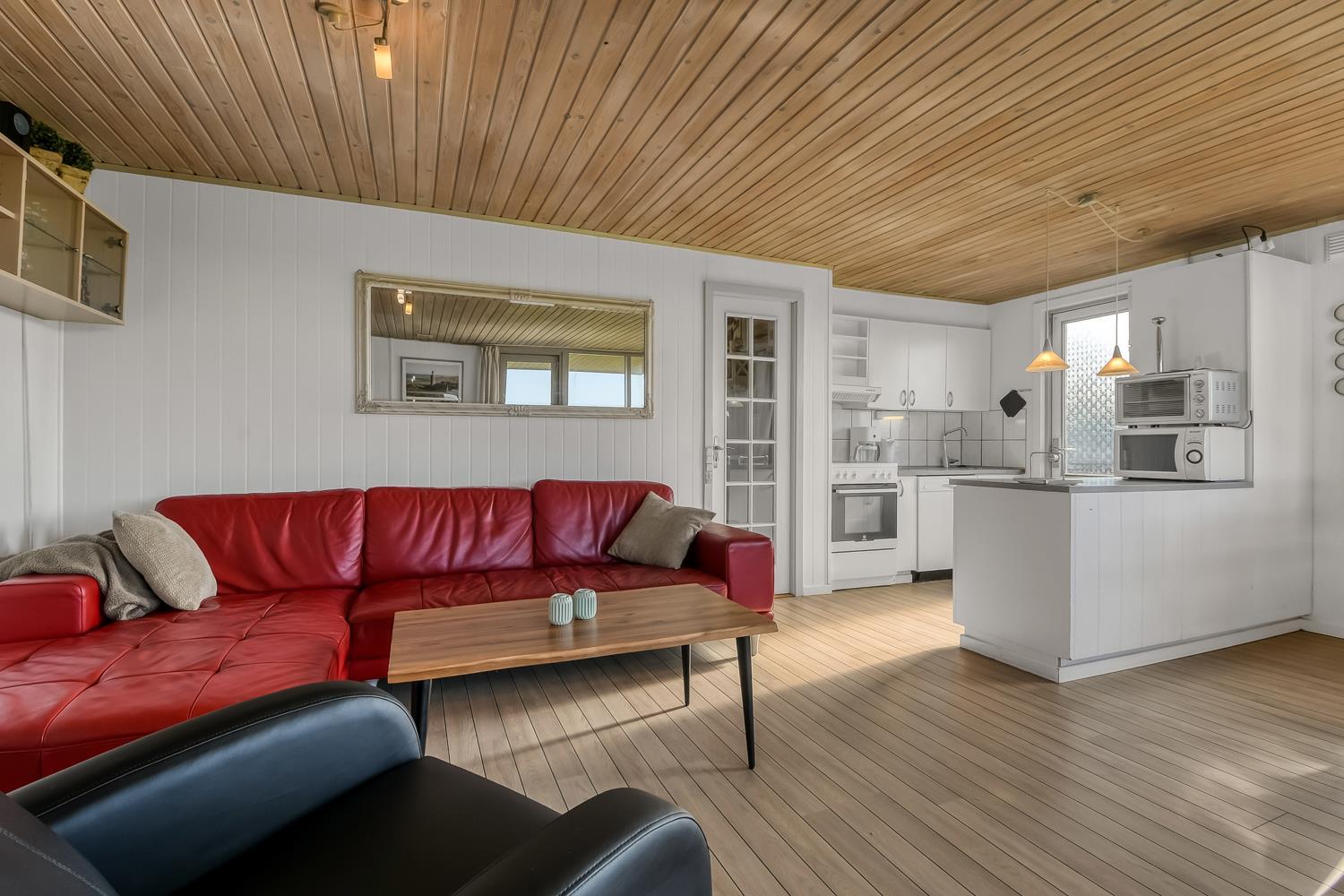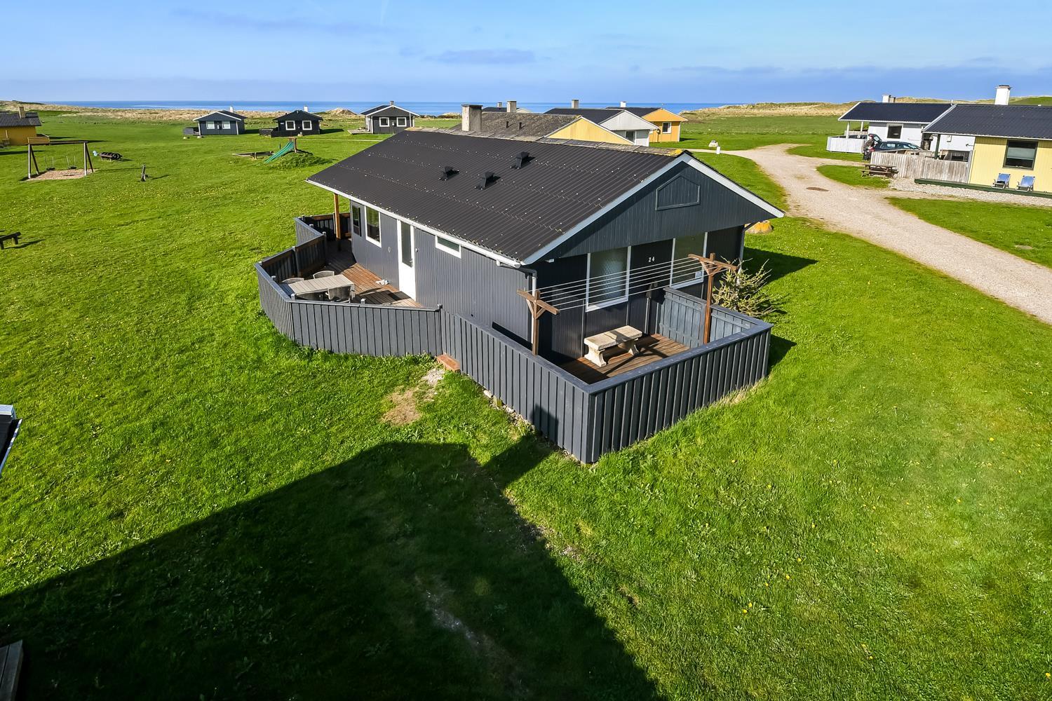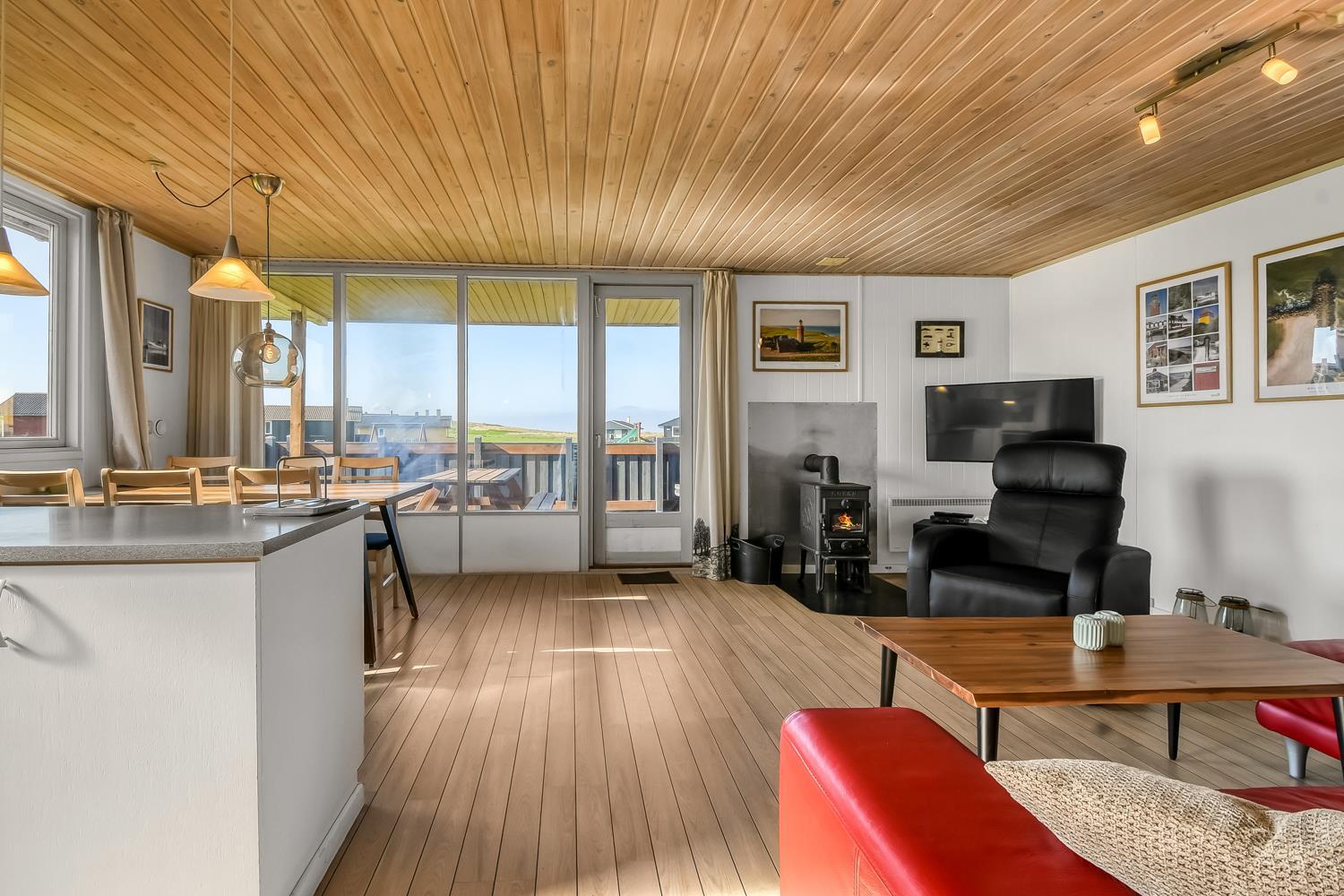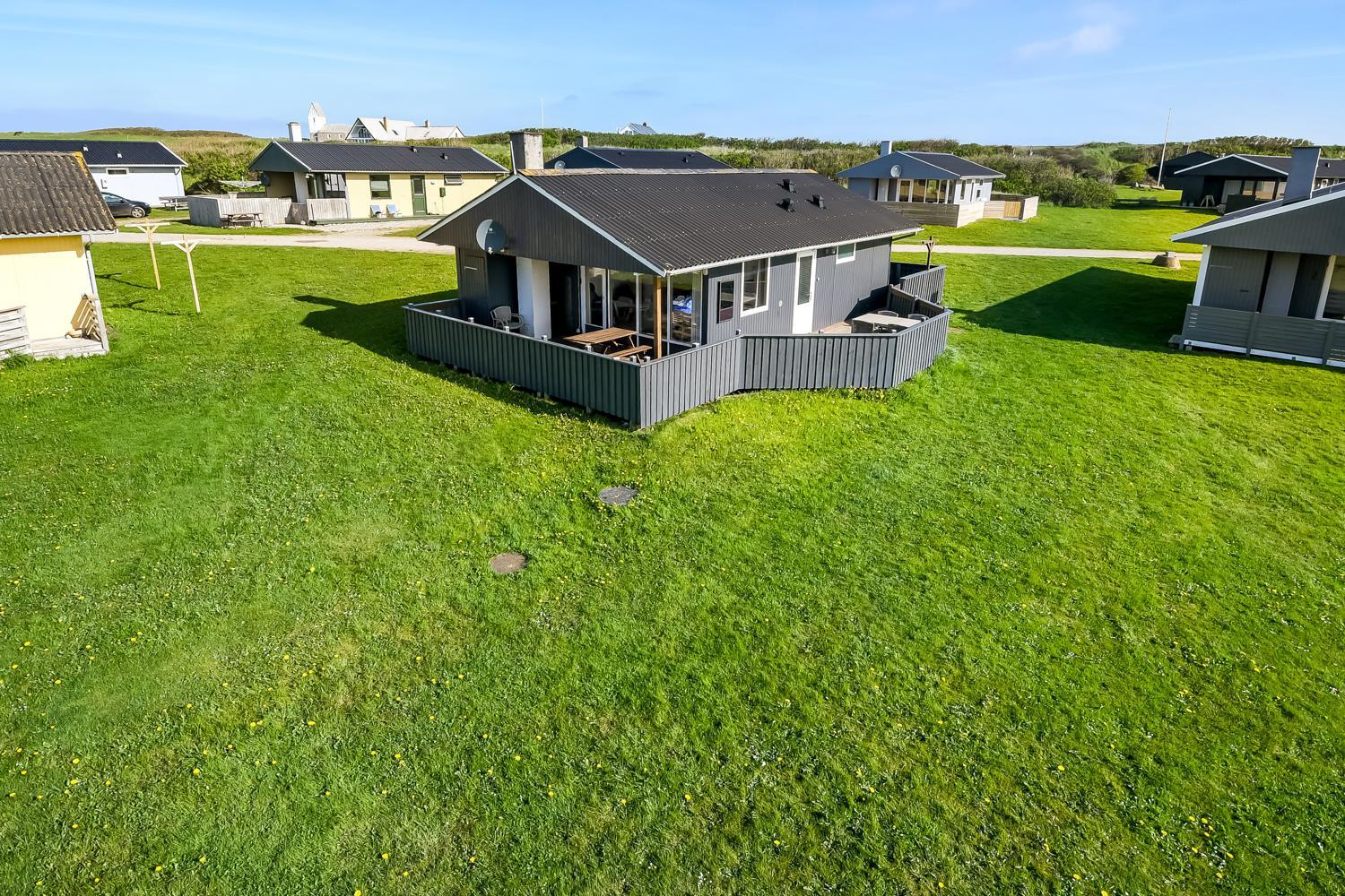 Udgang til delvis overdækket, indhegnet terrasse med massere af muligheder for at finde en plads i solen, da der er terrasser båd foran, bagved og langs medhuset som alle er forbundet og indhegnet. Udgang til terrasseanlægget såvel fra køkkenhjørnet som fra opholdsstuen. Nyd også at husets 700 m2 åbne naturgrund grund ligger lige op til dejligt fællesareal med legeplads med bla. ruchebane og vippe og en hyggelig bålplads. Huset ligger kun 100m fra Vesterhavet. Hold kondien ved lige med en gåtur i det bakkede landskab eller gå en tur ved Vesterhavet som hver dag byder på en ny oplevelse. Hyggeligt og særdeles velholdt feriehus som danner den perfekte ramme om ferien i et unikt og rolig feriehusområde