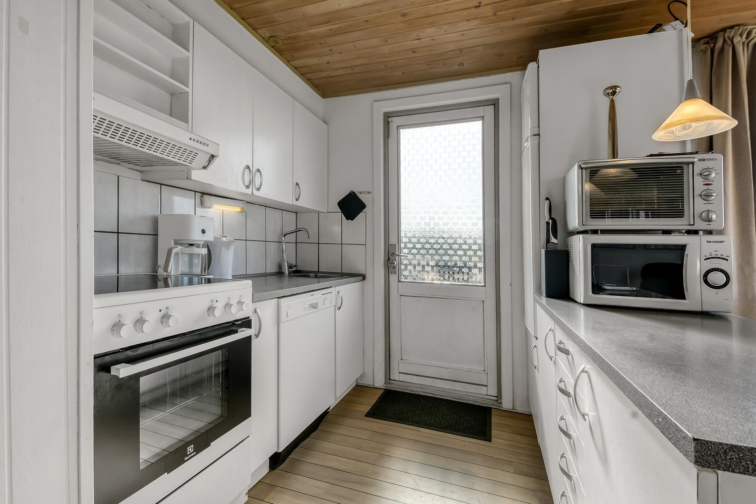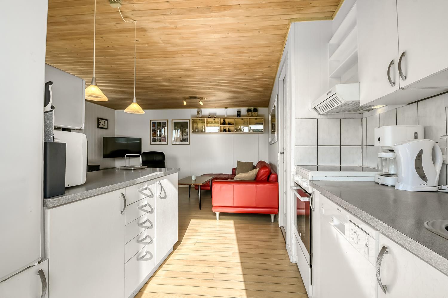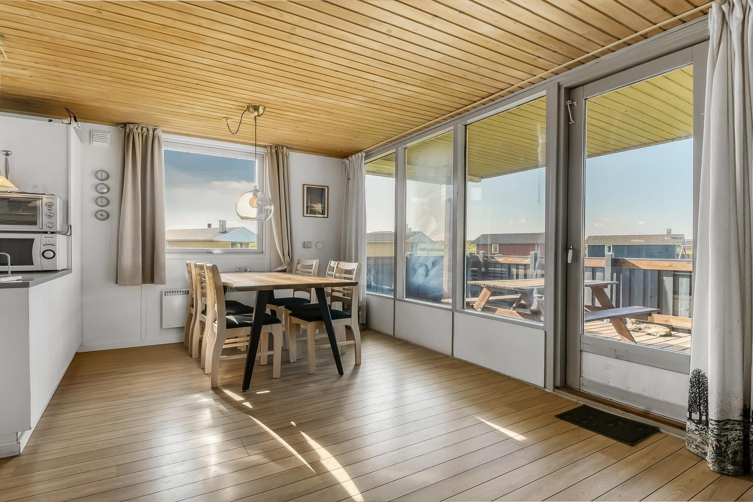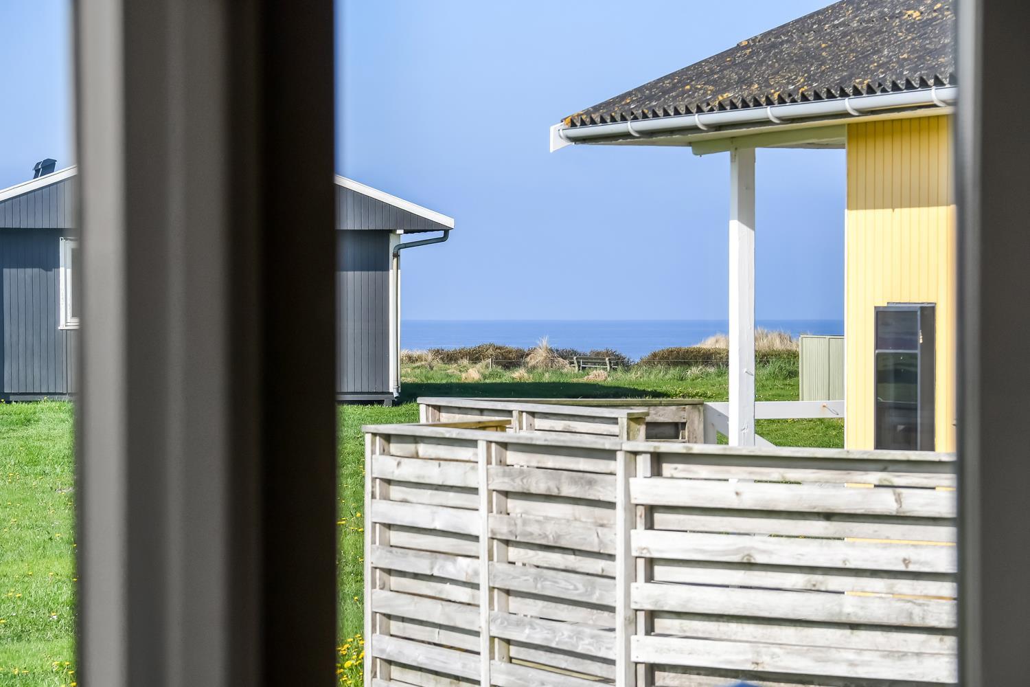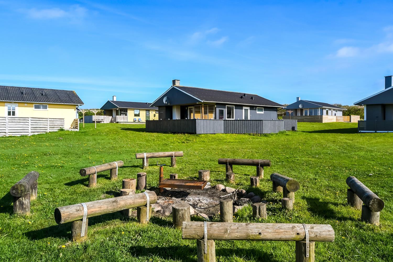 Udgang til delvis overdækket, indhegnet terrasse med massere af muligheder for at finde en plads i solen, da der er terrasser båd foran, bagved og langs medhuset som alle er forbundet og indhegnet. Udgang til terrasseanlægget såvel fra køkkenhjørnet som fra opholdsstuen. Nyd også at husets 700 m2 åbne naturgrund grund ligger lige op til dejligt fællesareal med legeplads med bla. ruchebane og vippe og en hyggelig bålplads. Huset ligger kun 100m fra Vesterhavet. Hold kondien ved lige med en gåtur i det bakkede landskab eller gå en tur ved Vesterhavet som hver dag byder på en ny oplevelse. Hyggeligt og særdeles velholdt feriehus som danner den perfekte ramme om ferien i et unikt og rolig feriehusområde
