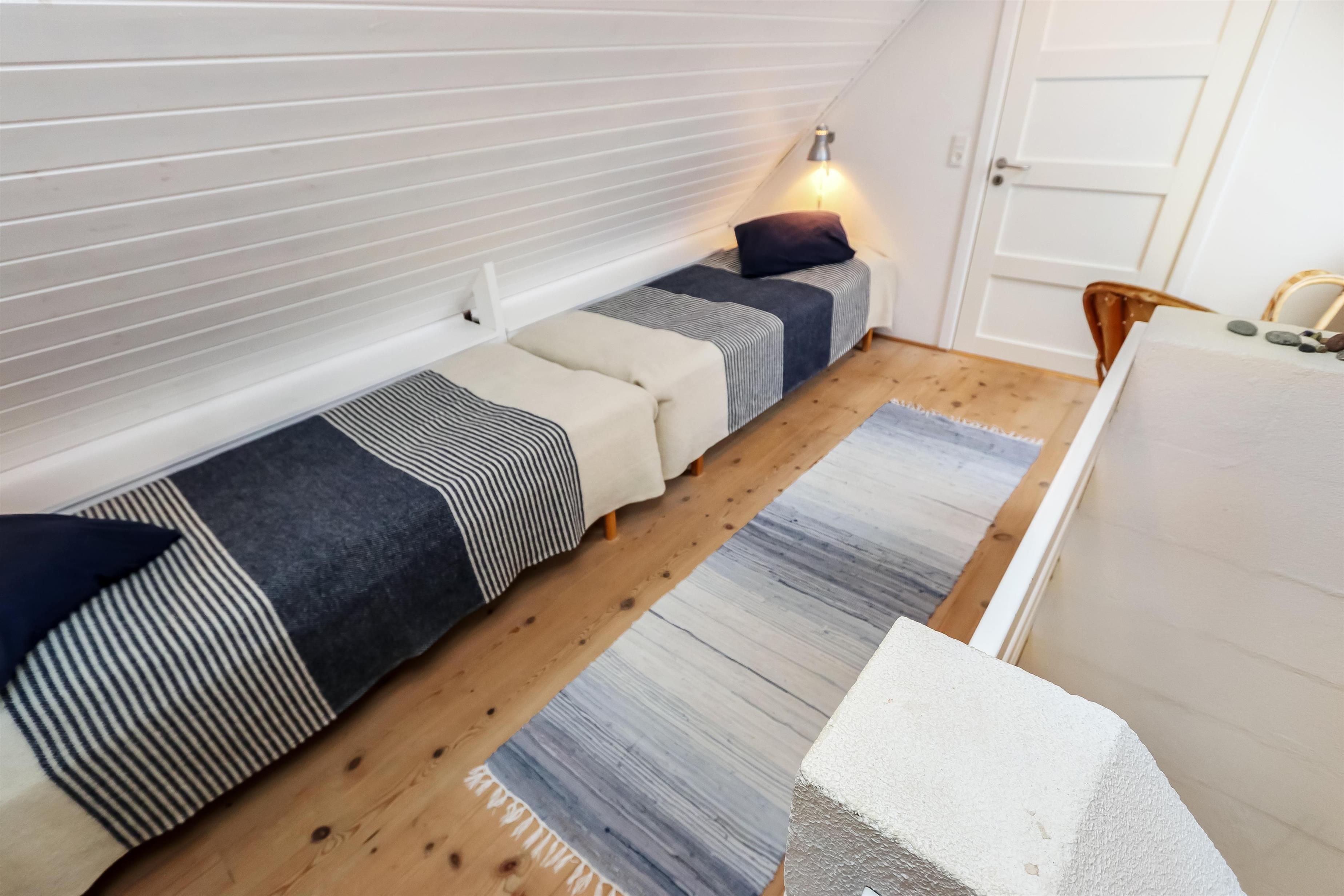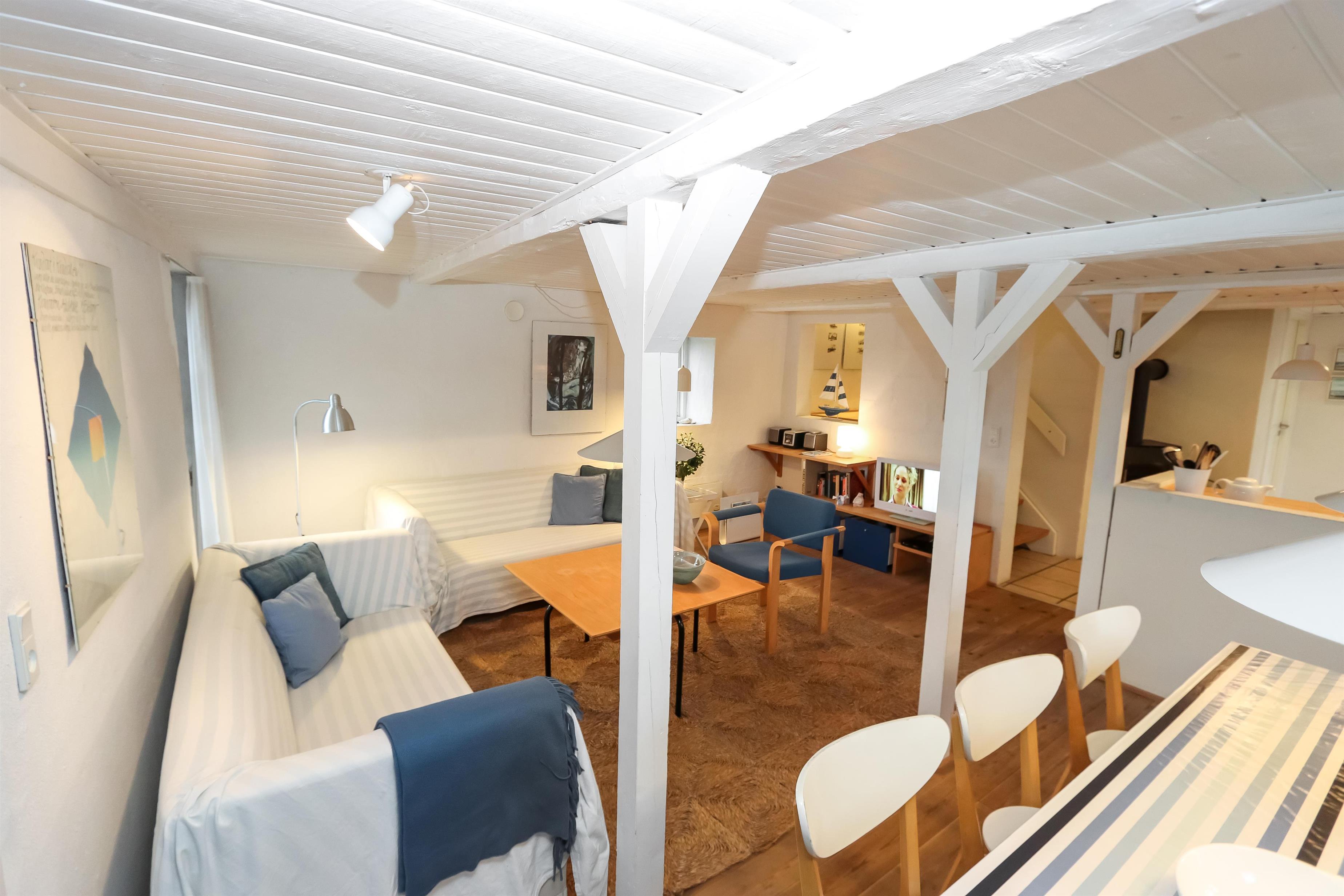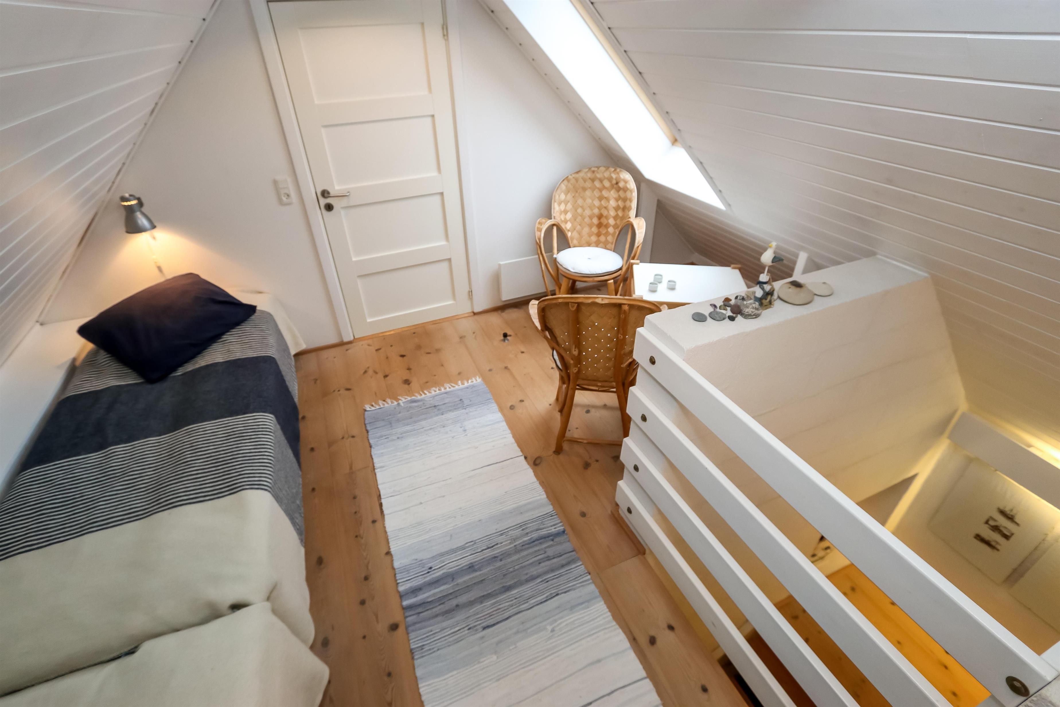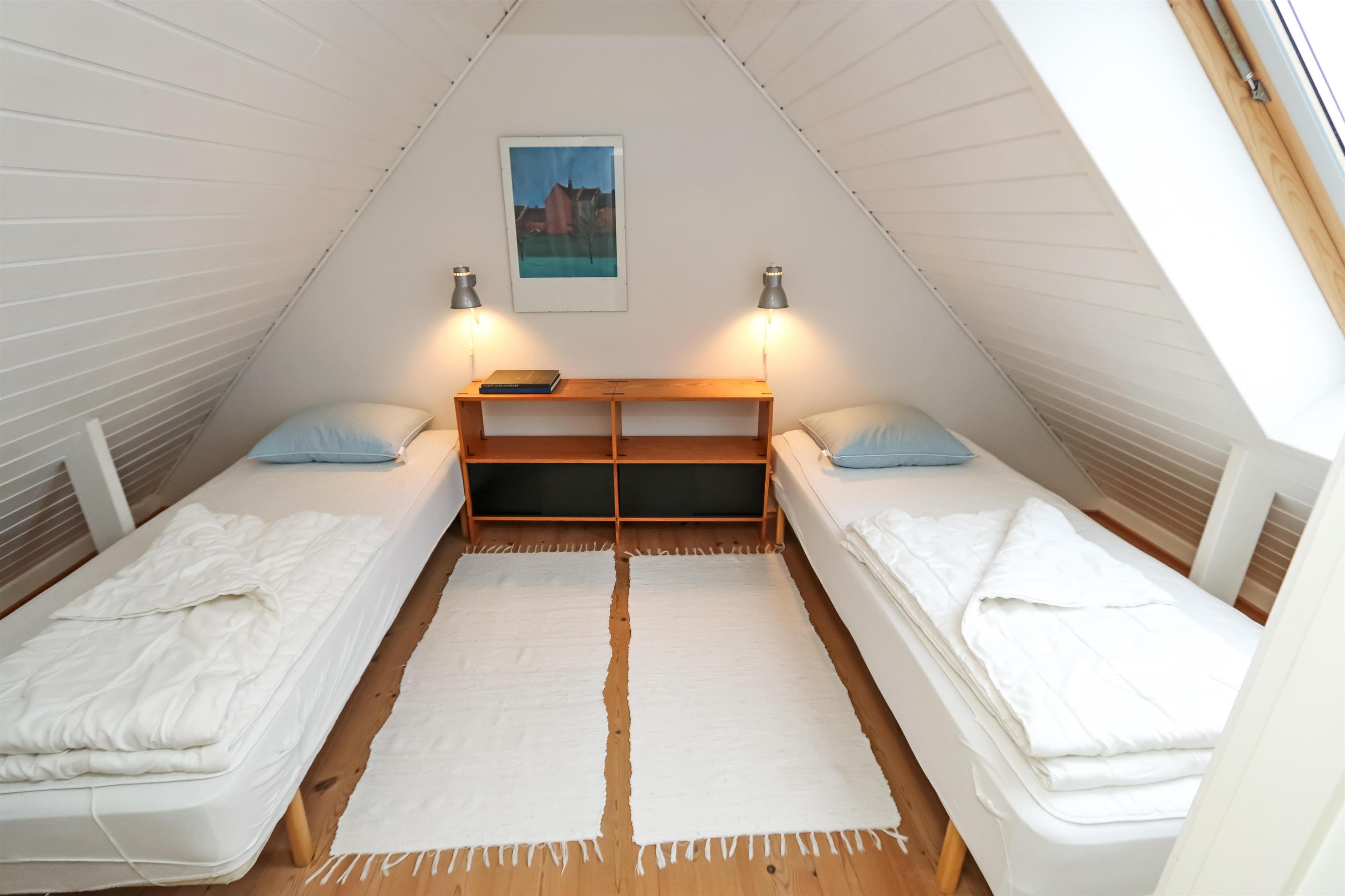 Lejligheden er lyst og charmerende indrettet i moderne, nordisk stil. På 1. sal findes tre soveværelser: ét med dobbeltseng og to værelser med hver to enkeltsenge. Alle værelser har smuk havudsigt, så I kan vågne op til lyden af bølgerne og udsigten over Vesterhavet.