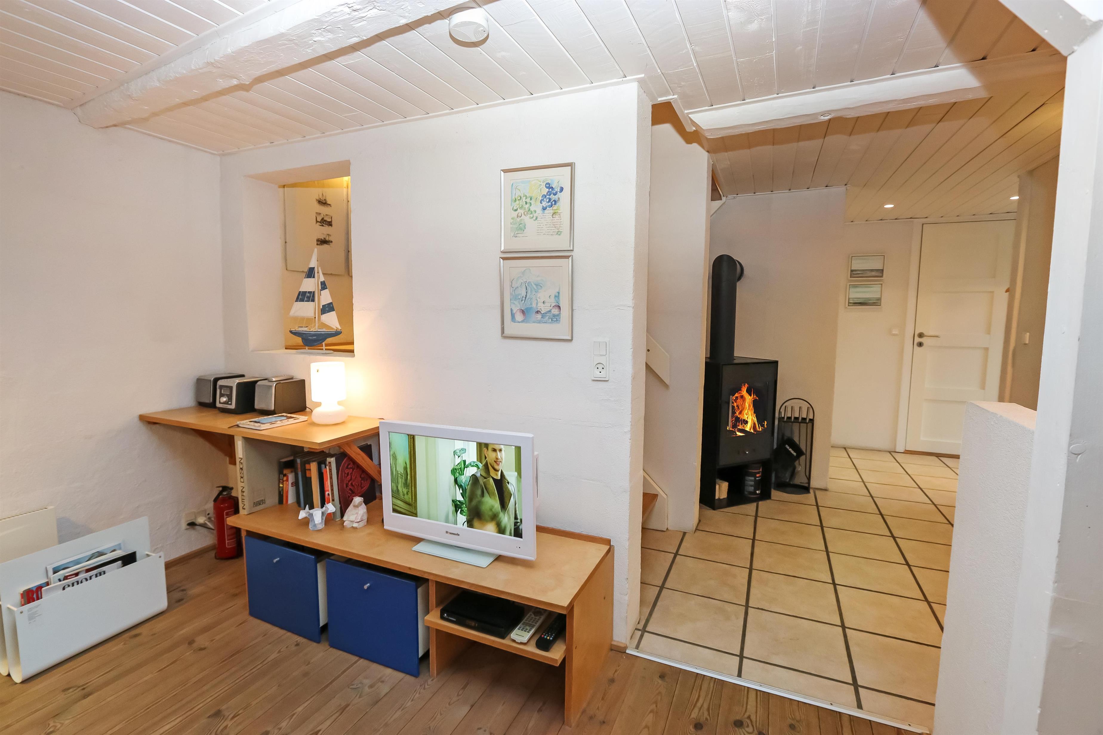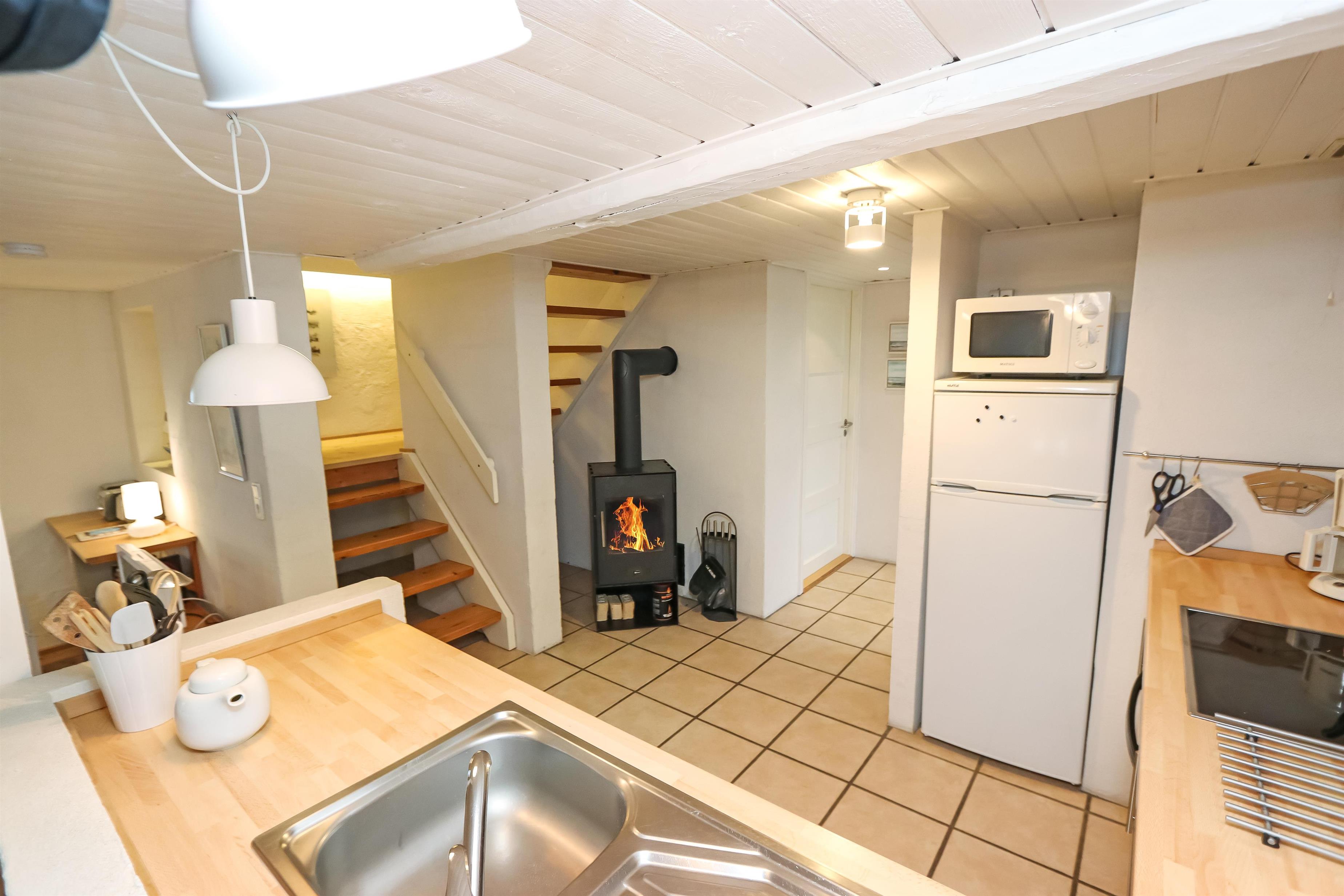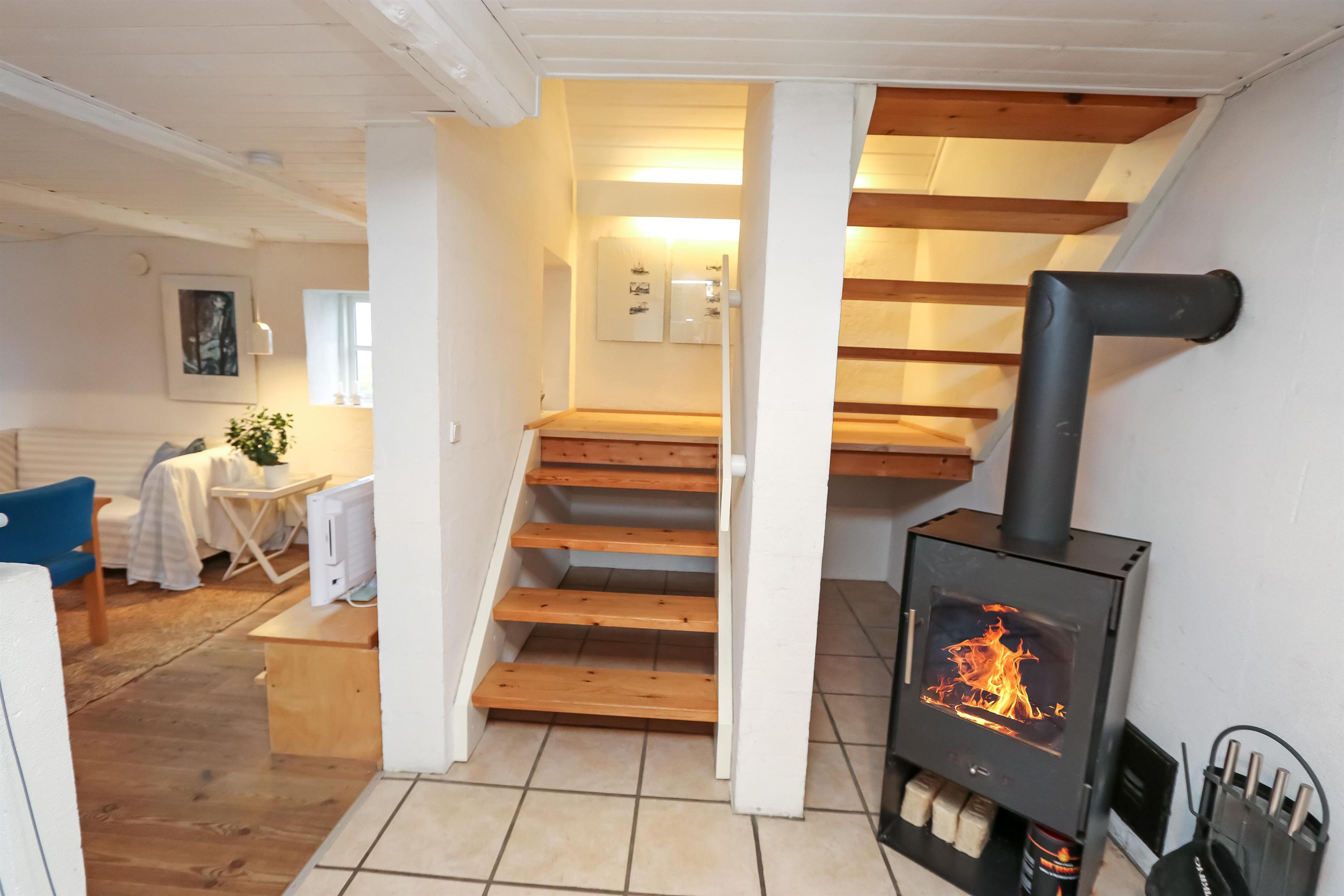 I stueetagen byder boligen på en indbydende entré med adgang til badeværelse med gulvvarme, sauna og bruseniche – perfekt efter en frisk tur langs stranden. Derudover er der gæstetoilet med vaskemaskine og tørretumbler. Det fuldt udstyrede køkken med keramisk kogeplade, varmluftovn, mikroovn, opvaskemaskine, køleskab med frostboks og kaffemaskine har brændeovn og ligger i åben forbindelse med spise- og opholdsstuen. Her er der god plads til hyggelige måltider og afslapning foran tv’et, som er udstyret med DVD, parabol og stereoanlæg med CD. Overalt i lejligheden er der flotte træ- og klinkegulve.