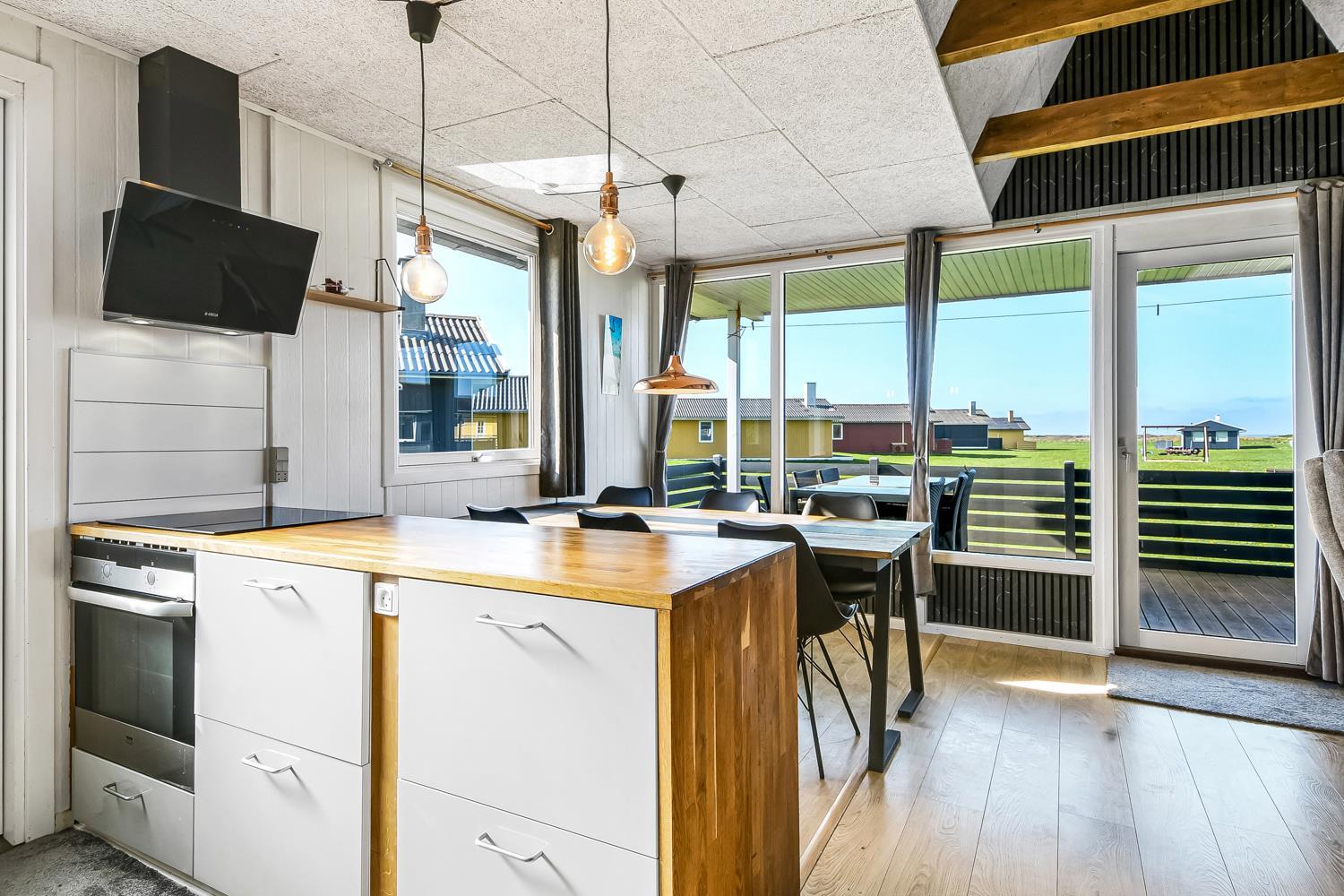 Huset er lyst og venligt indrettet med komfortable lædermøbler, brændeovn som giver en behagelig varme også på de kolde dage samt TV med danske og tyske programmer. Der er lyse trægulve i stue og køkkenafdelingen. Åben køkken som er indrettet med elkomfur, emhætte, opvaskemaskine og mikroovn. Badeværelse med bruser, toilet, håndvask. 3 soverum med 1DB + 1DB og 1 køjeseng. Der er trægulve i soverummene. Der er også en vaskemaskine i huset. Fra stue og køkkenet er der en fantastisk udsigt til Vesterhavet og fællesarealet med legeplads og bålplads ligger lige udenfor døren. Der er gratis internetadgang. 2 husdyr er tilladt. Rygning er ikke tilladt.