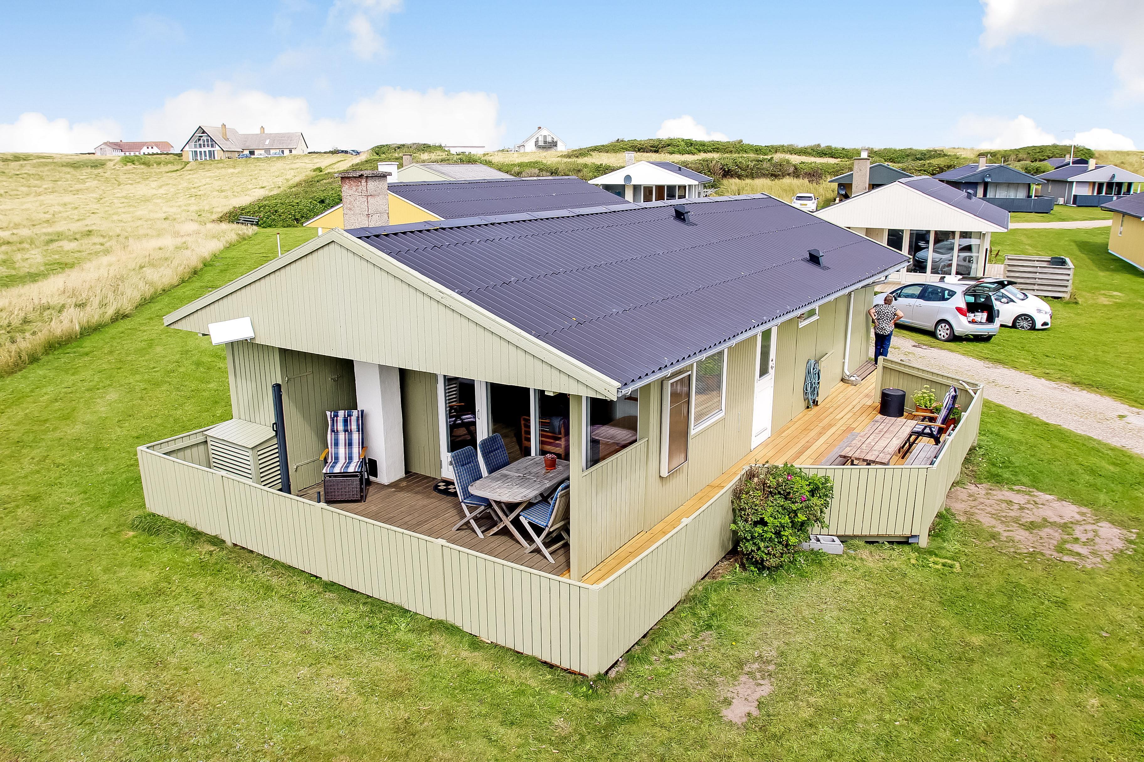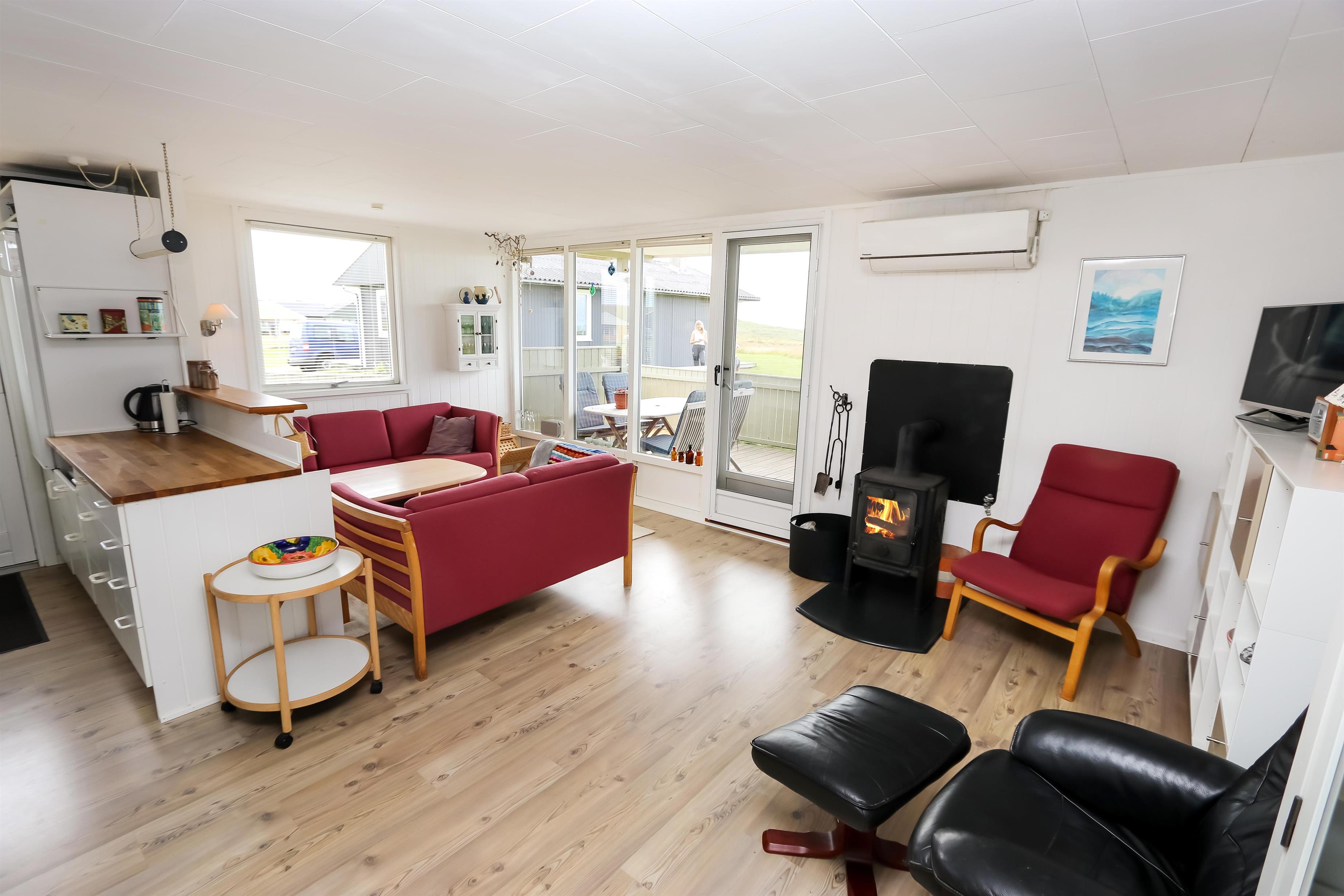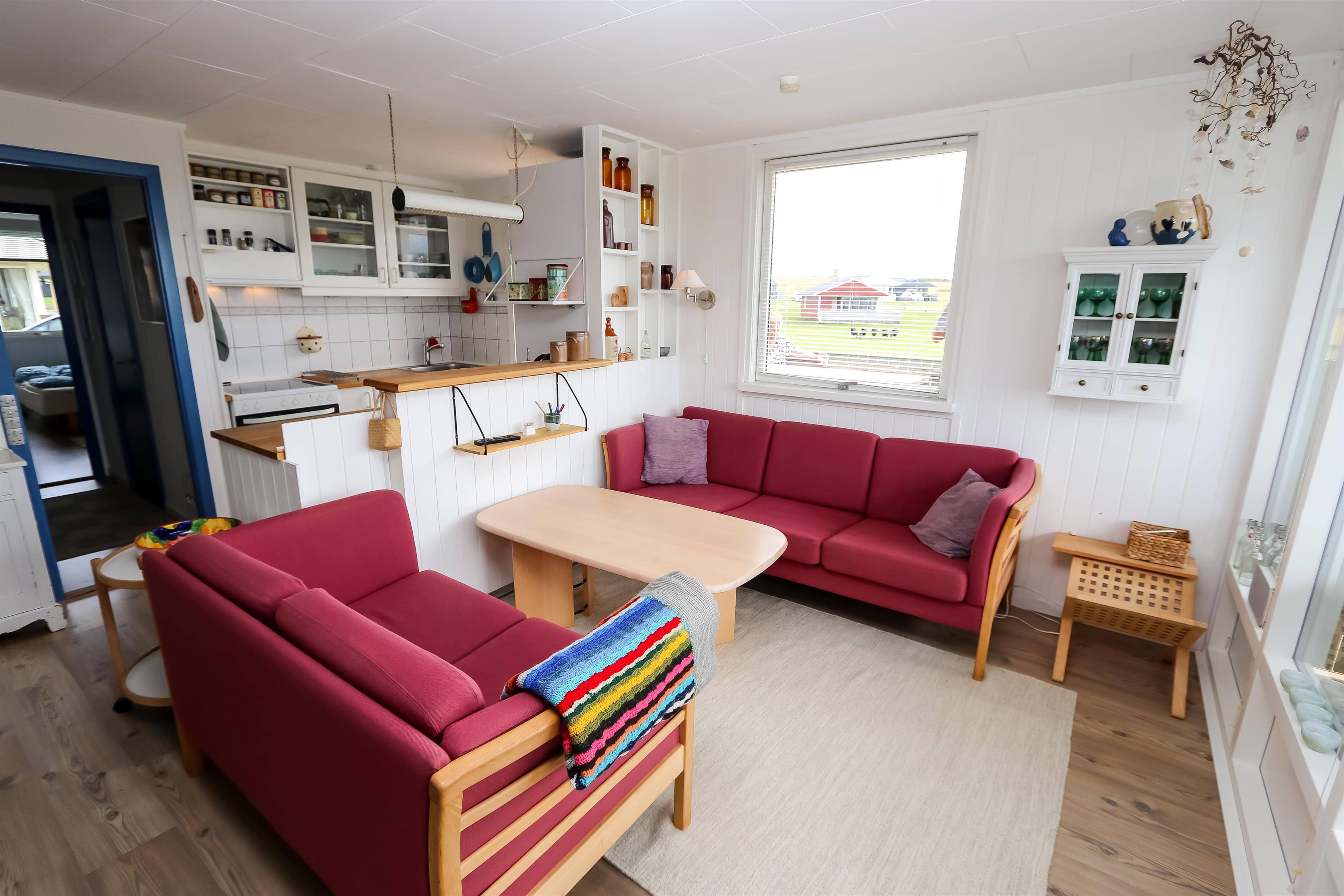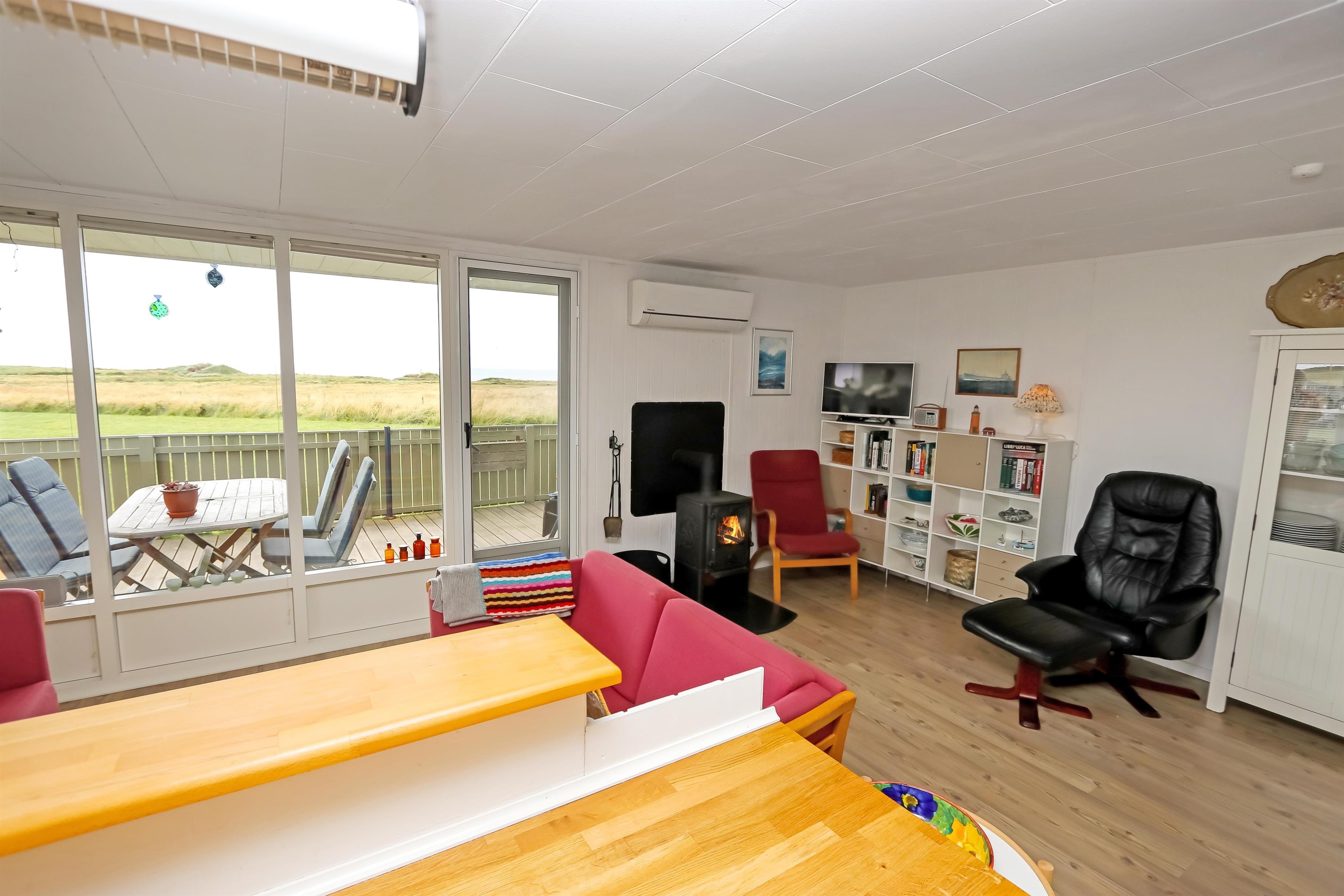 67 m2 træferiehus med 2 soveværelser (1DS, 2ES + 1KS). Kombineret opholdsstue og køkkenhjørne. Opholdsstue med polstermøbler, tv med danske og tyske kanaler, radio og spisebord. Nyd udsigten over Vesterhavet og slap af foran den knitrende brændeovn som sammen med varmepumpen hjælper med at reducere udgiften til varmeregningen. Pænt køkkenhjørne med komfur med glaskeramiske kogeplader, emhætte, opvaskemaskine og køleskab med fryseboks. Pænt badeværelse med toilet, bruser, håndvask og vaskemaskine. Fra stuen er der panoramaudsoigt til Vesterhavet. Der er trægulve i alle opholdsrum og linolium i soverum. Ikke ryger hus. Max 1 husdyr tilladt.