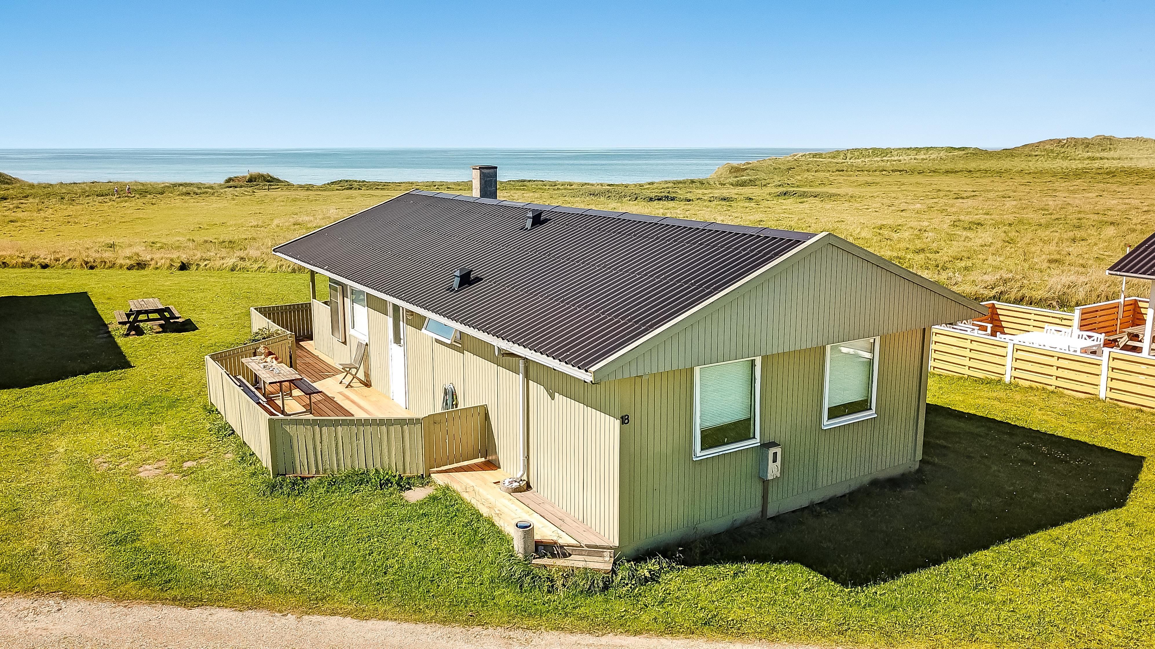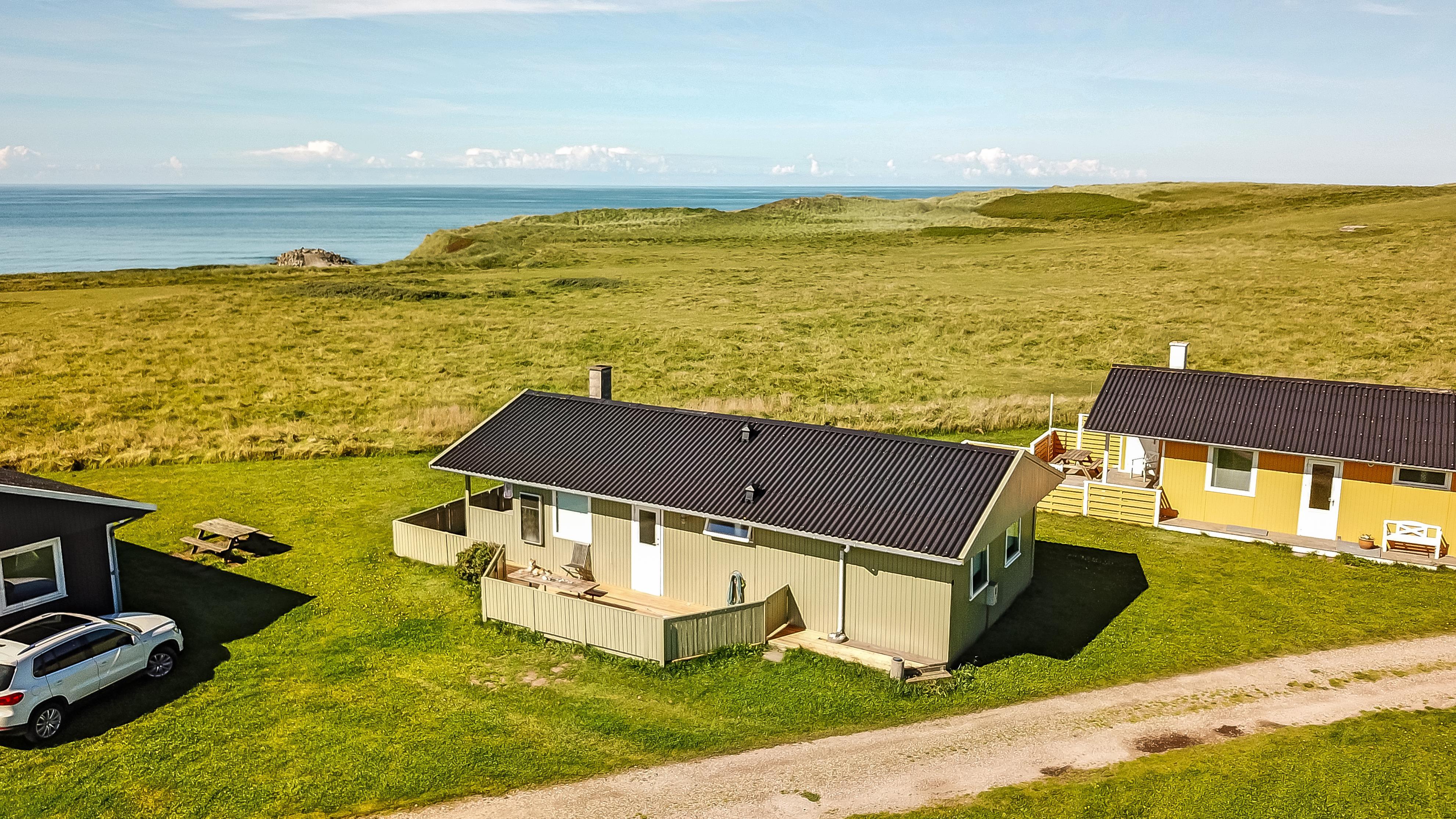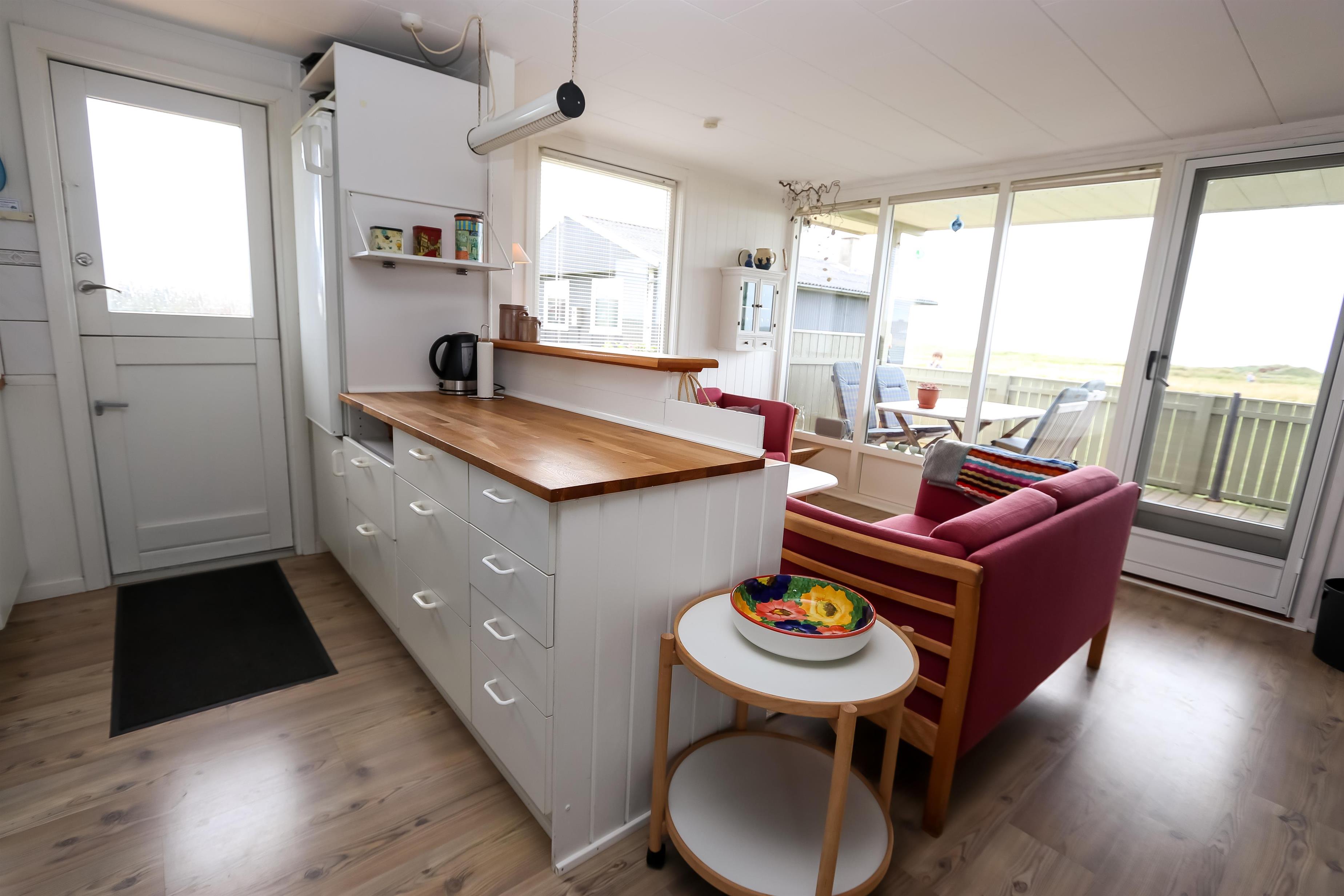 67 m2 træferiehus med 2 soveværelser (1DS, 2ES + 1KS). Kombineret opholdsstue og køkkenhjørne. Opholdsstue med polstermøbler, tv med danske og tyske kanaler, radio og spisebord. Nyd udsigten over Vesterhavet og slap af foran den knitrende brændeovn som sammen med varmepumpen hjælper med at reducere udgiften til varmeregningen. Pænt køkkenhjørne med komfur med glaskeramiske kogeplader, emhætte, opvaskemaskine og køleskab med fryseboks. Pænt badeværelse med toilet, bruser, håndvask og vaskemaskine. Fra stuen er der panoramaudsoigt til Vesterhavet. Der er trægulve i alle opholdsrum og linolium i soverum. Ikke ryger hus. Max 1 husdyr tilladt.