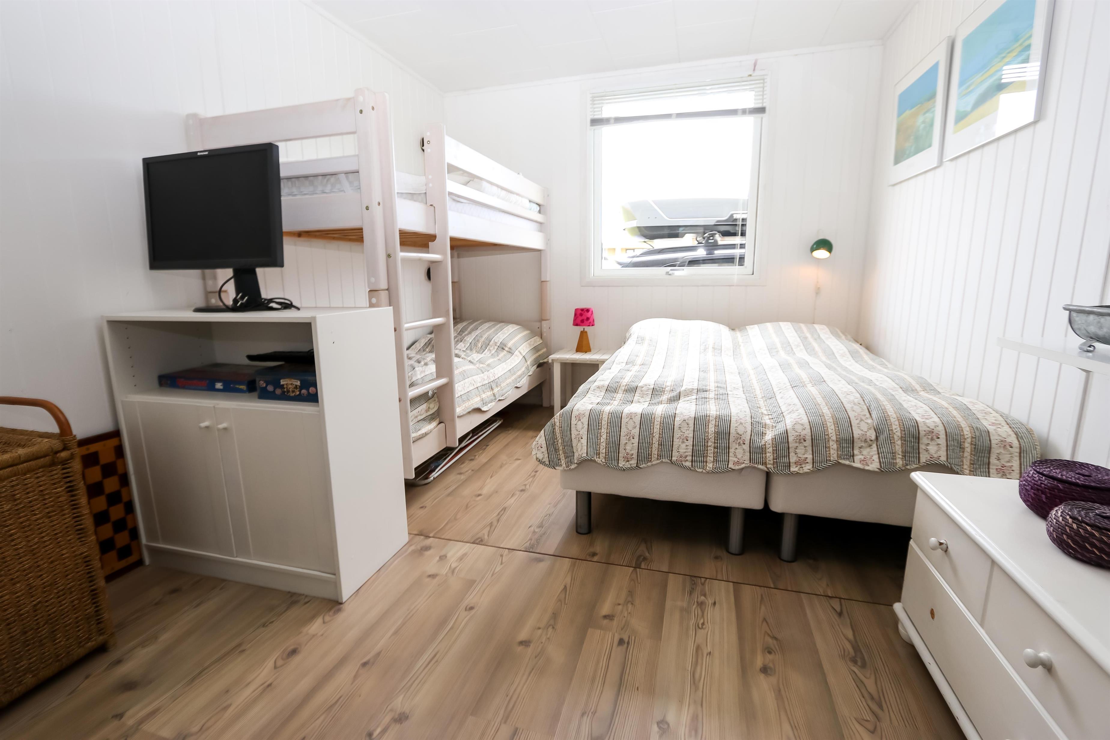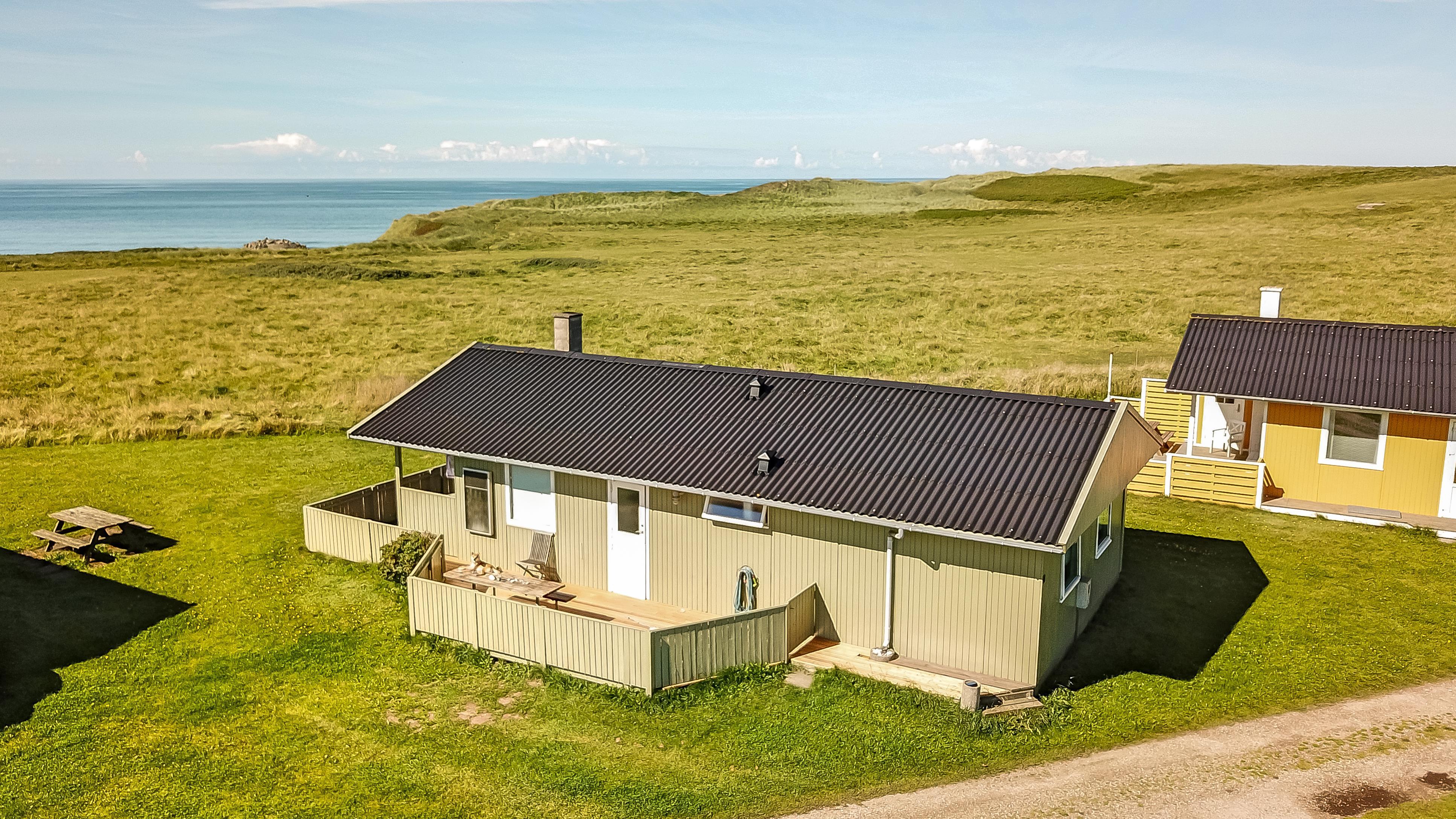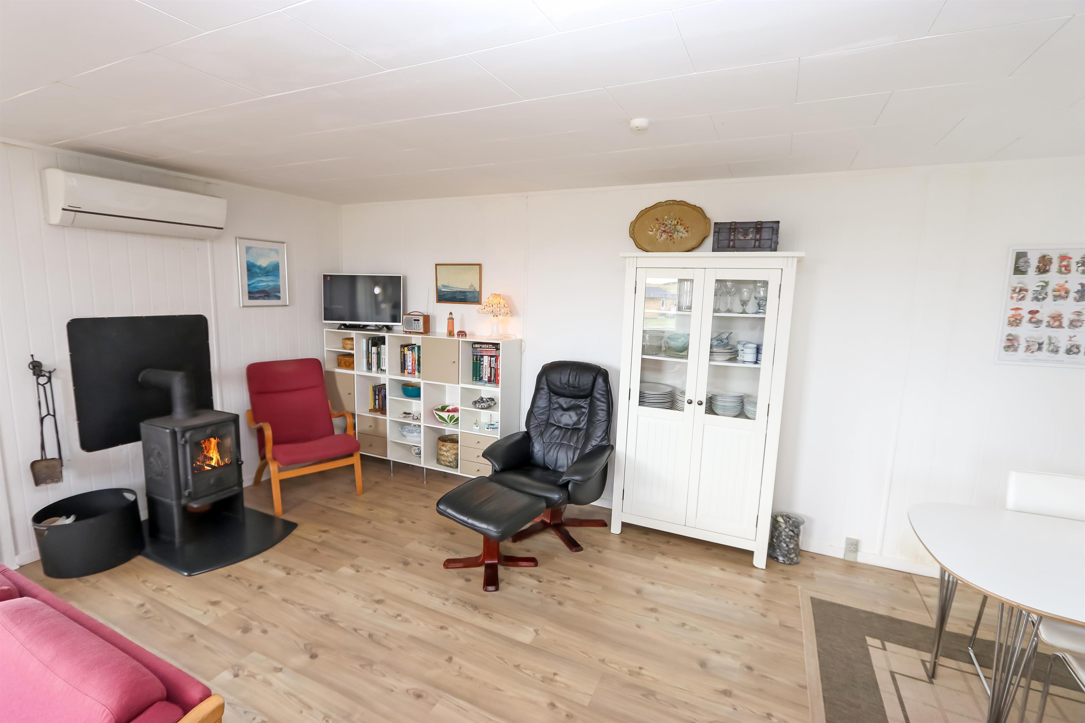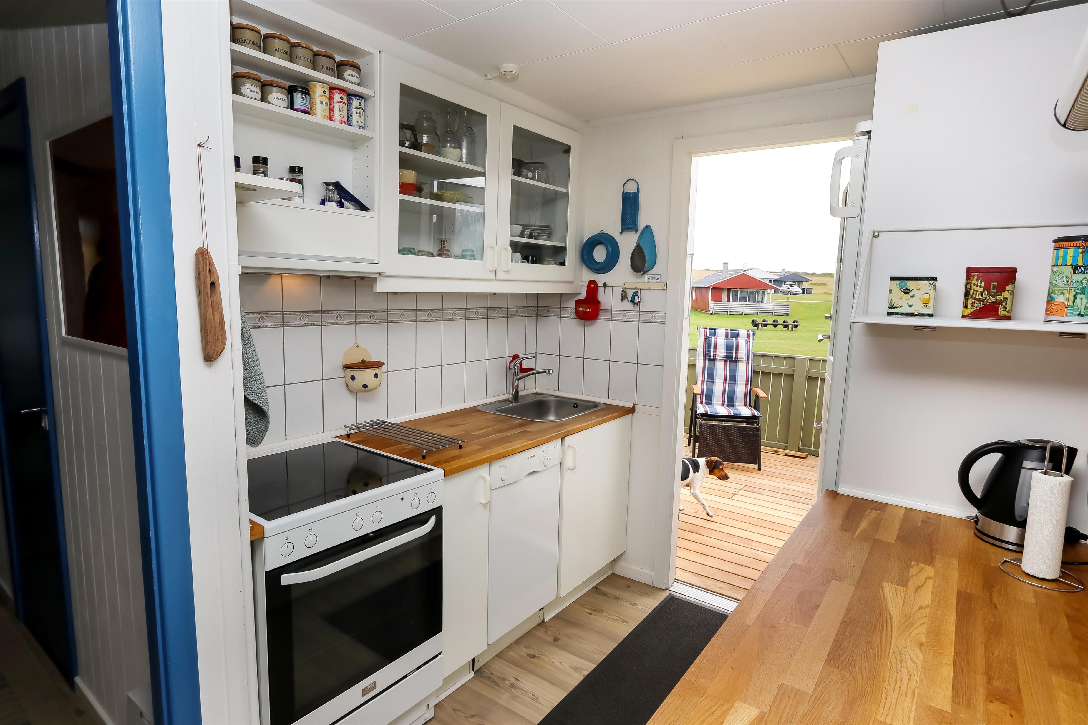 67 m2 træferiehus med 2 soveværelser (1DS, 2ES + 1KS). Kombineret opholdsstue og køkkenhjørne. Opholdsstue med polstermøbler, tv med danske og tyske kanaler, radio og spisebord. Nyd udsigten over Vesterhavet og slap af foran den knitrende brændeovn som sammen med varmepumpen hjælper med at reducere udgiften til varmeregningen. Pænt køkkenhjørne med komfur med glaskeramiske kogeplader, emhætte, opvaskemaskine og køleskab med fryseboks. Pænt badeværelse med toilet, bruser, håndvask og vaskemaskine. Fra stuen er der panoramaudsoigt til Vesterhavet. Der er trægulve i alle opholdsrum og linolium i soverum. Ikke ryger hus. Max 1 husdyr tilladt.