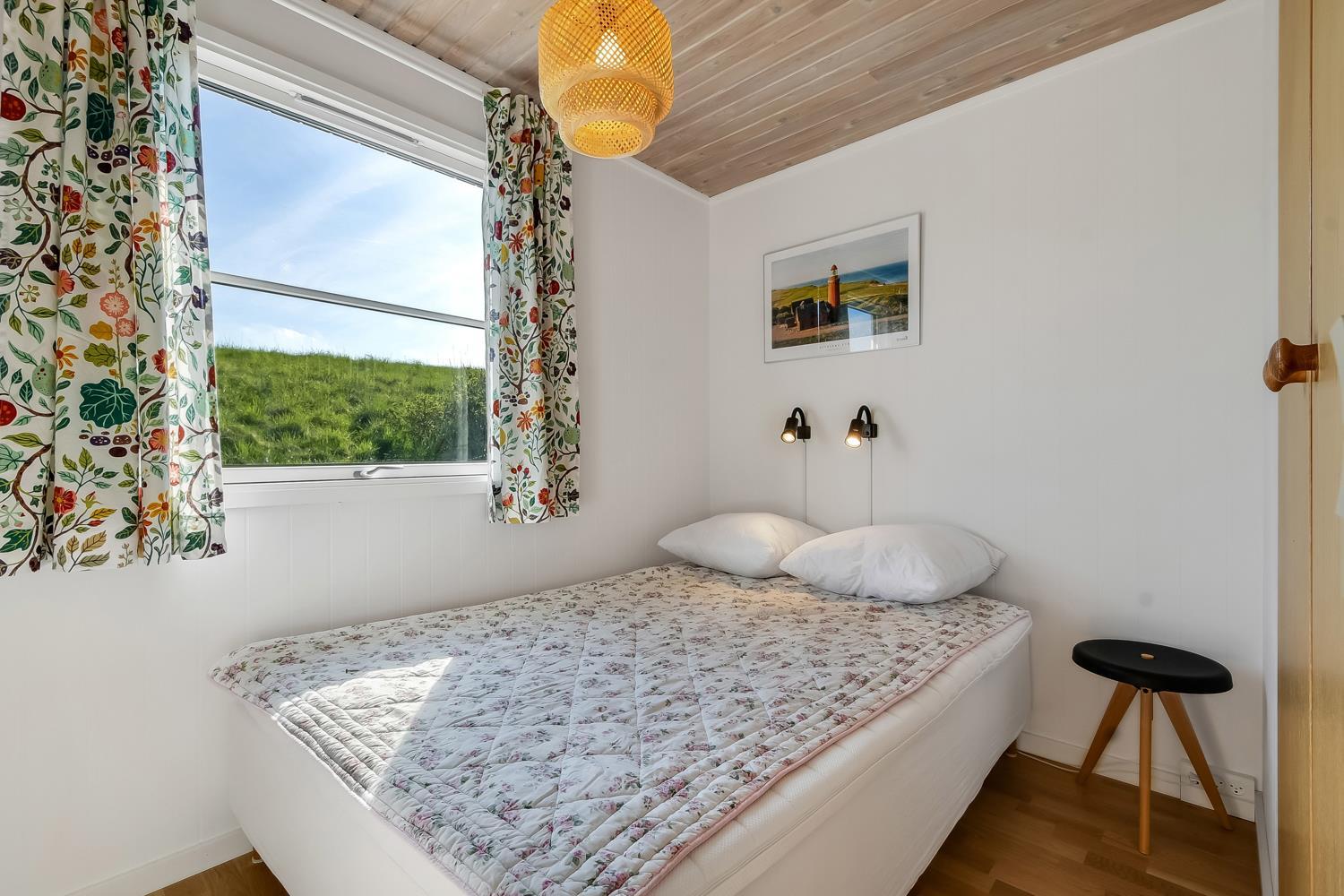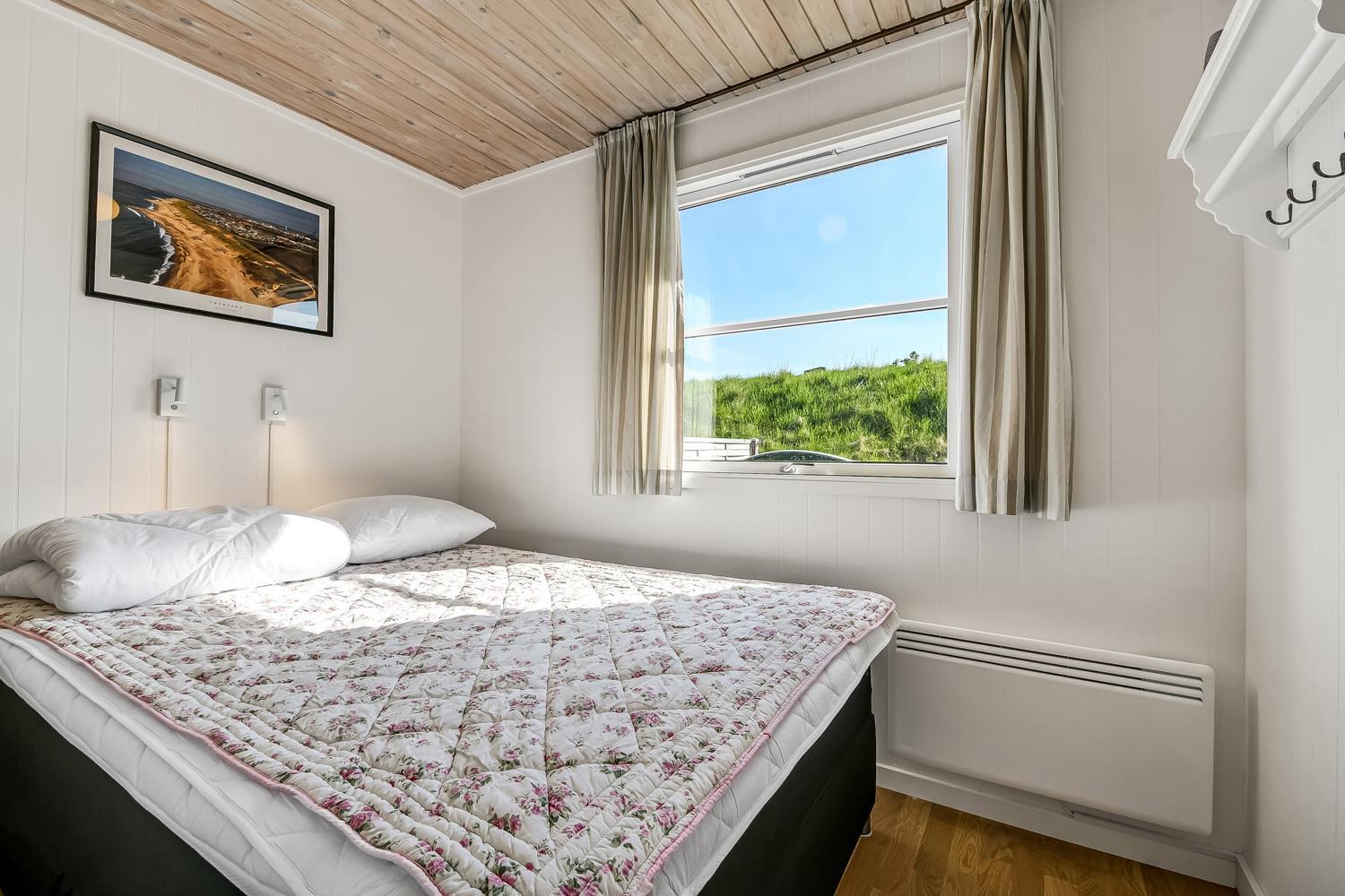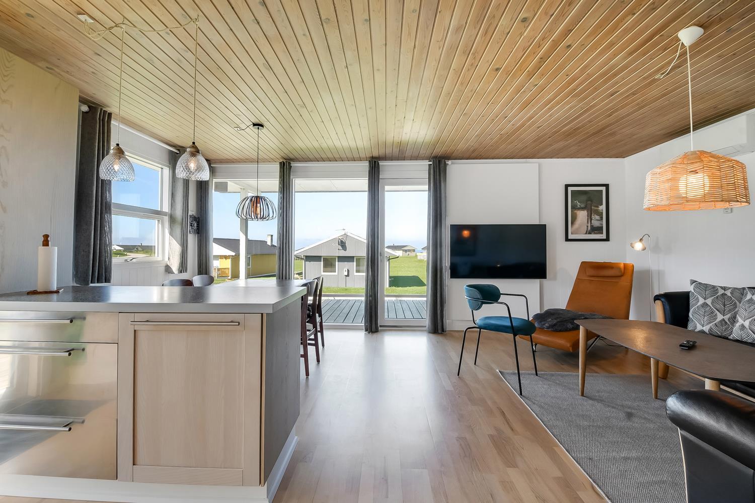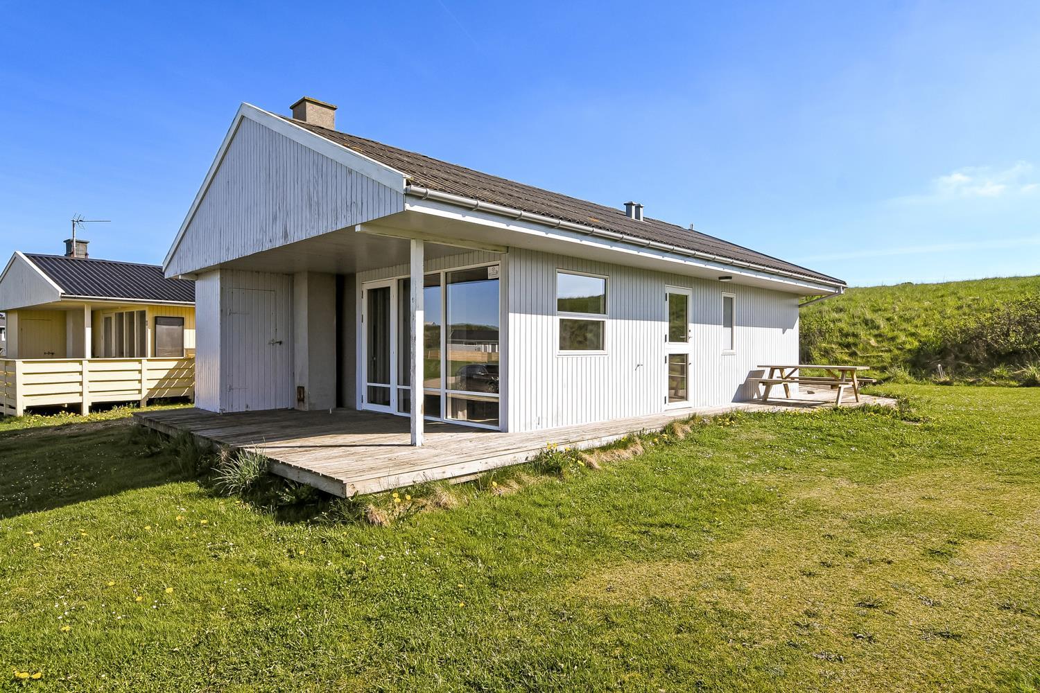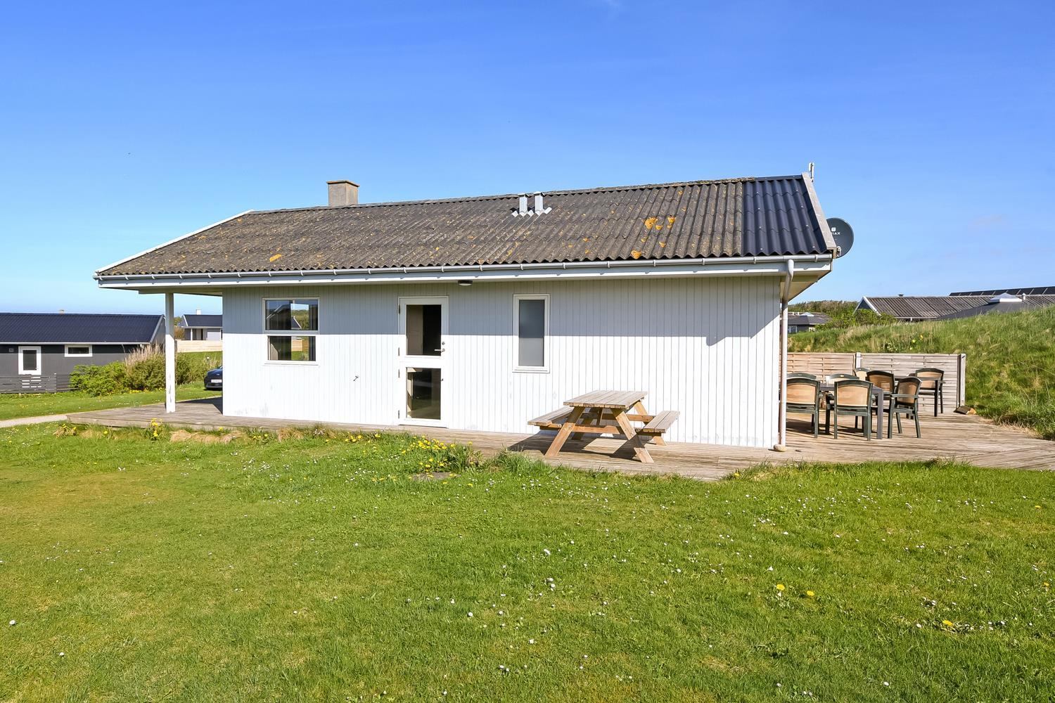 56 m2 træferiehus med 2 soveværelser (1DS, 1DS). Kombineret opholdsstue og køkkenhjørne. Lige på den anden side af køkkenhjørnet er spisebordet placeret. Herudover er der tv med danske og tyske kanaler samt mulighed for streaming af TV / radio / Apps. Opholdsstuen med lædermøbler og en varmepumpe som altid sørger for god varme en billig pris. Pænt køkkenhjørne med keramiske kogeplader, inbygningsovn, emhætte, køleskab med lille fryseboks, mikroovn, opvaskemaskine og udgang til terrasse. Pænt badeværelse med toilet, bruser, håndvask og klinkegulv med gulvvarme. Fra stuen er er kig til Vesterhavet. barnestol. Ikke ryger hus. Max 1. Husdyr tilladt.