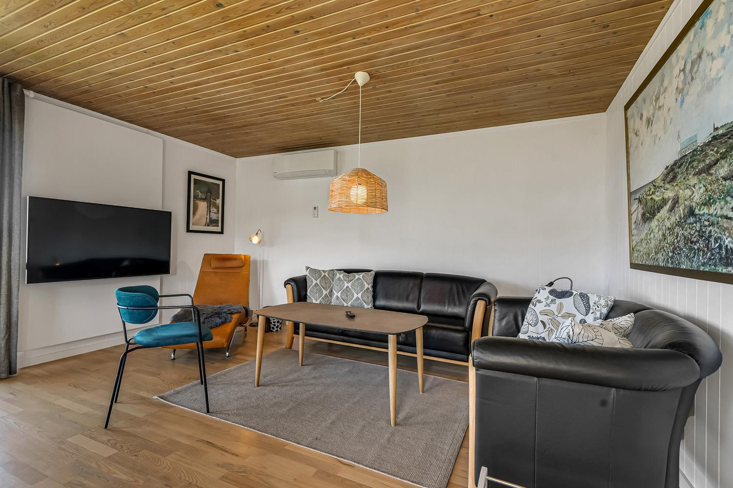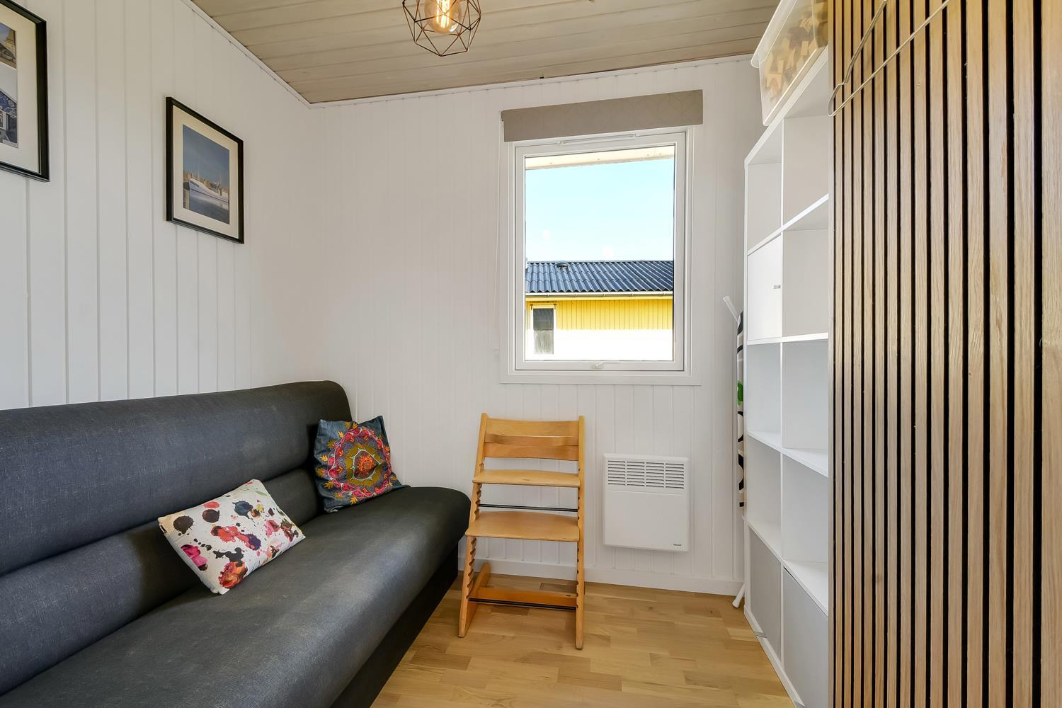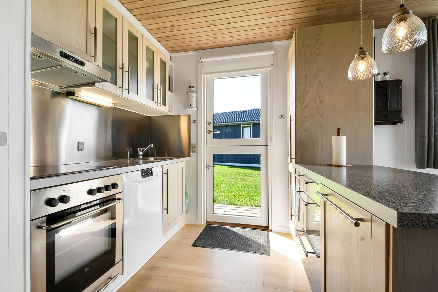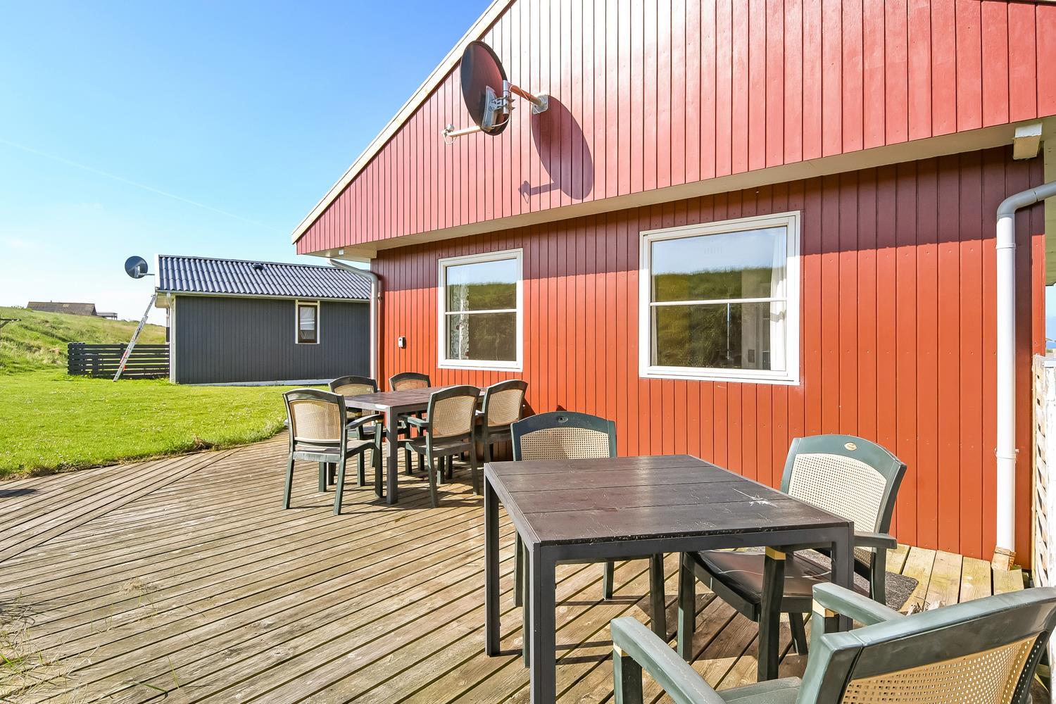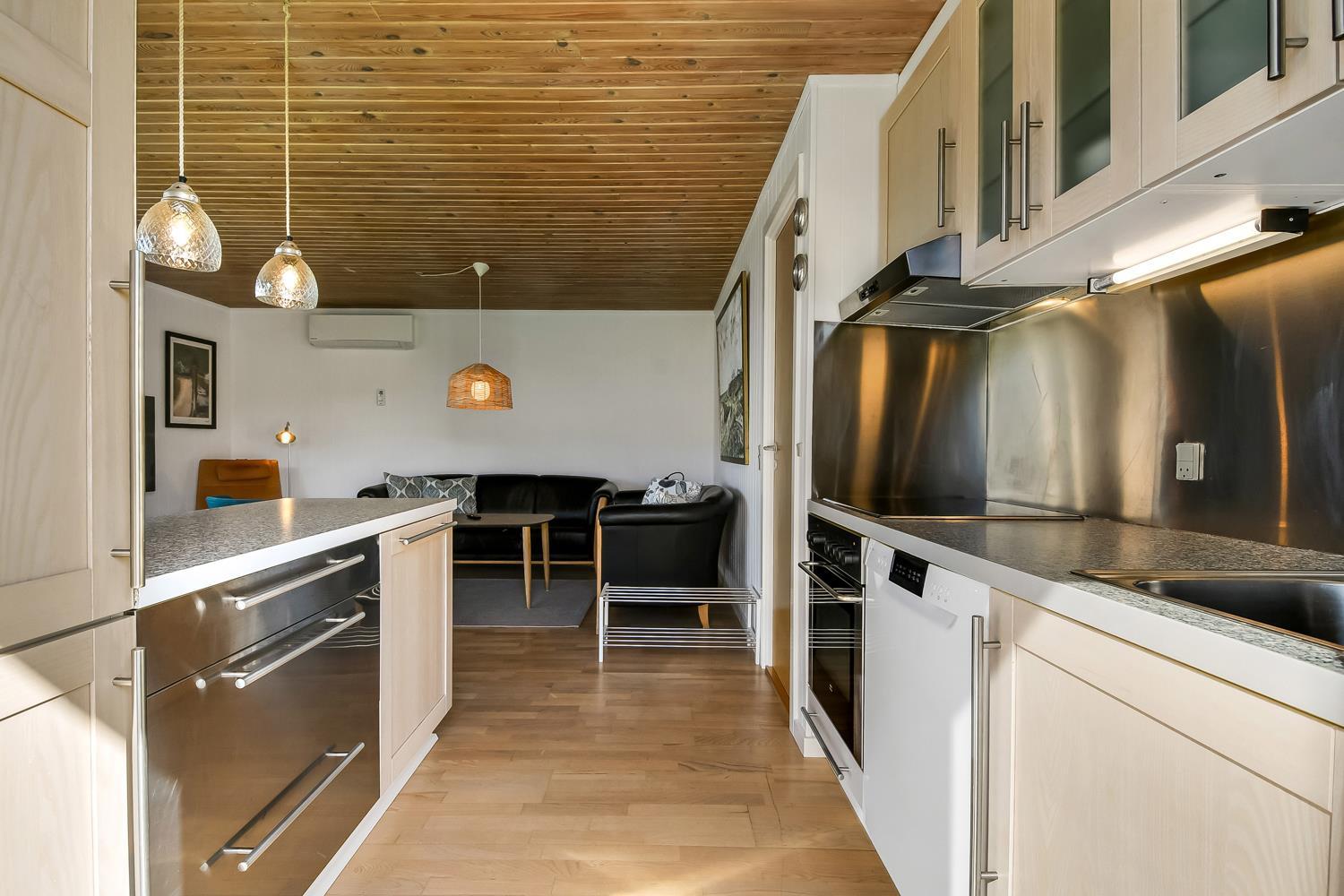 56 m2 træferiehus med 2 soveværelser (1DS, 1DS). Kombineret opholdsstue og køkkenhjørne. Lige på den anden side af køkkenhjørnet er spisebordet placeret. Herudover er der tv med danske og tyske kanaler samt mulighed for streaming af TV / radio / Apps. Opholdsstuen med lædermøbler og en varmepumpe som altid sørger for god varme en billig pris. Pænt køkkenhjørne med keramiske kogeplader, inbygningsovn, emhætte, køleskab med lille fryseboks, mikroovn, opvaskemaskine og udgang til terrasse. Pænt badeværelse med toilet, bruser, håndvask og klinkegulv med gulvvarme. Fra stuen er er kig til Vesterhavet. barnestol. Ikke ryger hus. Max 1. Husdyr tilladt.