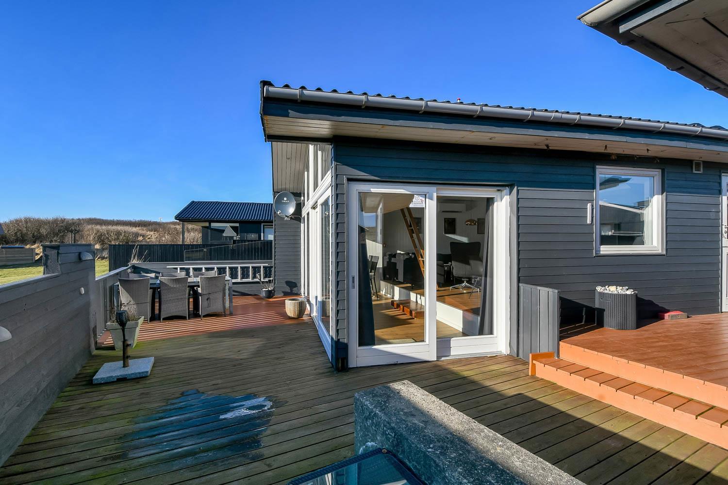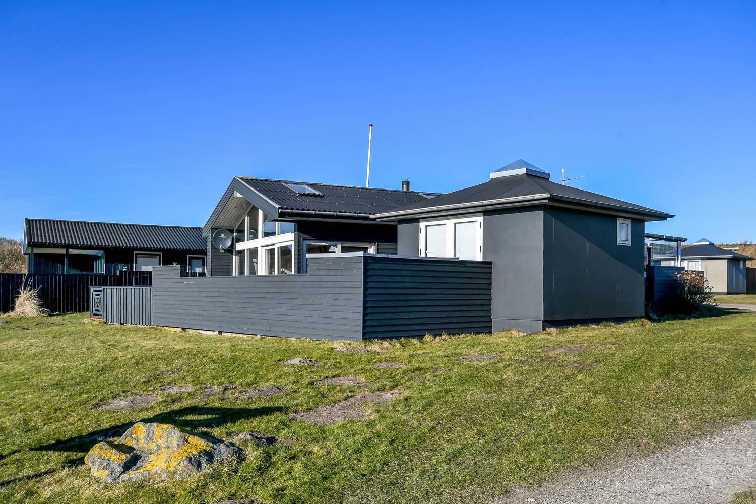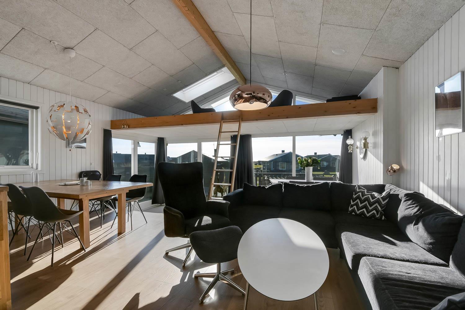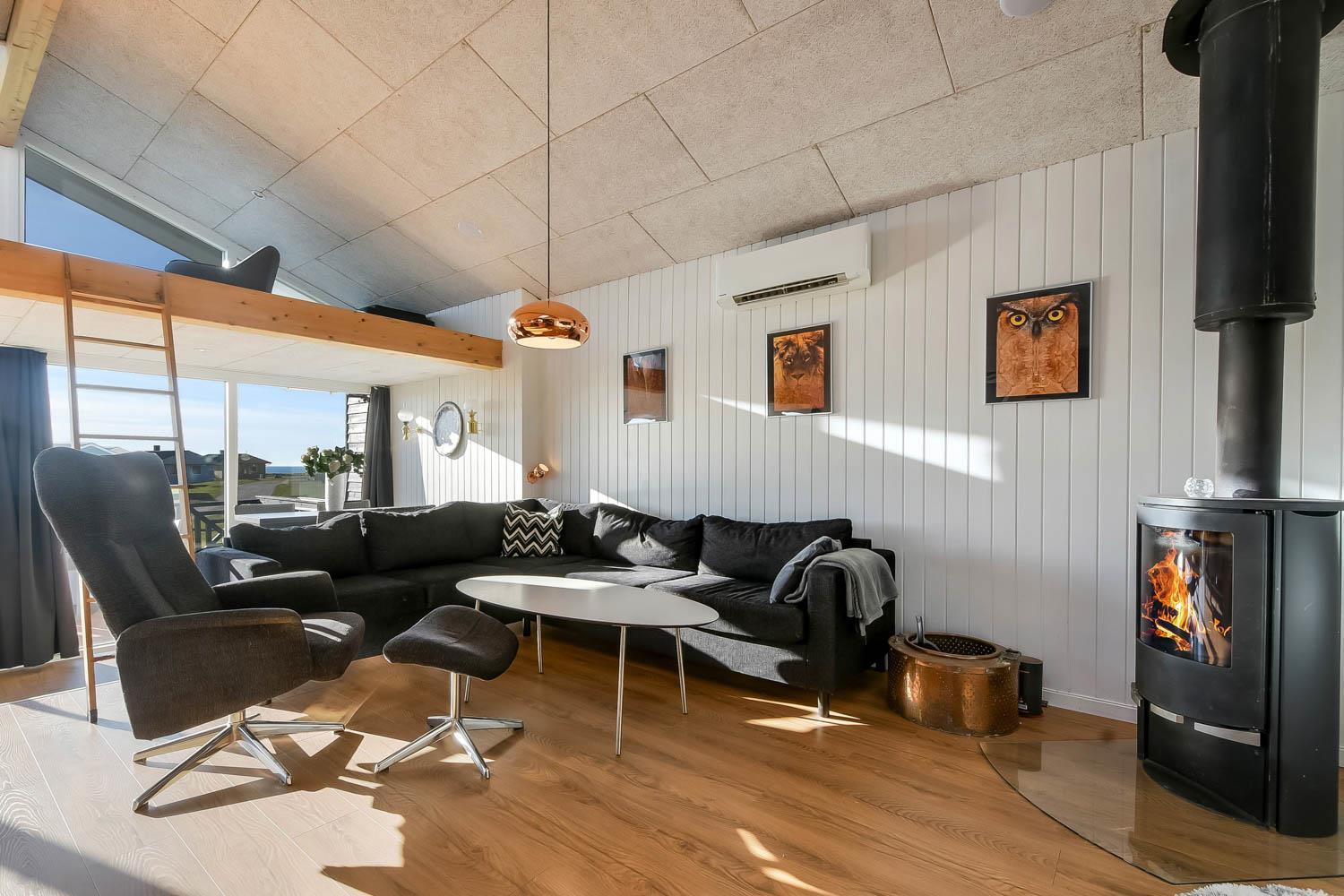 Der er rig mulighed for at nyde ferien i ro og mag i dette feriehus som byder på flere hyggelige siddepladser, som er perfekte til at læse en god bog, mens børnene leger i området, herfra er der også mulighed for at nyde udsigten til Vesterhavet og området. Sommerhuset er udstyret med en energibesparende varmepumpe og en brændeovn, som begge giver en behagelig varme og hvilket betyder lavere varmeudgifter. Huset er indrettet med et åbent køkken/opholdsrum som er med moderne møbler, højhastighedsinternet og Smart TV med mulighed for at streame dine egne tv-tjenester. Køkkenet byder blandt andet på induktionskomfur, separat ovn med grill, mikroovn, opvaskemaskine, kaffemaskine og køle/fryseskab. Badeværelse: brusekabine, toilet og 2 personers spa. Gæstetoilet: toilet og håndvask, samt vaskemaskine og tørretumbler. Der er to soveværelser i selve huset, begge med gode dobbeltsenge og tv. Der er også hems under taget med yderligere tre sovepladser og havudsigt. Sidst, men ikke mindst, ved siden af hovedhuset ??er der et separat anneks med en dobbeltseng og en enkeltseng.
