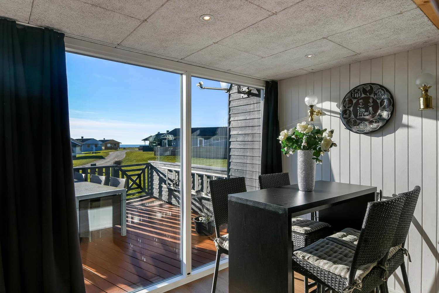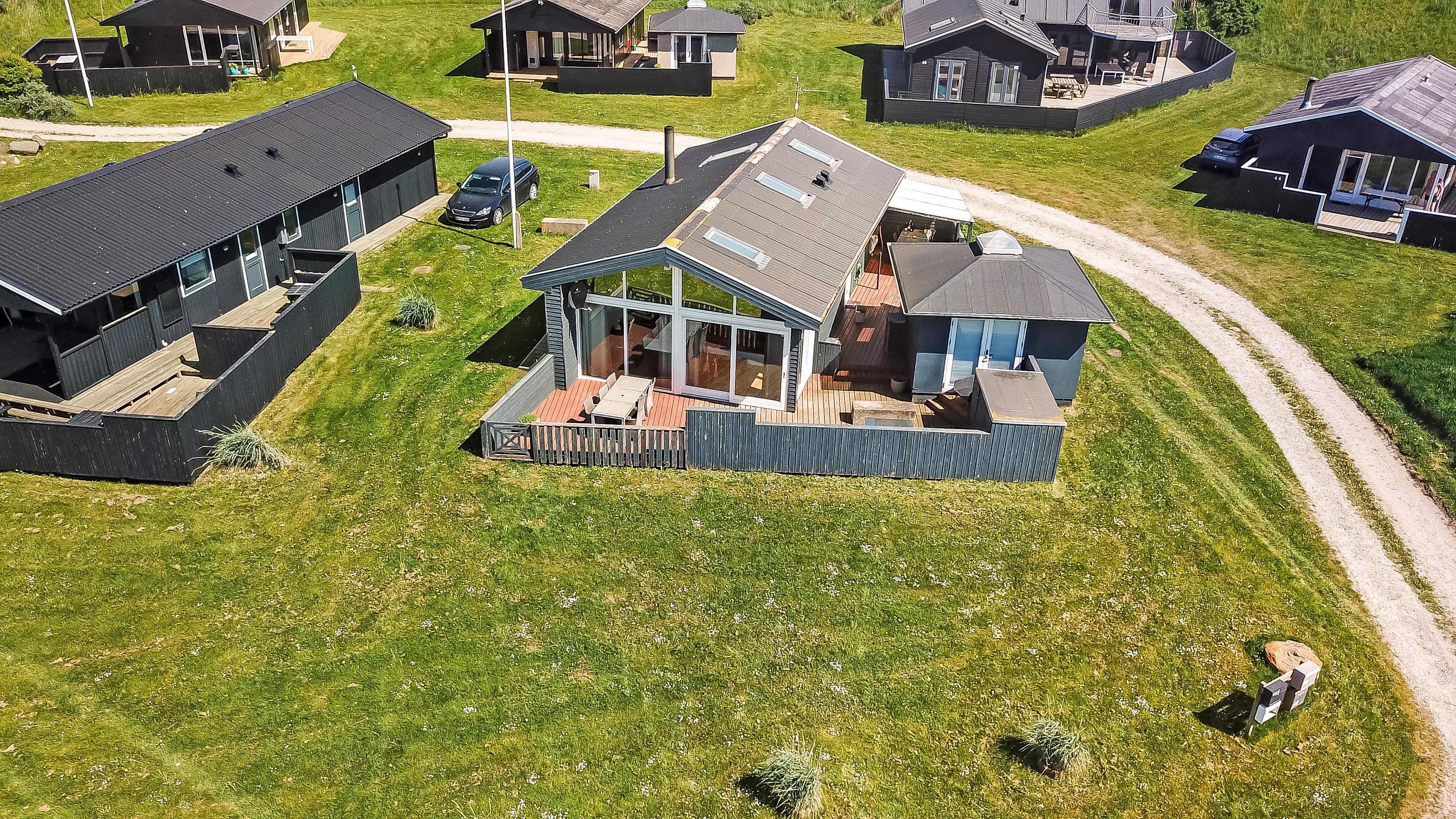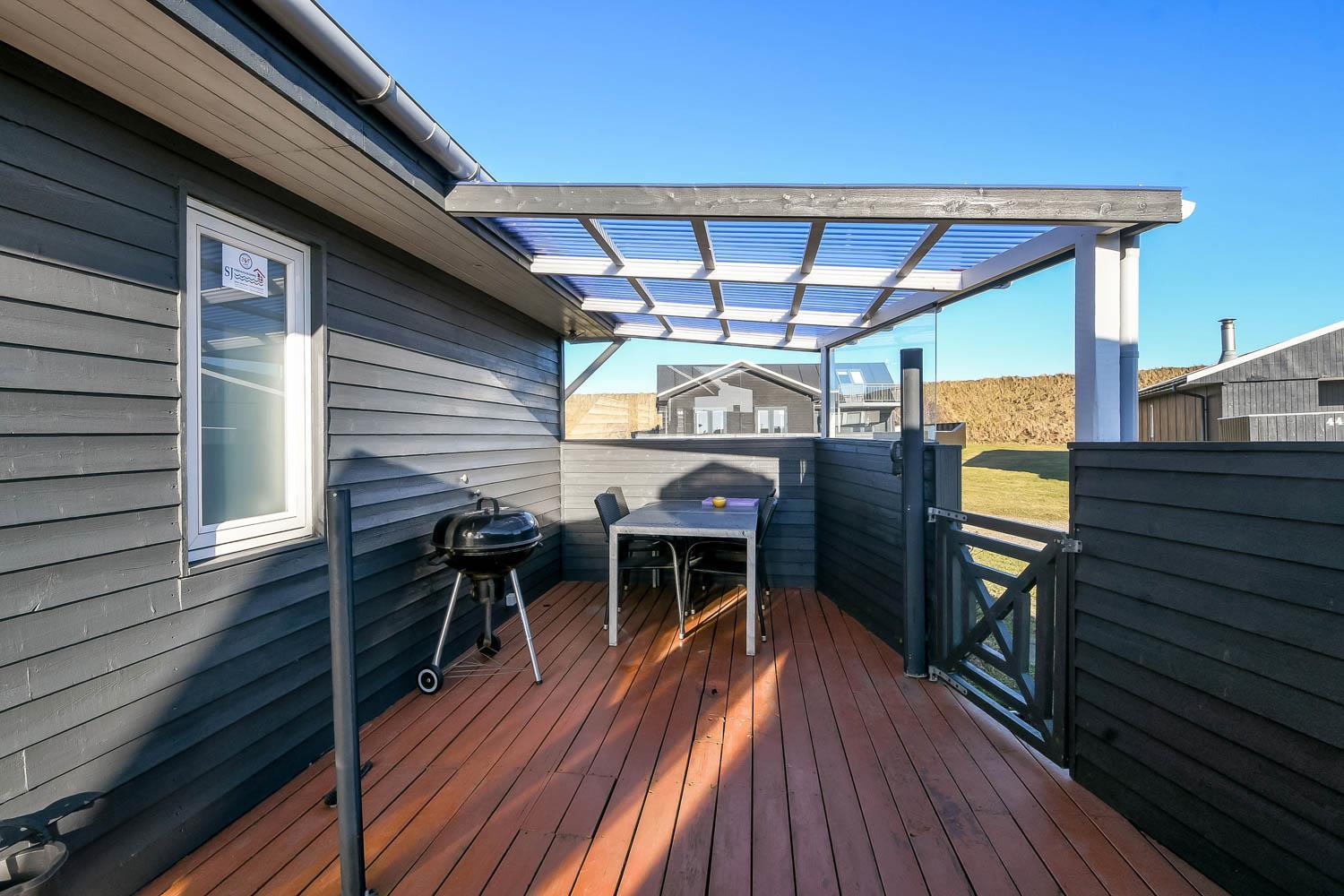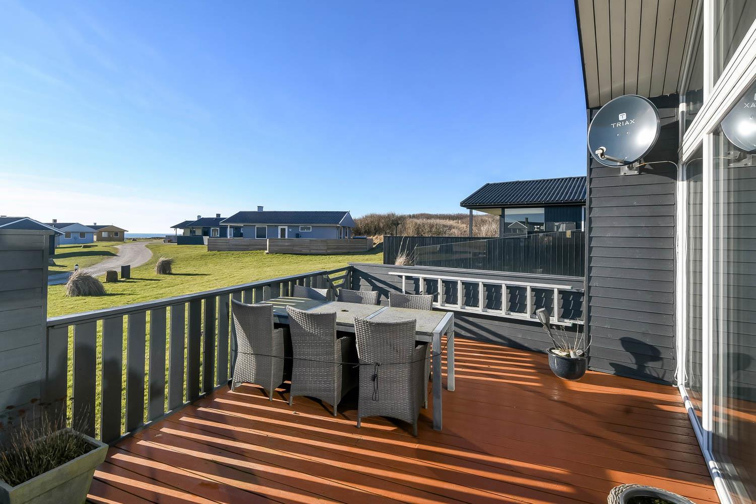 Der er flere terrassearealer med gode havemøbler og gasgrill til skønne sommerdage. Derudover har sommerhuset en stor, indhegnet terrasse med gode havemøbler, hvor små børn og familiens firbenede venner kan opholde sig trygt. Området Trans Ferieby er et velholdt område med mange ens huse med hver deres særpræg. På de velholdte fællesarealer er der en fælles legeplads som er lavet i 2012, hvor der findes legehus, rutschebane og bålplads. Delvis overdækket, indhegnet terrasse med havemøbler og grill. Nyd havkigget, en plads i solen eller udforsk området. Gå en tur ved havet som hver dag fortæller nye historier eller besøg handelsbyen Lemvig og fiskerbyen Thyborøn, hvor der også er masser af aktiviteter og spisemuligheder.