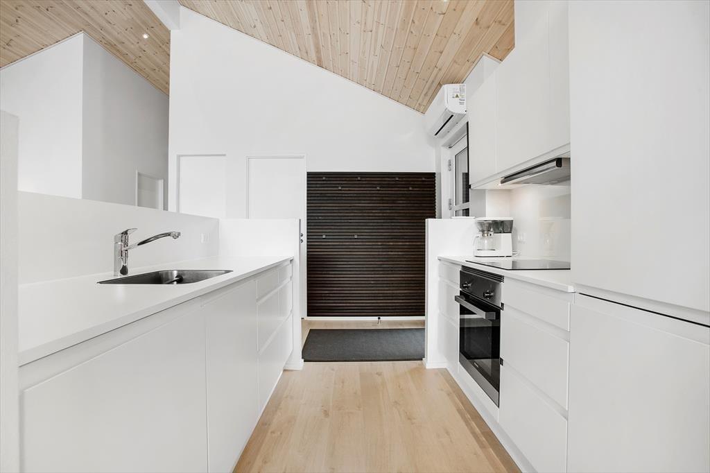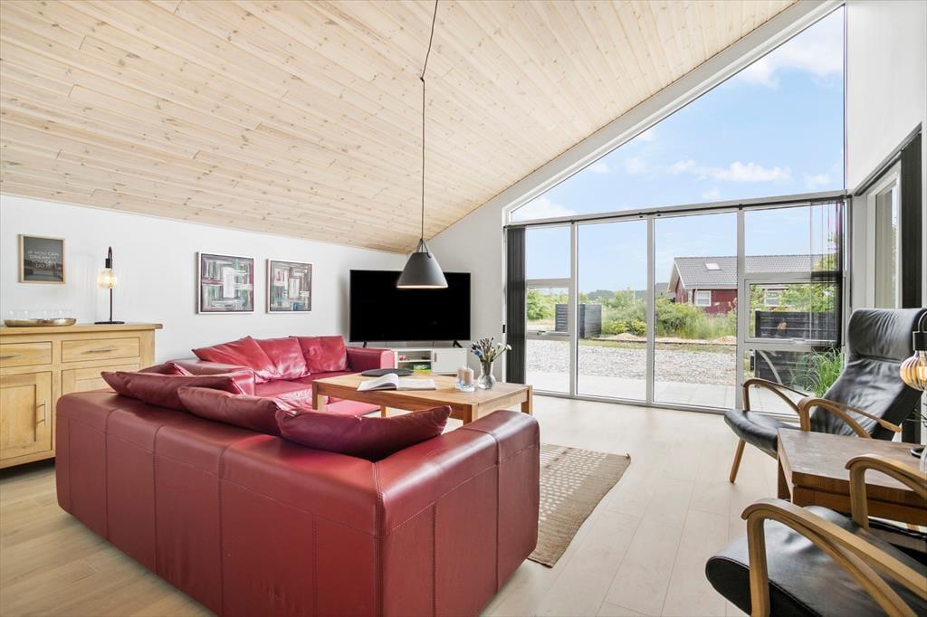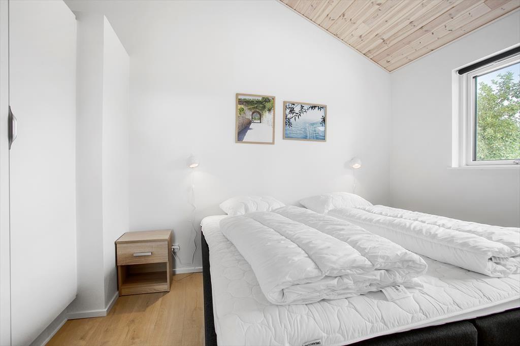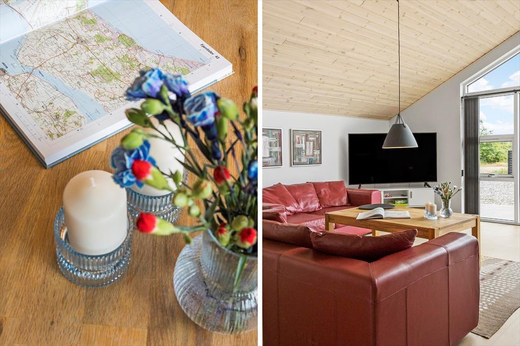Inden døre i det nybyggede sommerhus er der lagt op til hygge og afslapning i de skønneste rammer. Hvis I vil samles otte personer, kan det sagtens lade sig gøre, for I har 118 m2 at brede jer på fordelt på tre soveværelser, to badeværelser og en stor stue med integreret køkken. To af husets sovepladser findes på hemsen, og den kan selvfølgelig også bruges i løbet af dagen, hvis børnene vil lege eller bygge hule. De fælles hyggestunder kan oplagt udspille sig i stuen, der byder på en yderst komfortabel sofaafdeling med stor fladskærm med tv-abonnement og Chromecast til streaming. Spisebordet, der står nær det veludstyrede køkken, lægger op til lækre middage og brætspil til langt ud på aftenen – med mindre I hellere vil bruge den sidste del af dagen i spabad og sauna, som I finder på det største badeværelse.