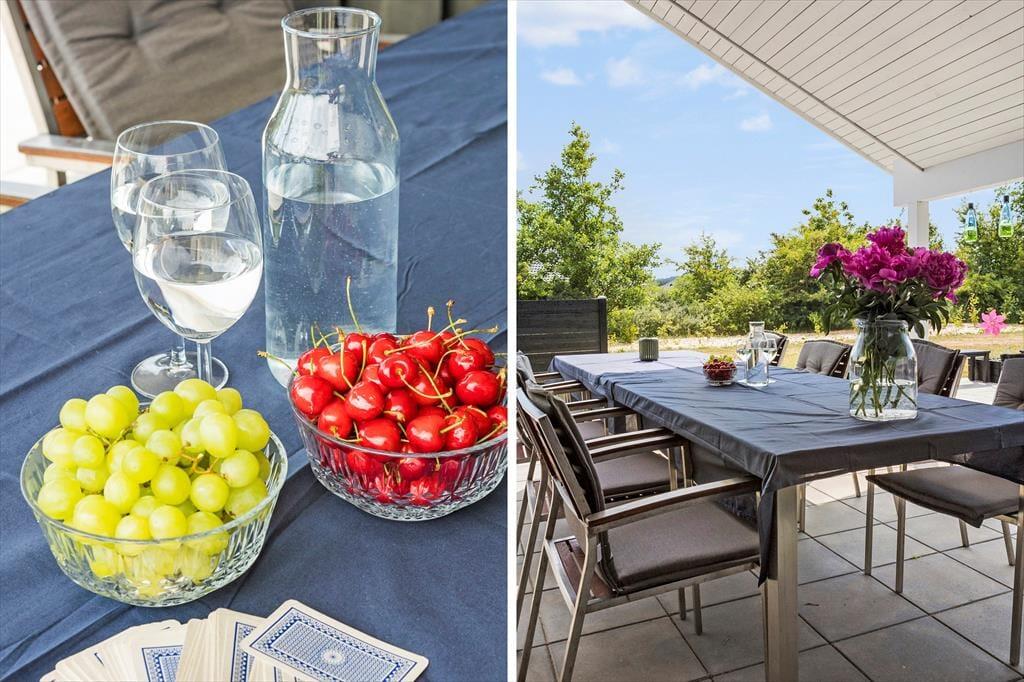 Et stort fliseareal breder sig rundt om sommerhuset, så I har flere gode opholdspladser at vælge imellem – heriblandt en overdækket terrasse, hvor I kan finde skygge fra solen, hvis det bliver nødvendigt. Grunden er stor og enkelt anlagt med græsplæne og randbeplantning, og I kan sagtens blive her for at lege og spille havespil. Det kan nu også bestemt anbefales at smutte ned for enden af vejen, hvor Tranum Feriebys kæmpestore fællesareal byder på mange sjove aktiviteter for hele familien.
