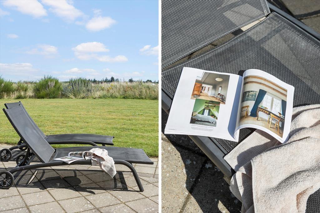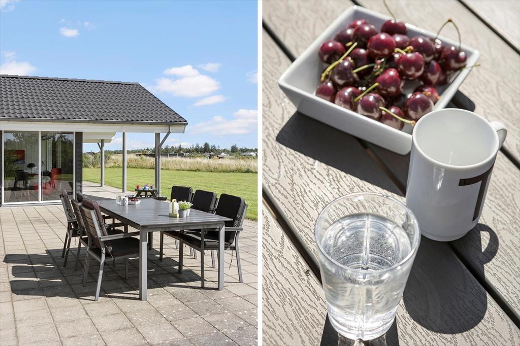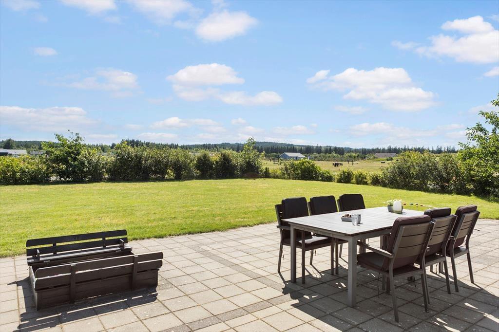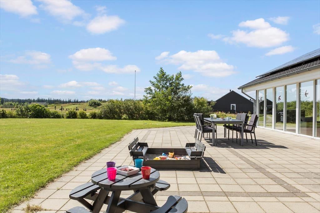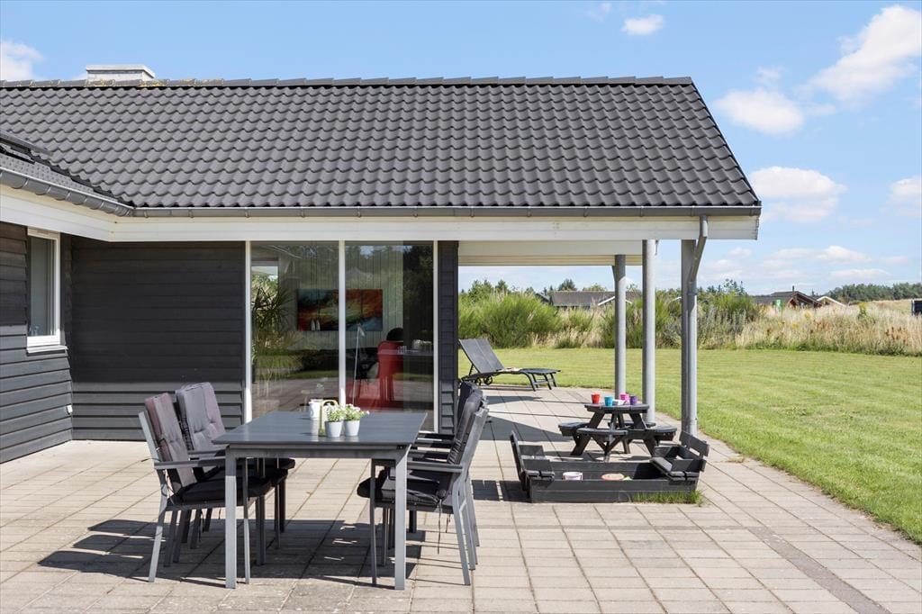 Sommerhuset ligger på en plan naturgrund med alle muligheder for at nyde den danske sommer og solen fuldt ud. Der er en 250m2 stor terrasse rundt om hele sommerhuset; de 100m2 heraf er overdækket, så uanset vindforhold, kan man sidde ude og nyde lækre grillmåltider og udnytte de lange, lune aftener. Umiddelbart op til grunden ligger et stort legeområde med forskellige former for boldspil og mange flere sjove aktiviteter.