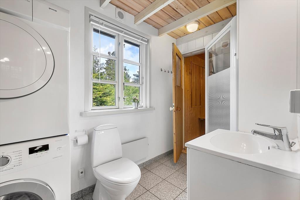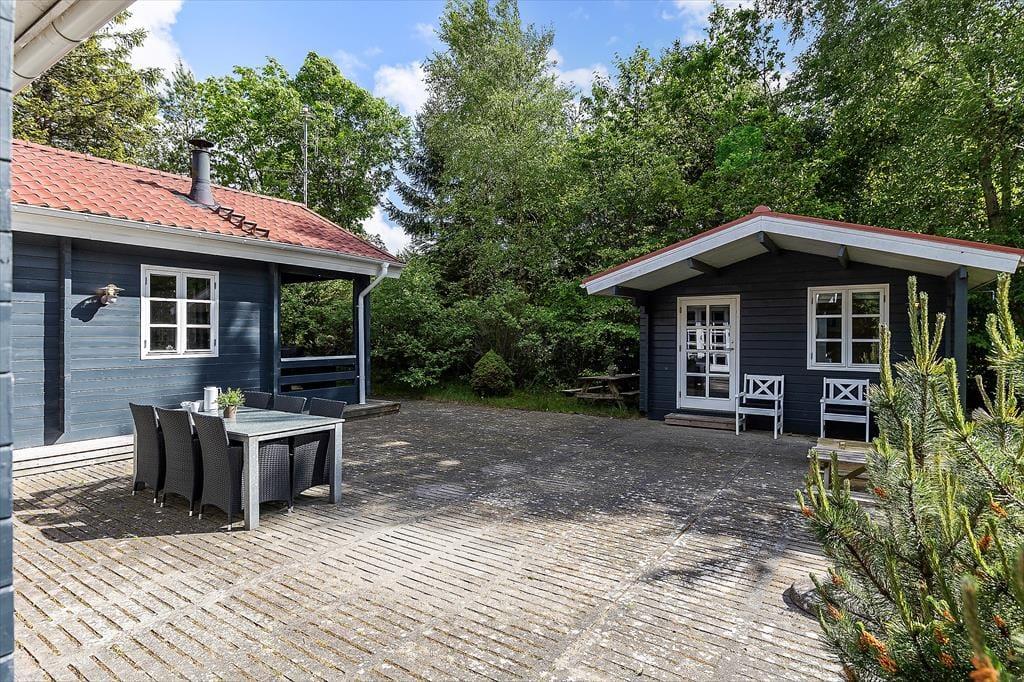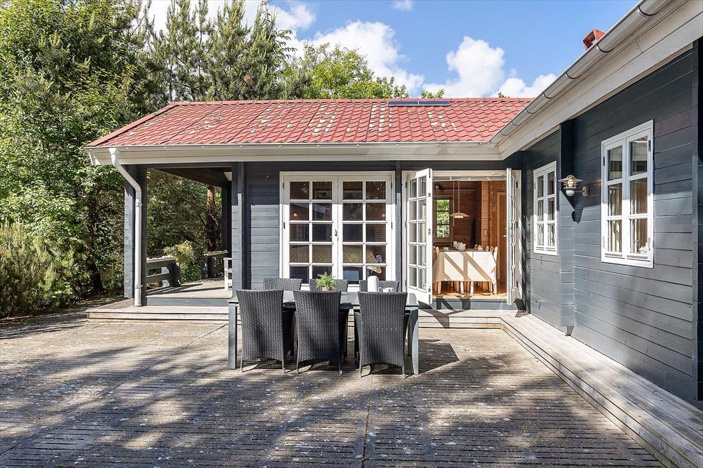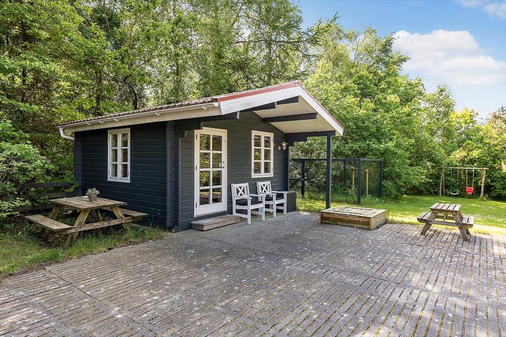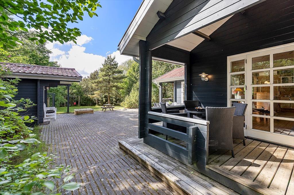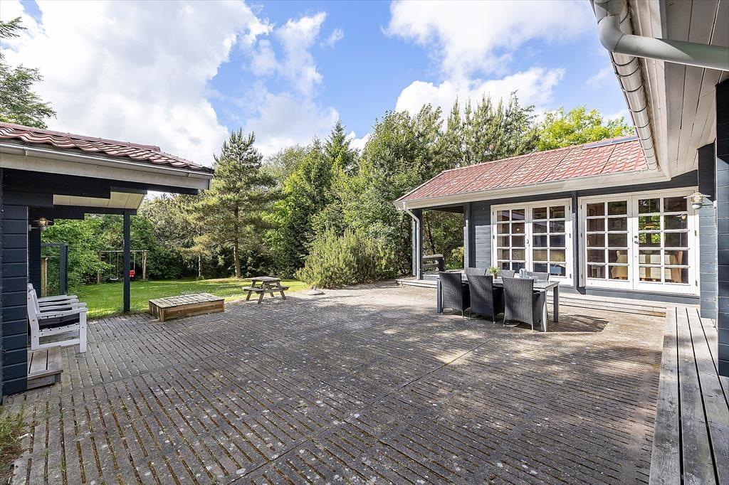 I forlængelse af sommerhuset er der to overdækkede terrasseområder, men hvis du foretrækker at sidde helt ude under åben himmel, er der masser af plads til solbadning, grill og tilbagelænet driverliv på det flisebelagte terrasseområde. En dejlig græsplæne breder sig desuden i læ af grundens randbeplantning, og her har du masser af plads til at lege og spille bold med familien. Børnene kan for øvrigt hygge sig i sandkassen og på gyngerne, så de vil sikkert også blive glade for at opholde sig her i den grønne og ugenerede oase.