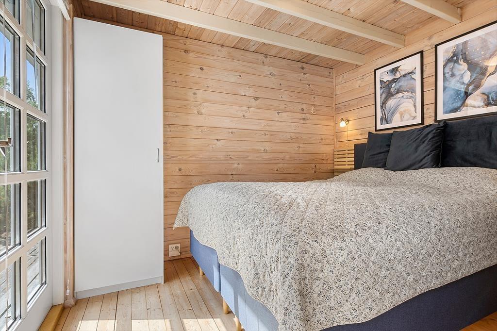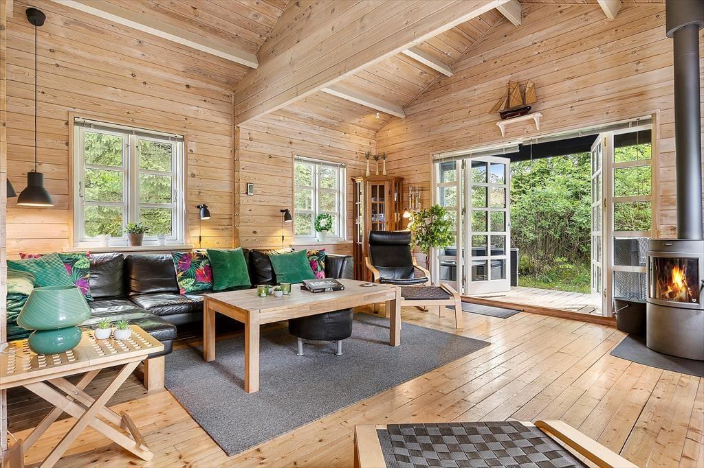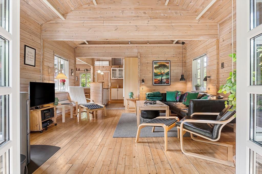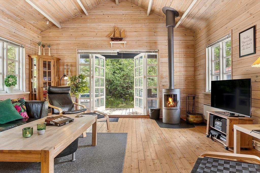 Med loft til kip, lys træbeklædning og brændeovn er sommerhusets opholdsrum sådan et, du straks kan føle dig hjemme i. Der er en komfortabel sofa og lænestole, når det er tid til at flade ud med bøger eller en god film på fladskærmen, og ved spisebordet nær det åbne køkken, kan du samles med dine kære til lækre måltider, brætspil og gode grin. Saunaen, der ligger i forlængelse af badeværelset, er perfekt, når du trænger til at slappe helt af i kroppen og lade feriefreden indfinde sig. Når det er sengetid, er der to soveværelser til rådighed, og derudover kan de to hemse og annekset også bruges til overnatning. Bemærk dog, at sovepladserne på hemsene egner sig bedst til børn og unge.